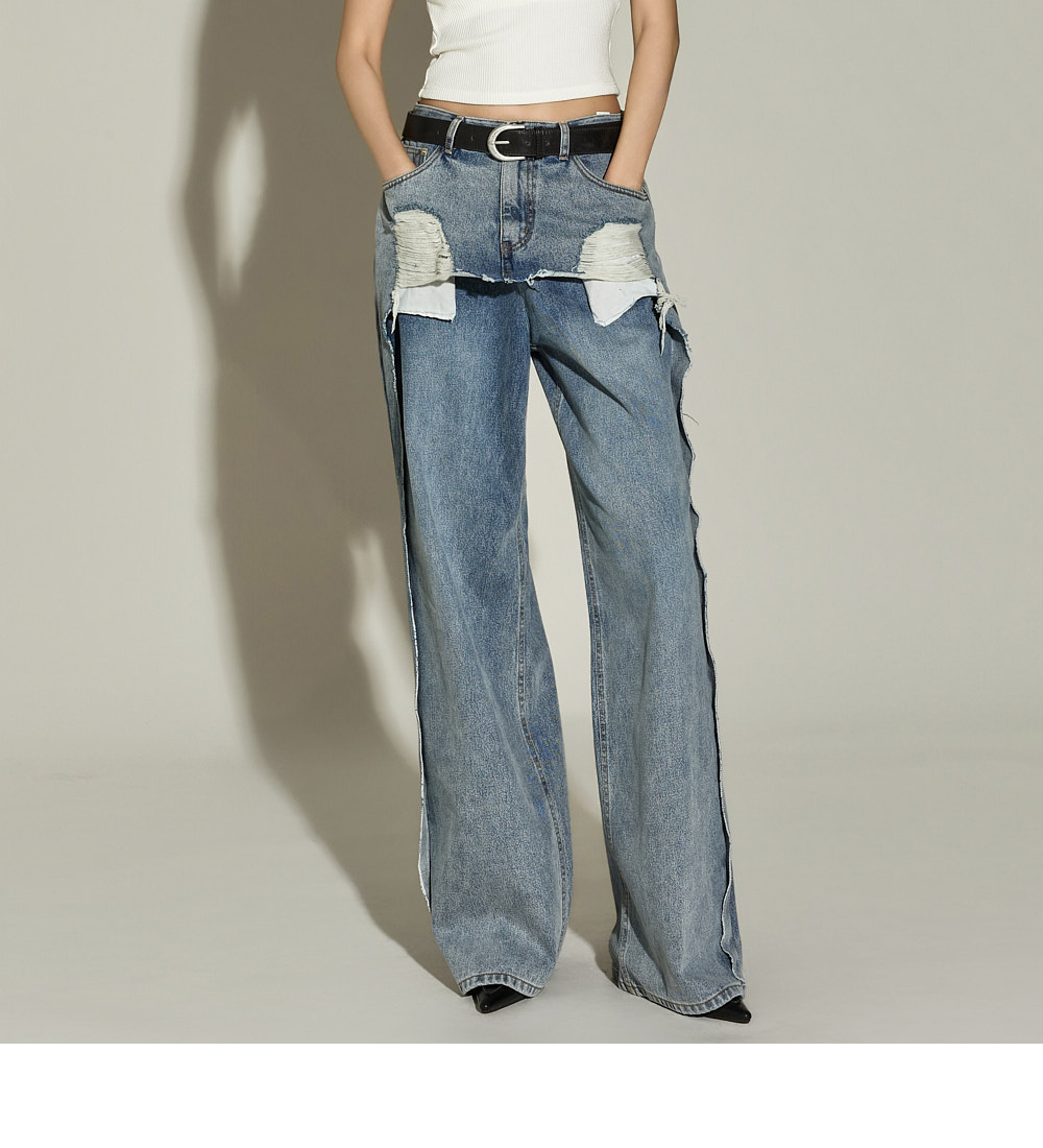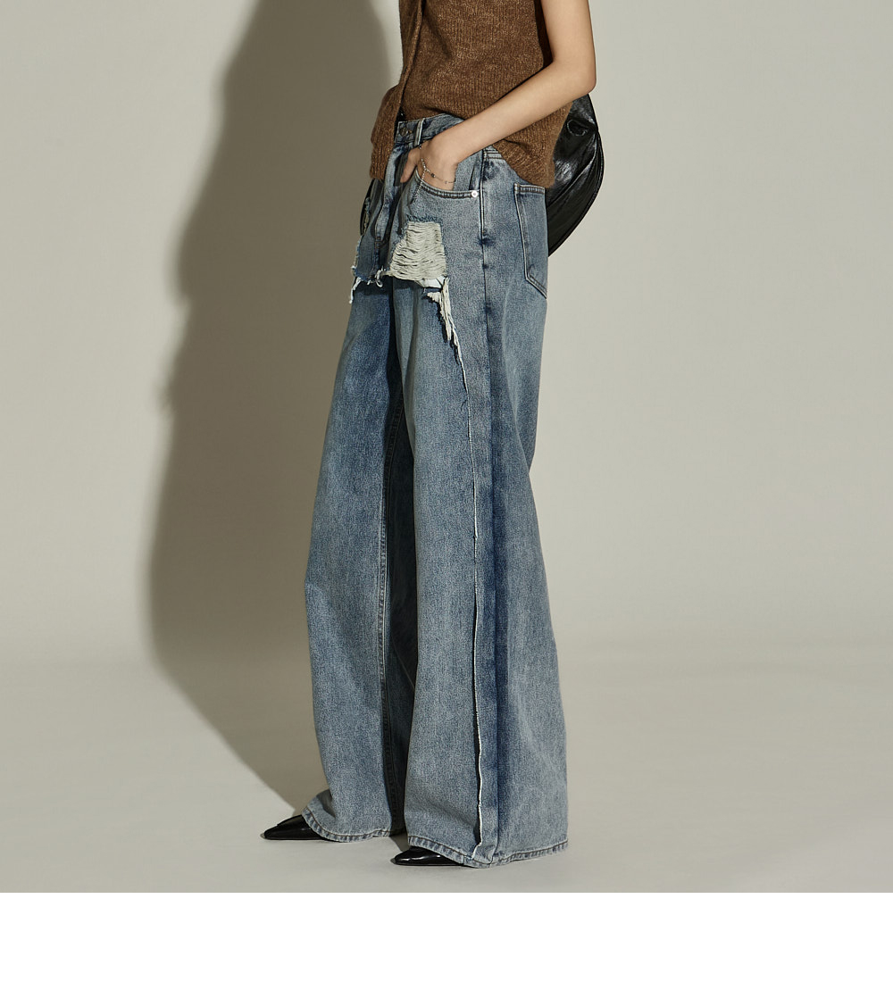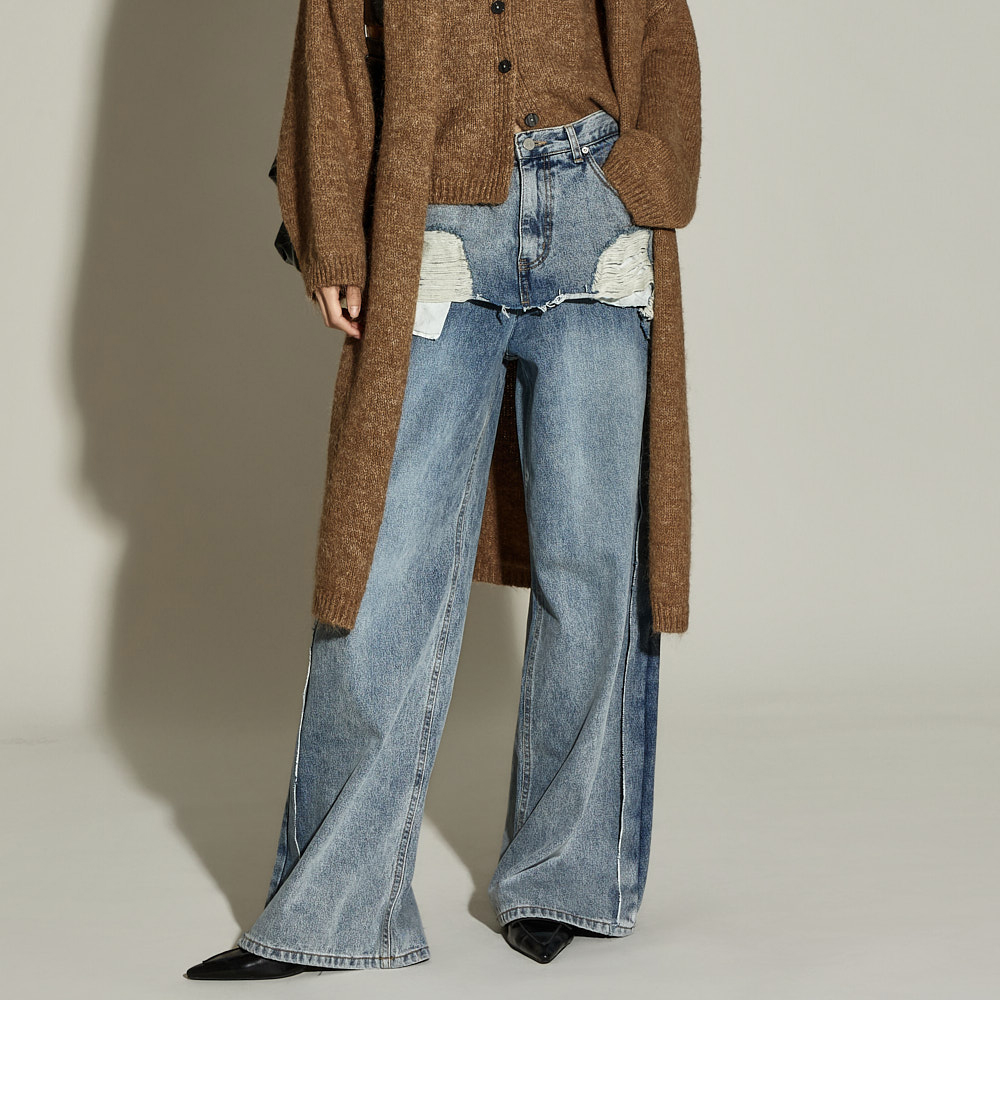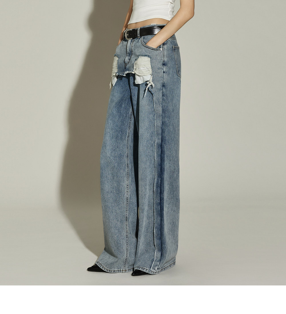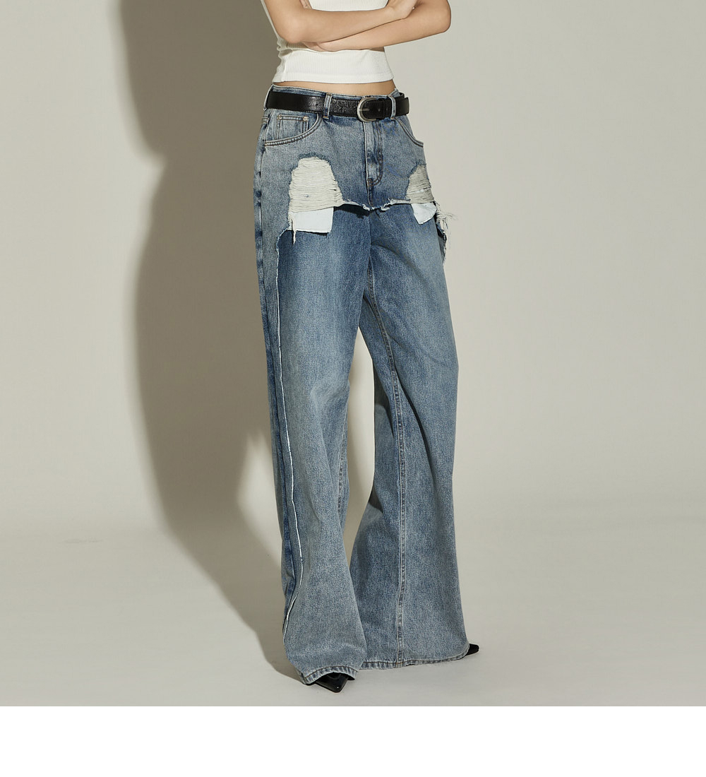 独特风格的牛仔裤。 采用坚挺的棉质面料制成,提供稳固的穿着感,宽松版型与长裤设计营造时尚轮廓。 低腰设计增添个性氛围,不对称细节与自然裁剪点缀出独特感,加上破洞牛仔特有的复古魅力,更能展现独特风格。 是打造时尚个性造型的理想单品,即使搭配简约上衣,也能成为亮眼的造型重点。 171CM 模特穿 S 码,BLUE 颜色。