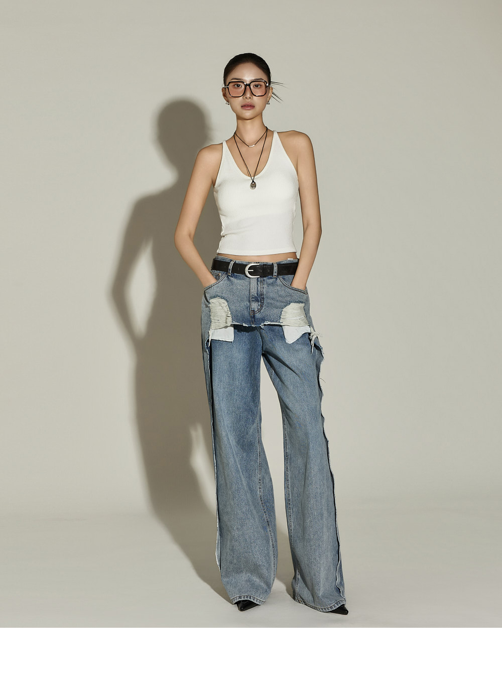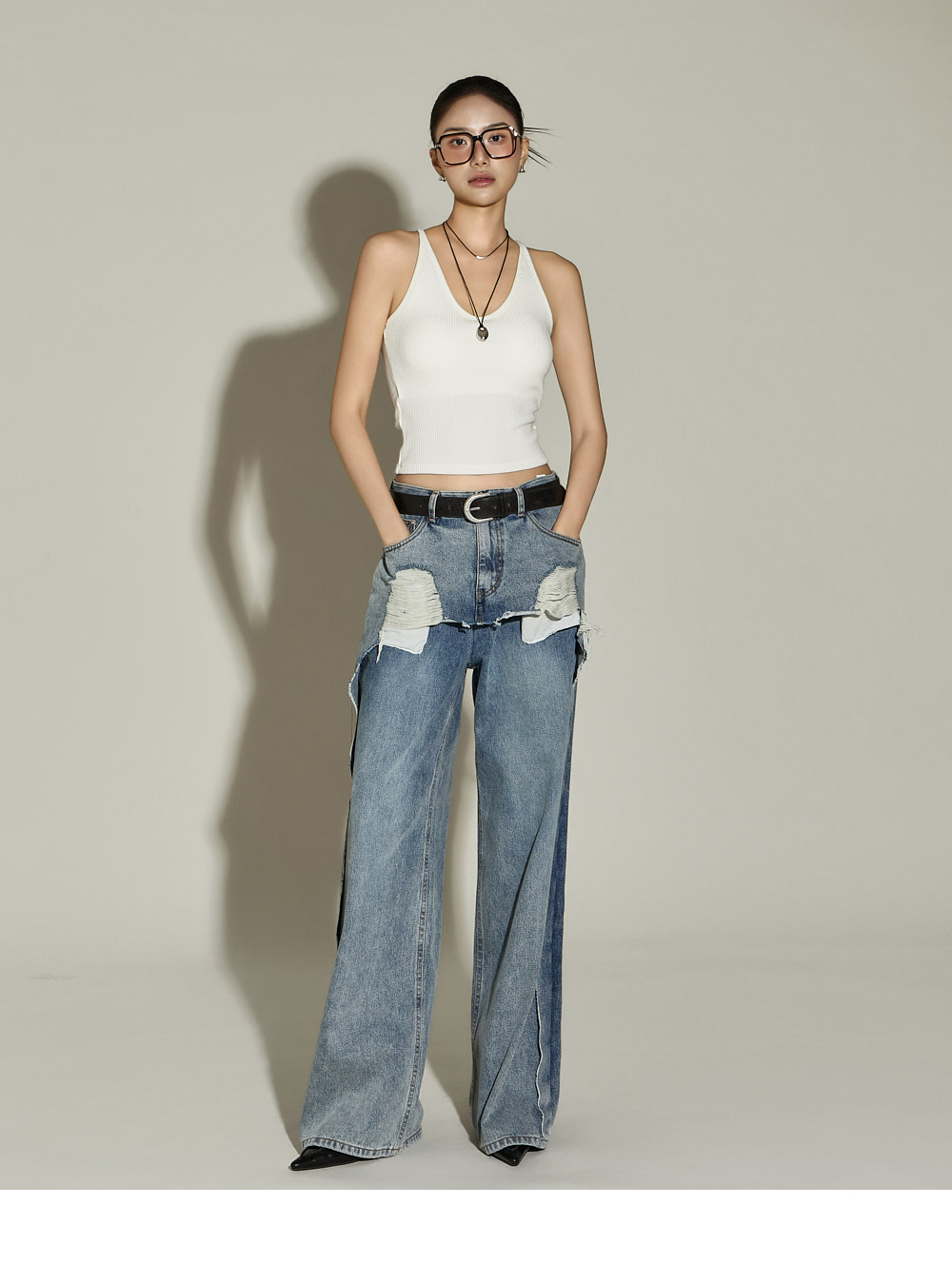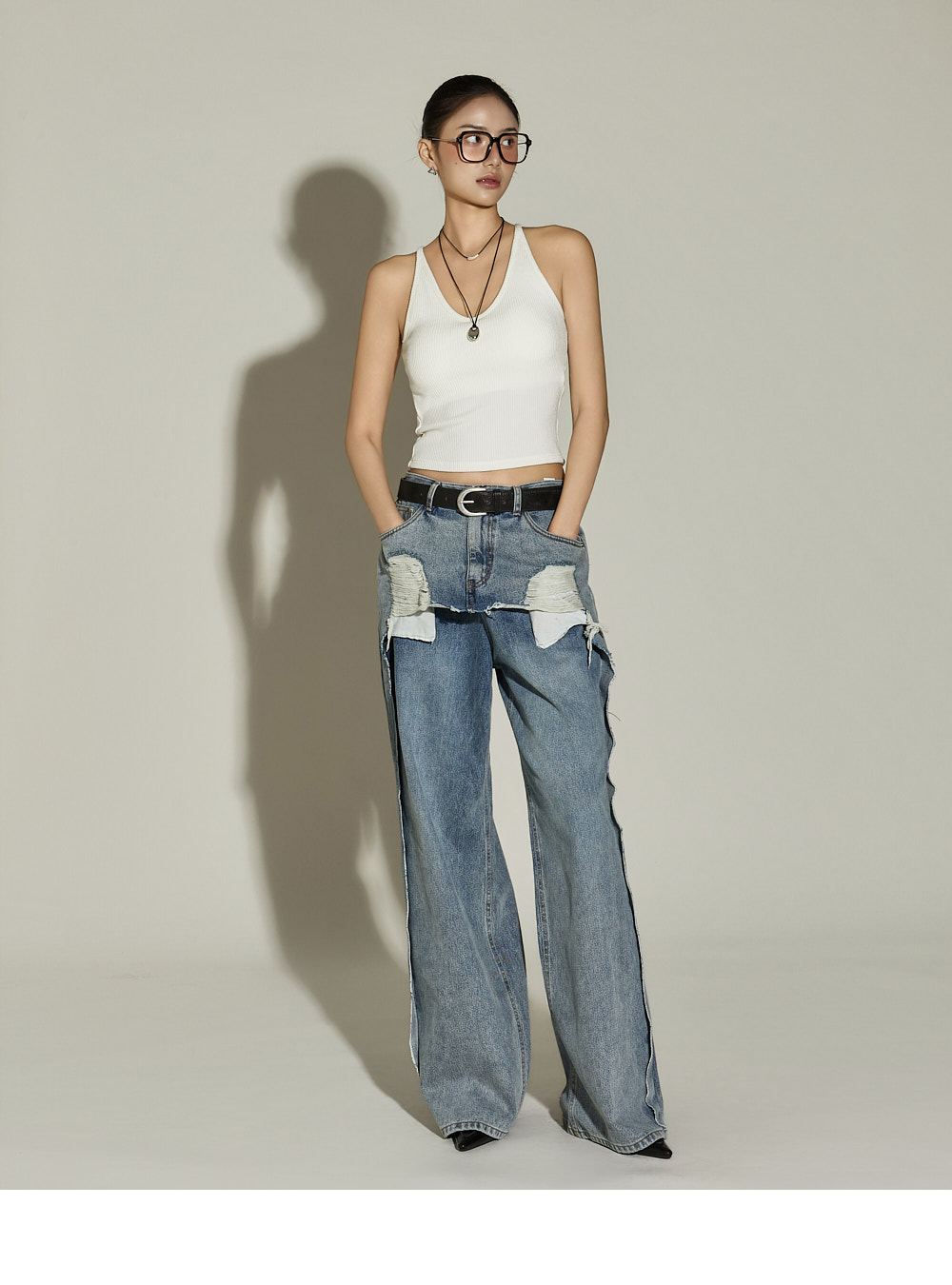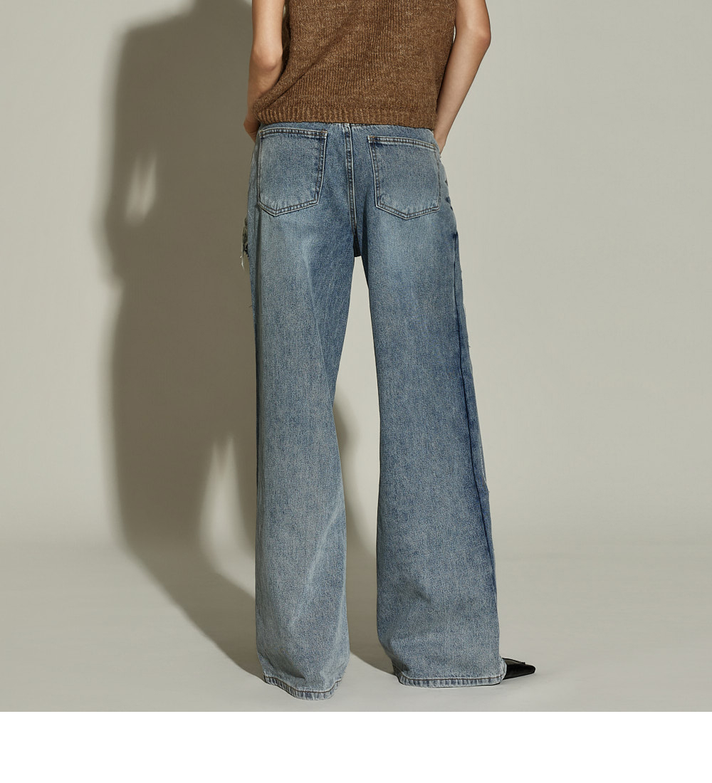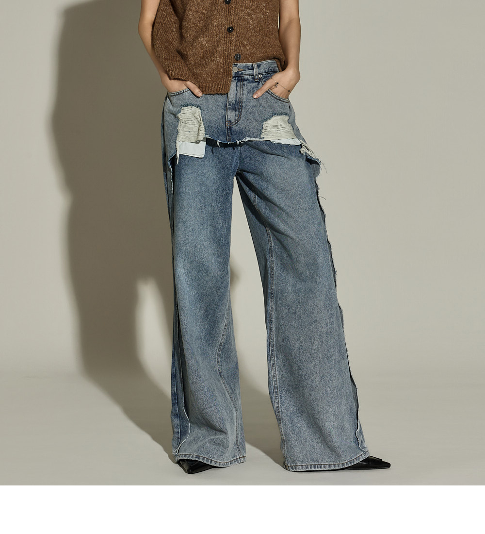 独特风格的牛仔裤。 采用坚挺的棉质面料制成,提供稳固的穿着感,宽松版型与长裤设计营造时尚轮廓。 低腰设计增添个性氛围,不对称细节与自然裁剪点缀出独特感,加上破洞牛仔特有的复古魅力,更能展现独特风格。 是打造时尚个性造型的理想单品,即使搭配简约上衣,也能成为亮眼的造型重点。 171CM 模特穿 S 码,BLUE 颜色。