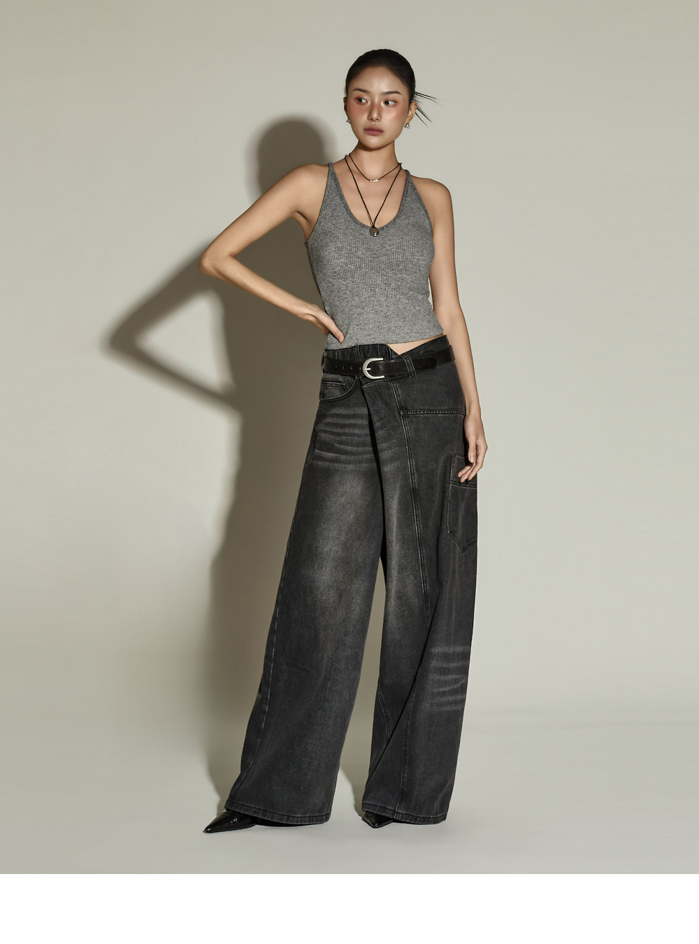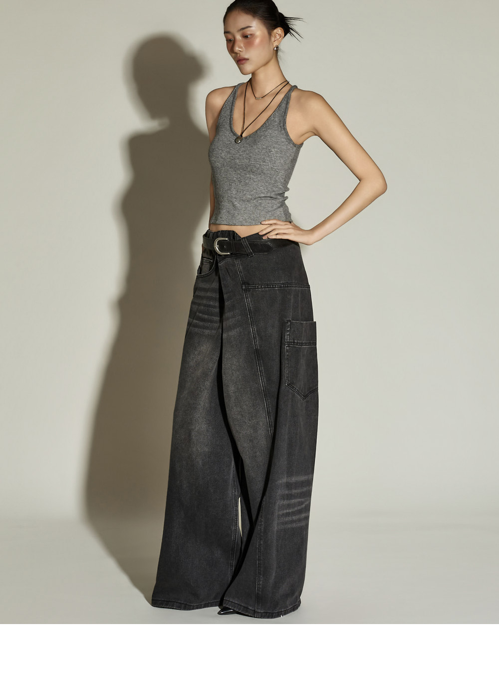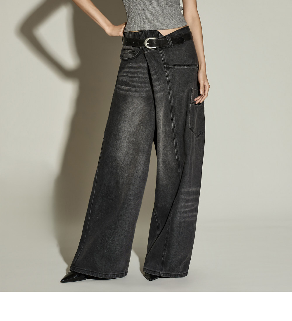 休闲风格的裹身宽腿牛仔裤。采用棉、聚酯纤维与黏纤混纺材质制作,兼具坚挺与柔软的穿着感。宽松裤型有效修饰腿部线条;半侧松紧腰带与腰部纽扣可调节设计,打造符合体型的稳妥贴合感。前排纽扣开合方便穿脱;配备前口袋、工装口袋及后口袋,提升实用性。独特裹身设计为基础造型增添亮点,是一条高实用性的日常牛仔裤。171CM 模特穿着 ONE 尺码,黑色。