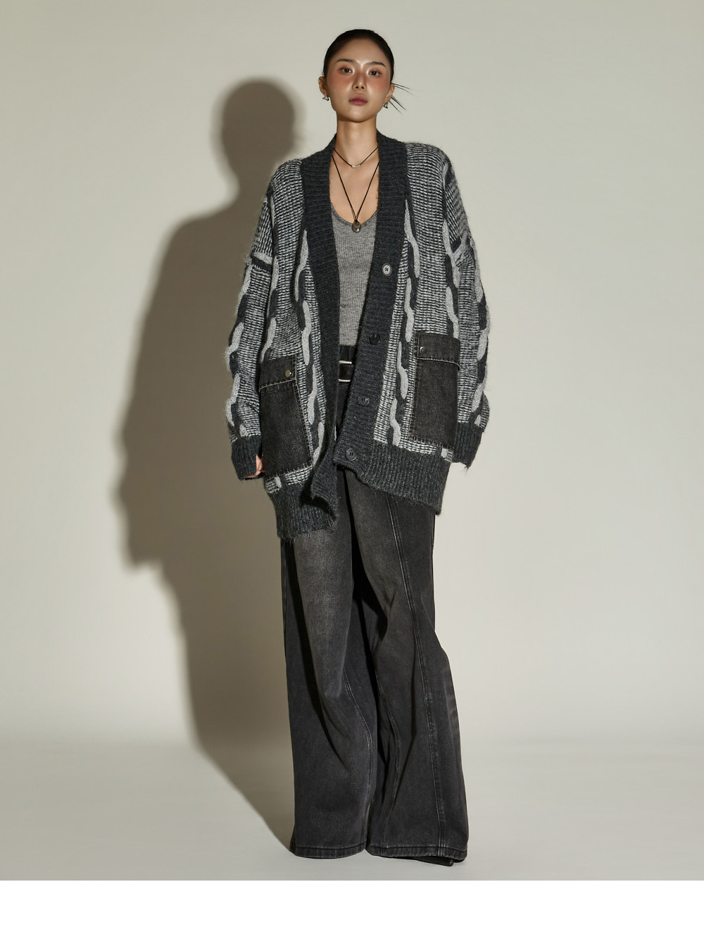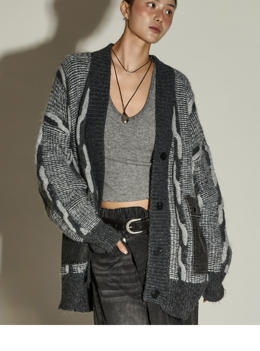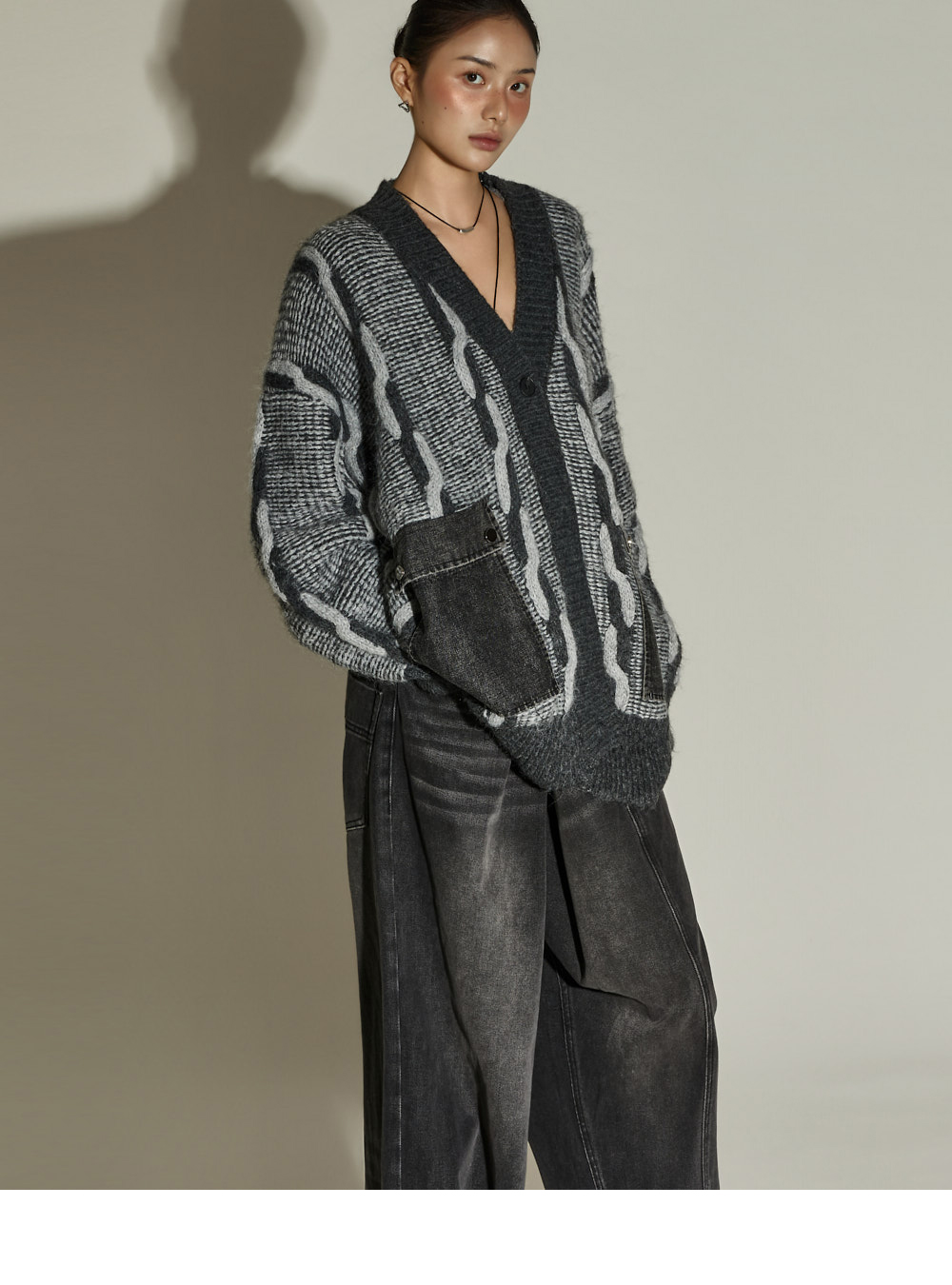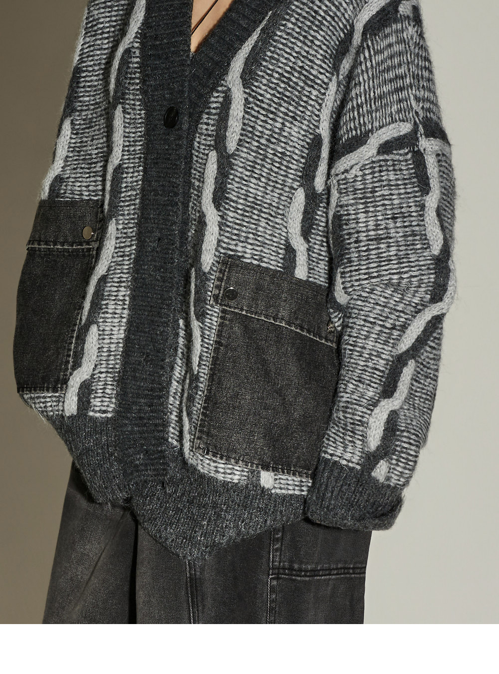 独特风格针织开衫。 采用腈纶、尼龙与安哥拉混纺材质制作, 柔软温暖,穿着舒适, ONE尺码设计,宽松随性。 宽松版型搭配麻花针织拼接,增添设计感, 前侧两大牛仔口袋兼具独特与实用魅力。 前襟纽扣设计,穿脱方便, 弹性良好,活动自如。 秋季可单穿,也可作为内搭层叠穿着, 推荐作为打造秋季独特造型的开衫。 171CM 模特,ONE 尺码,GRAY MIX 色。