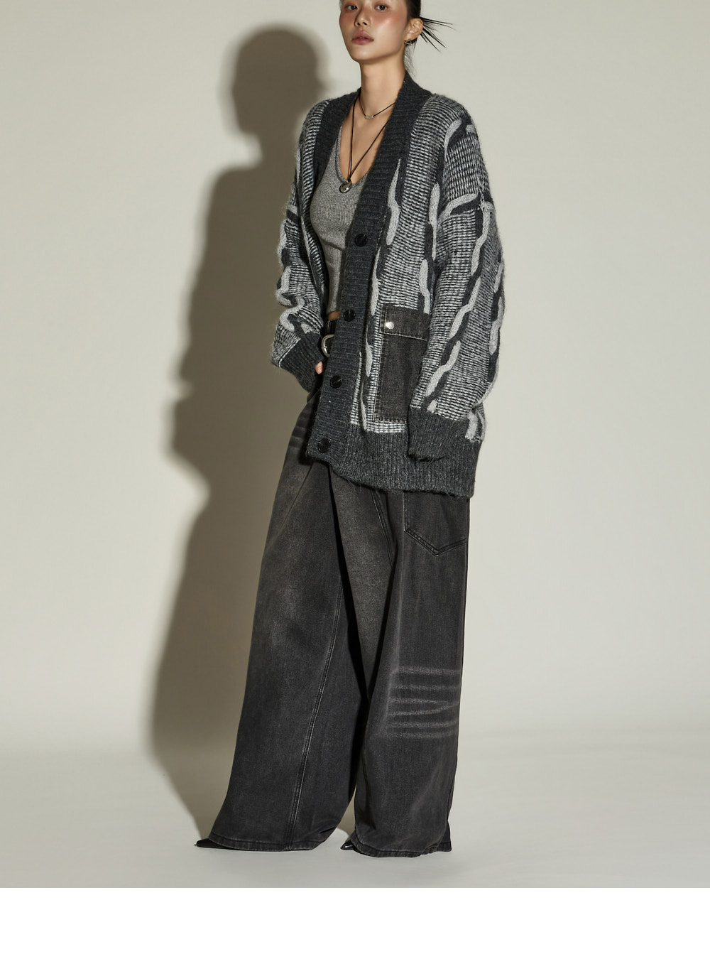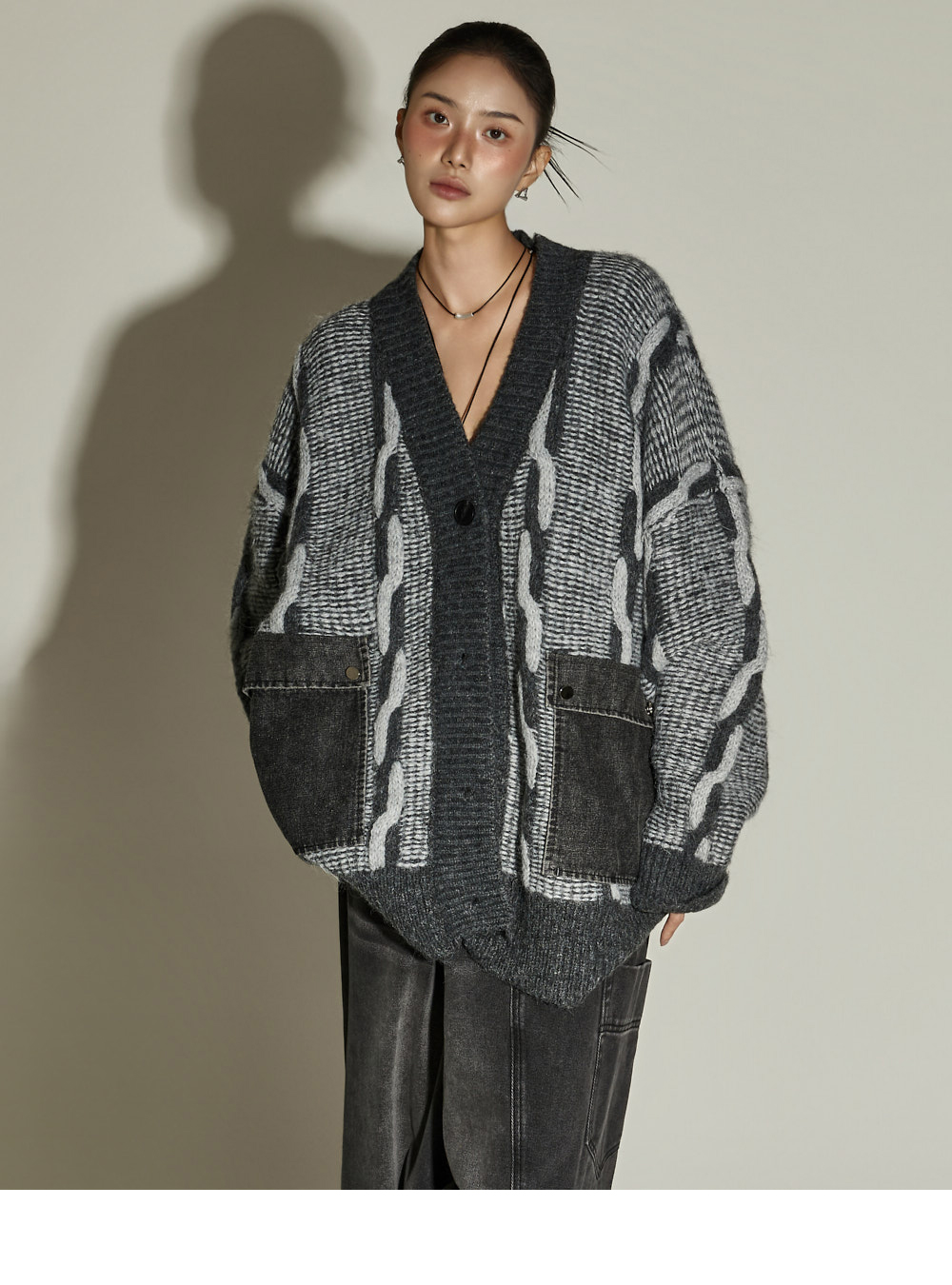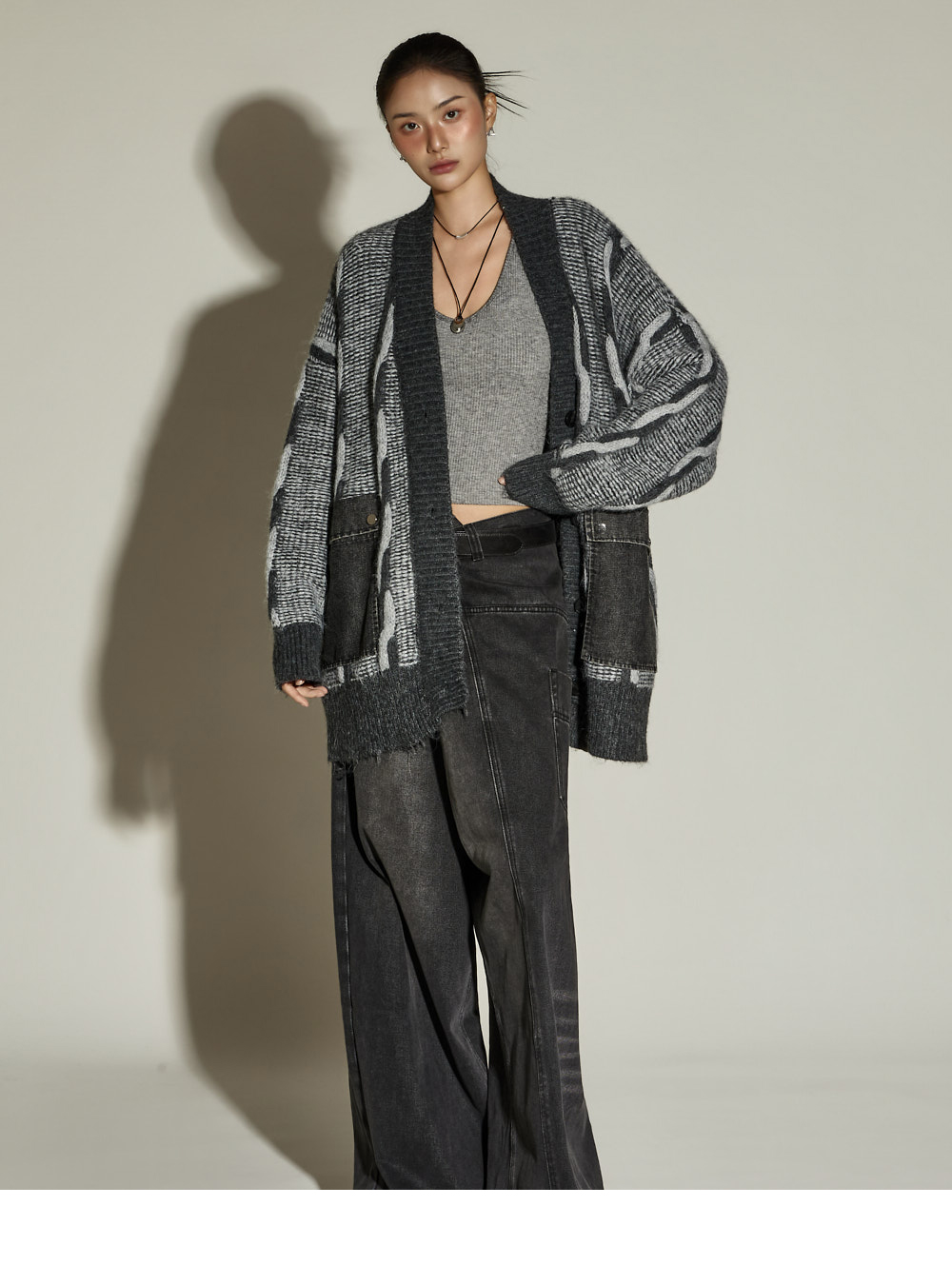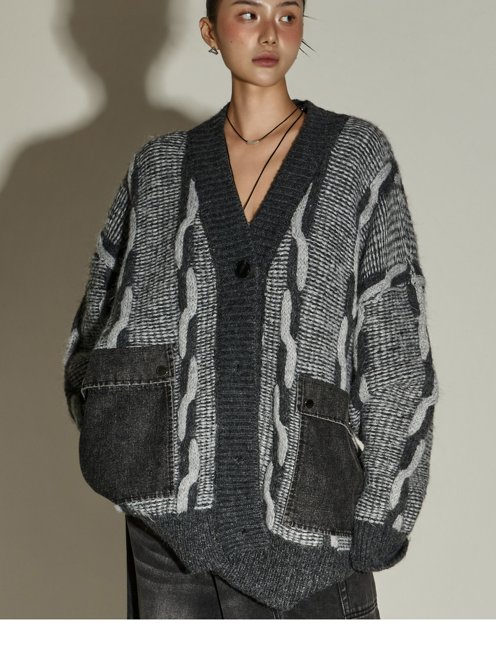 独特风格针织开衫。 采用腈纶、尼龙与安哥拉混纺材质制作, 柔软温暖,穿着舒适, ONE尺码设计,宽松随性。 宽松版型搭配麻花针织拼接,增添设计感, 前侧两大牛仔口袋兼具独特与实用魅力。 前襟纽扣设计,穿脱方便, 弹性良好,活动自如。 秋季可单穿,也可作为内搭层叠穿着, 推荐作为打造秋季独特造型的开衫。 171CM 模特,ONE 尺码,GRAY MIX 色。