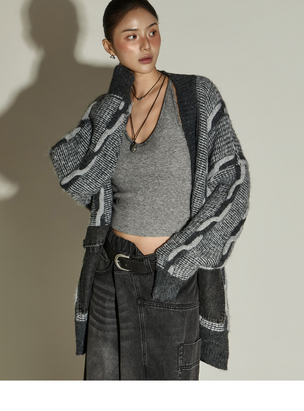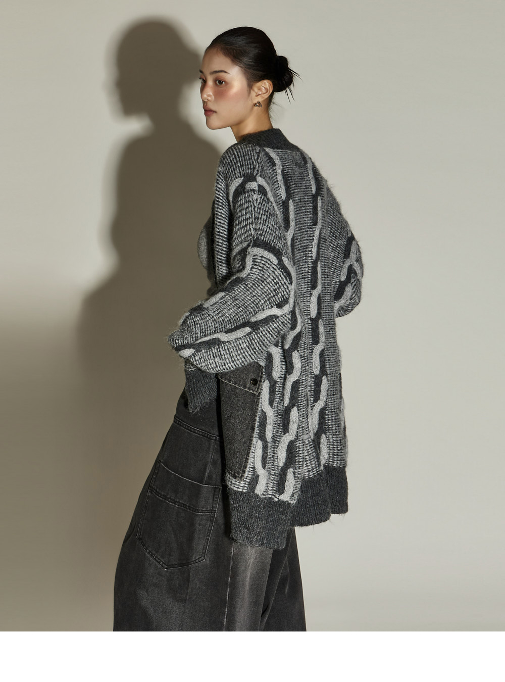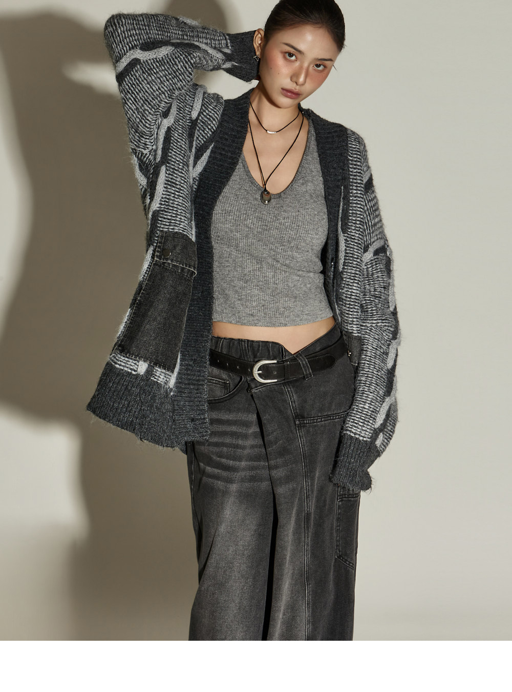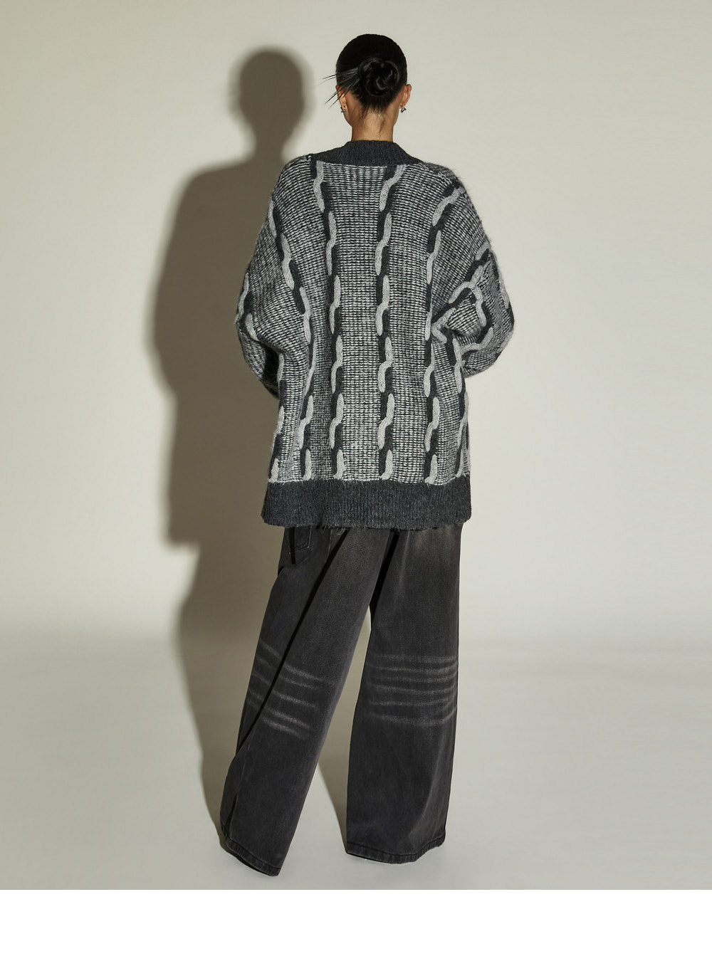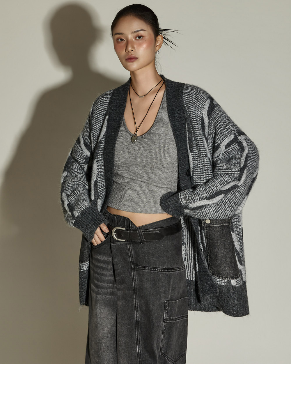 独特风格针织开衫。 采用腈纶、尼龙与安哥拉混纺材质制作, 柔软温暖,穿着舒适, ONE尺码设计,宽松随性。 宽松版型搭配麻花针织拼接,增添设计感, 前侧两大牛仔口袋兼具独特与实用魅力。 前襟纽扣设计,穿脱方便, 弹性良好,活动自如。 秋季可单穿,也可作为内搭层叠穿着, 推荐作为打造秋季独特造型的开衫。 171CM 模特,ONE 尺码,GRAY MIX 色。