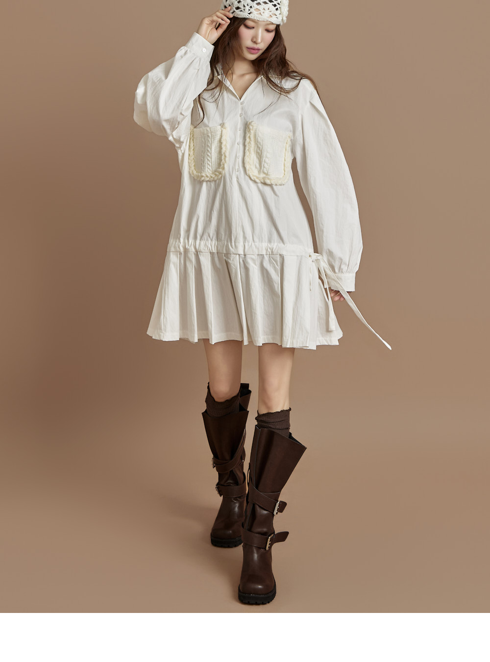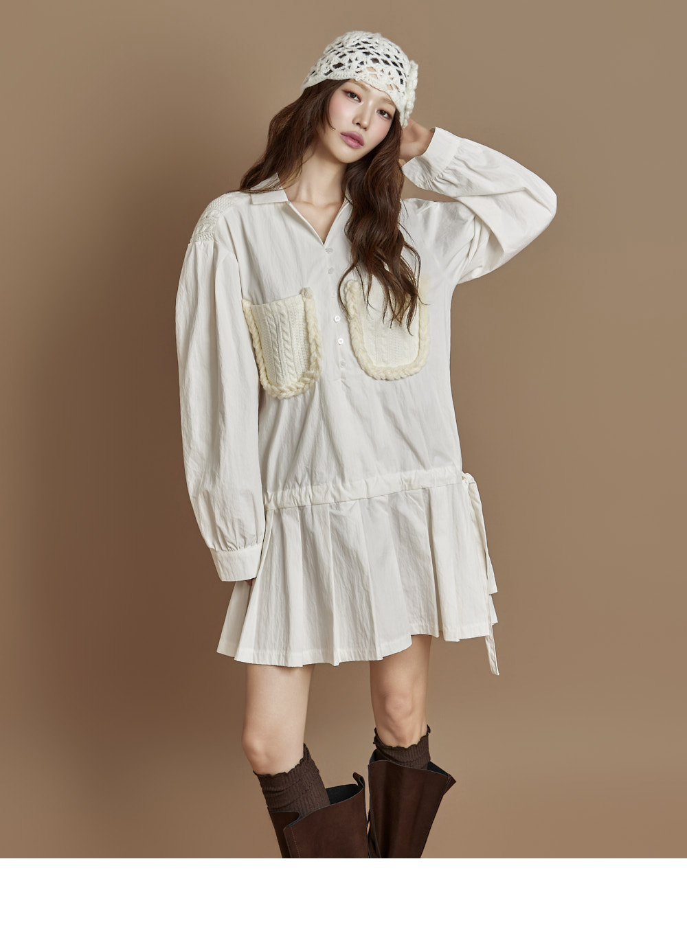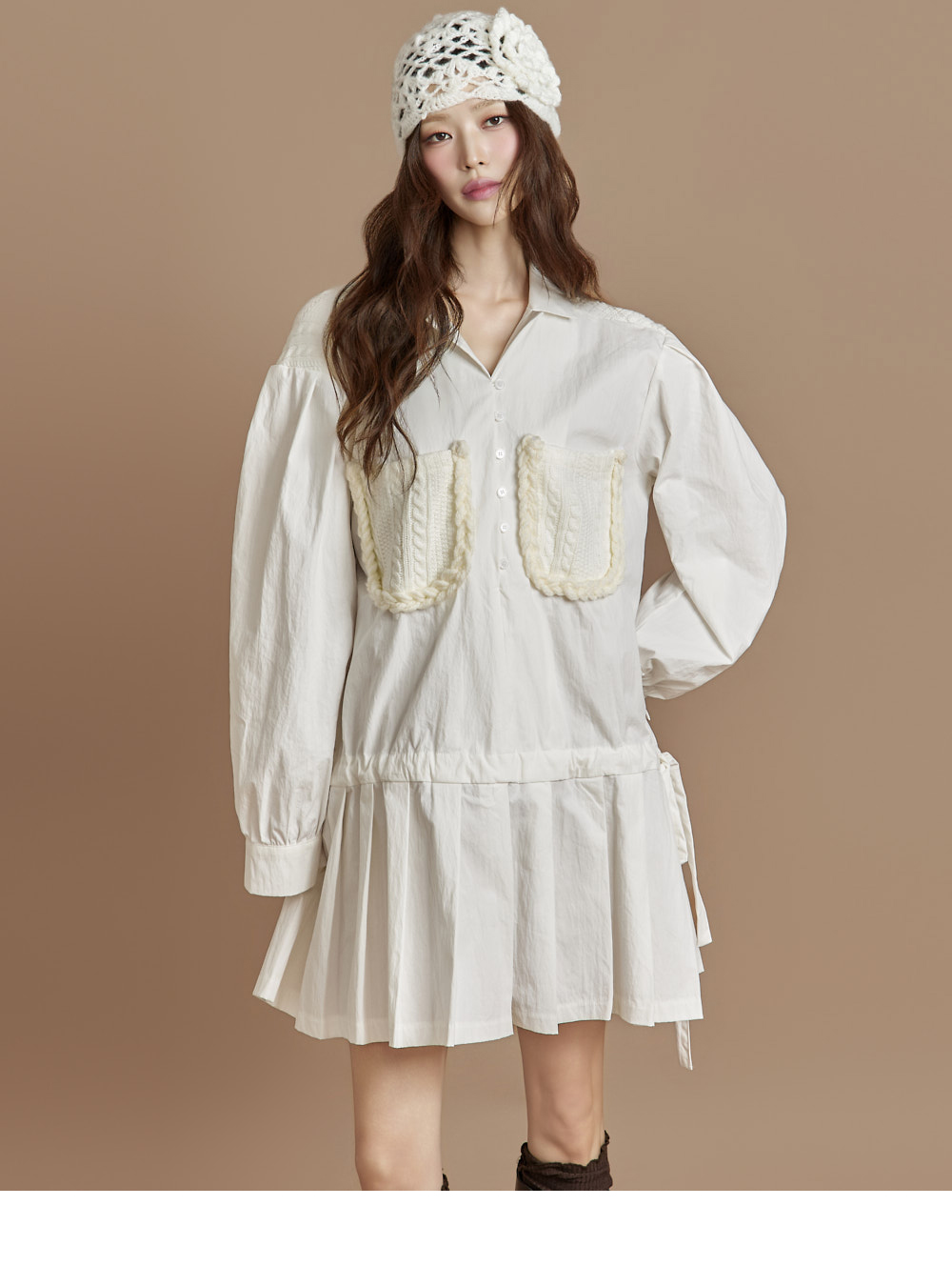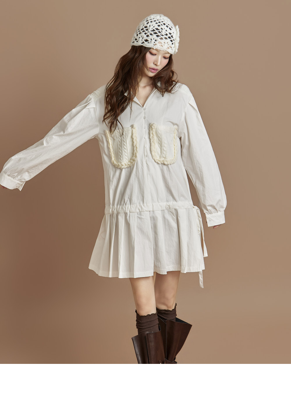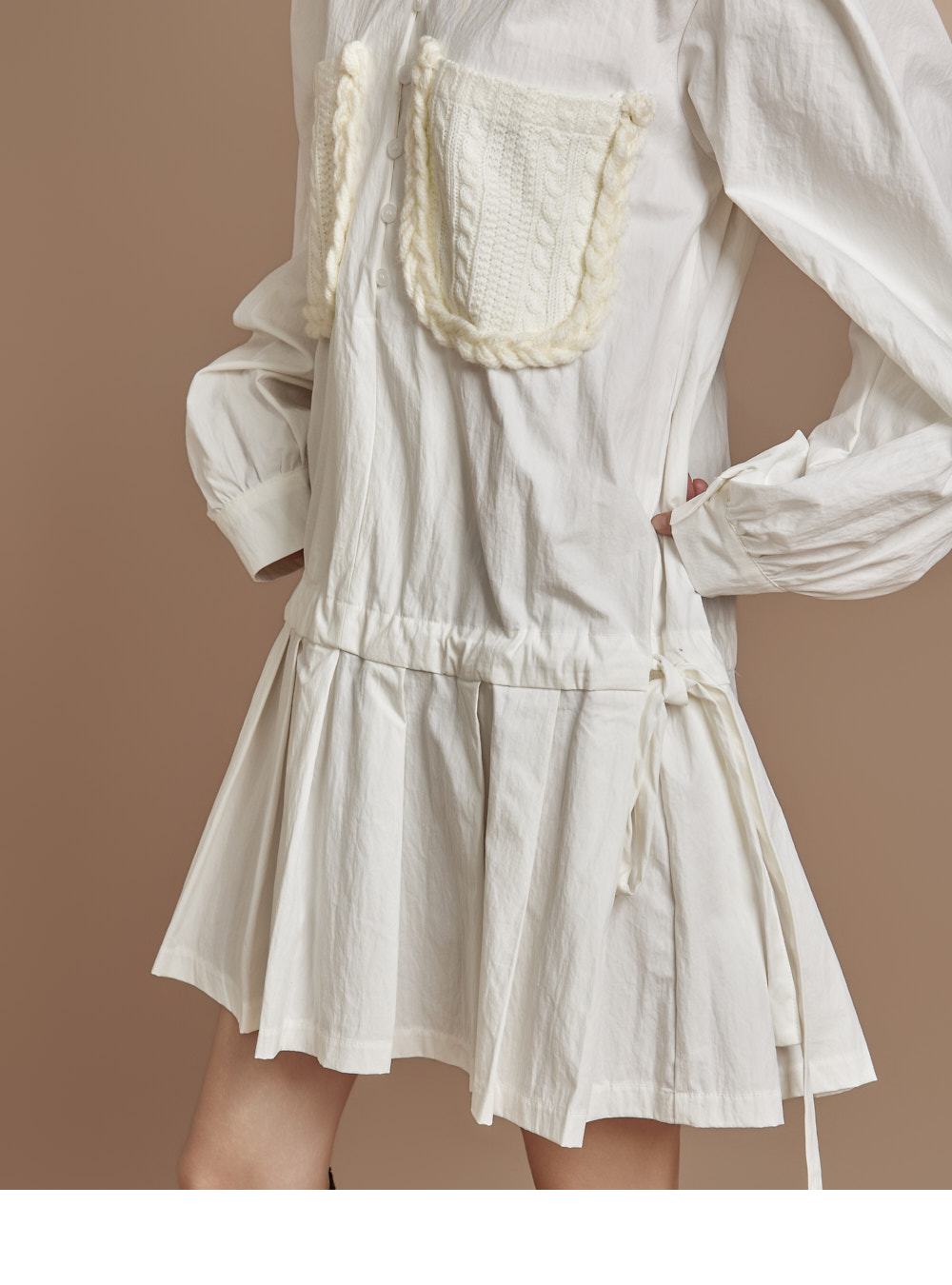 一款可爱氛围的迷你连衣裙。 采用棉与尼龙混纺面料制作,兼具挺括感与舒适穿着感,ONE 尺码设计,任何人都能轻松驾驭。 下摆加入百褶细节,打造可爱的轮廓,迷你长度增添活泼气息。 胸部口袋处采用针织拼接作为亮点,展现独特细节,前襟纽扣设计与腰部束带可根据身形调节,打造更修身的版型。 单穿即可呈现可爱且完整的造型,也可搭配多种外套,轻松打造符合季节的穿搭,是高实用性的单品。 171CM 模特穿着 ONE 尺码,颜色为 WHITE。