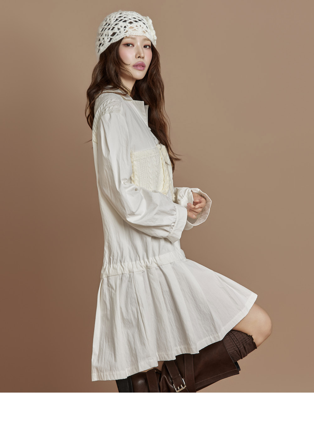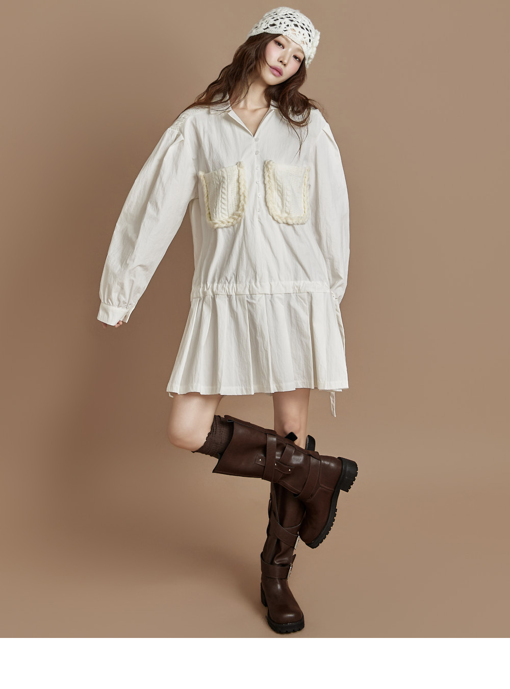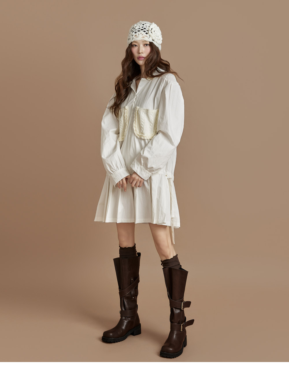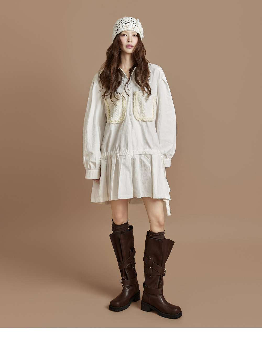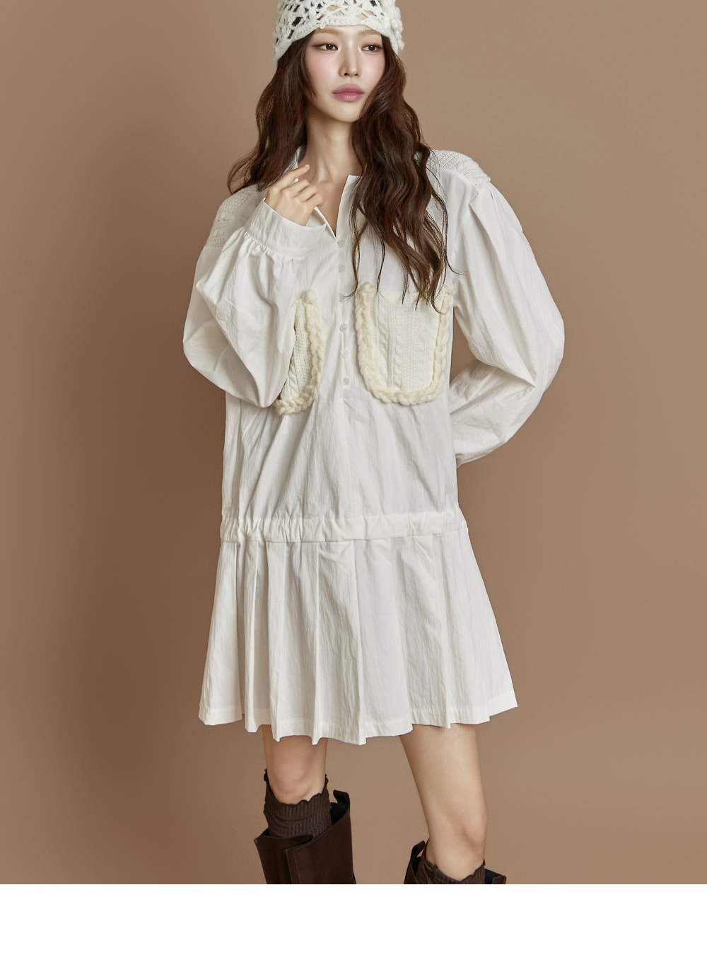 一款可爱氛围的迷你连衣裙。 采用棉与尼龙混纺面料制作,兼具挺括感与舒适穿着感,ONE 尺码设计,任何人都能轻松驾驭。 下摆加入百褶细节,打造可爱的轮廓,迷你长度增添活泼气息。 胸部口袋处采用针织拼接作为亮点,展现独特细节,前襟纽扣设计与腰部束带可根据身形调节,打造更修身的版型。 单穿即可呈现可爱且完整的造型,也可搭配多种外套,轻松打造符合季节的穿搭,是高实用性的单品。 171CM 模特穿着 ONE 尺码,颜色为 WHITE。