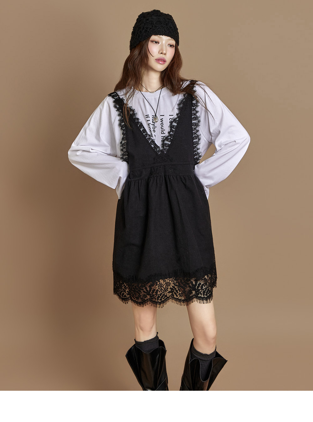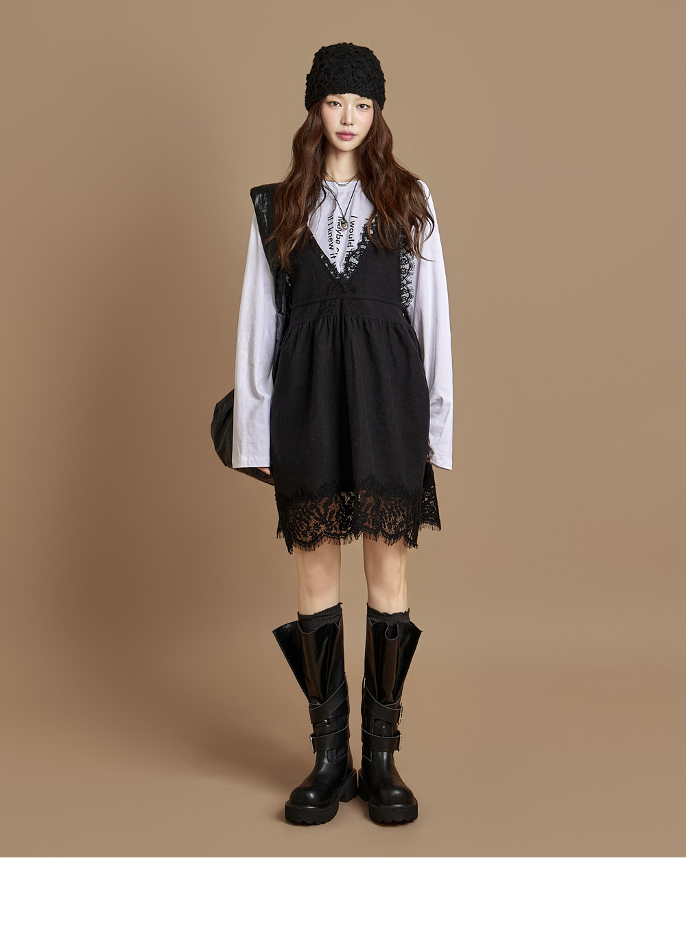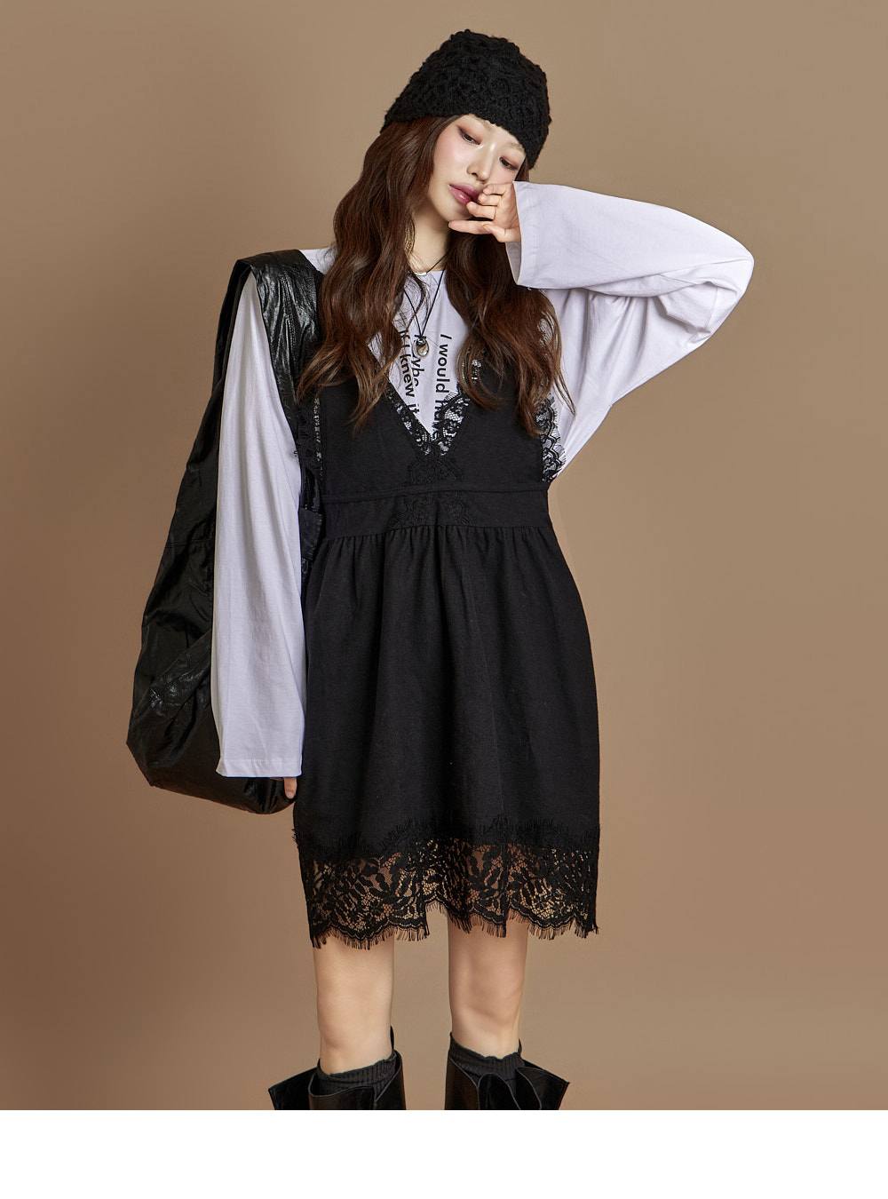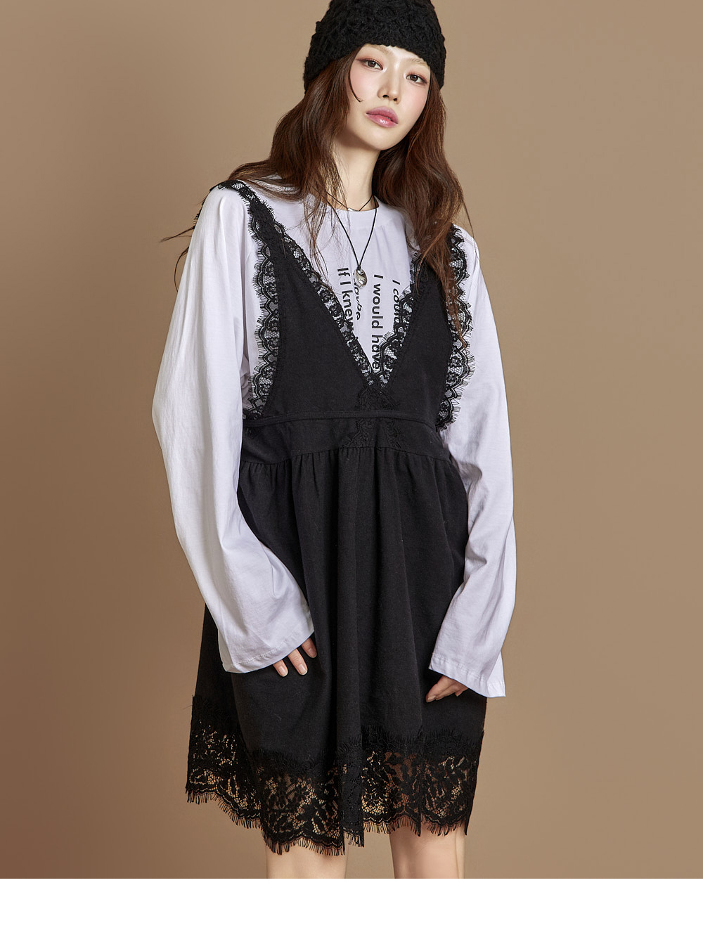 一款休闲风格的蕾丝迷你连衣裙。 采用纯棉面料制作,穿着舒适,胸前蝴蝶结肩带与背部深V设计成为亮点,不仅可单穿,也可与多种内搭叠穿。 整体宽松垂落的版型与蕾丝细节,增添可爱氛围,是充满魅力的单品。 171CM 模特穿着 ONE 尺码,颜色为 BLACK。