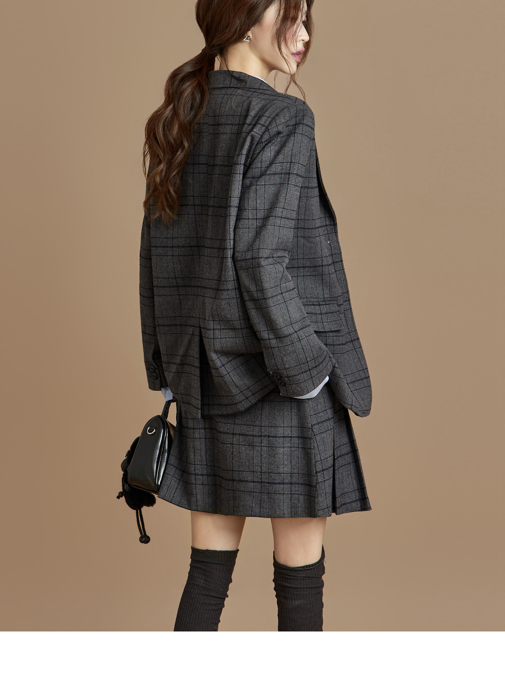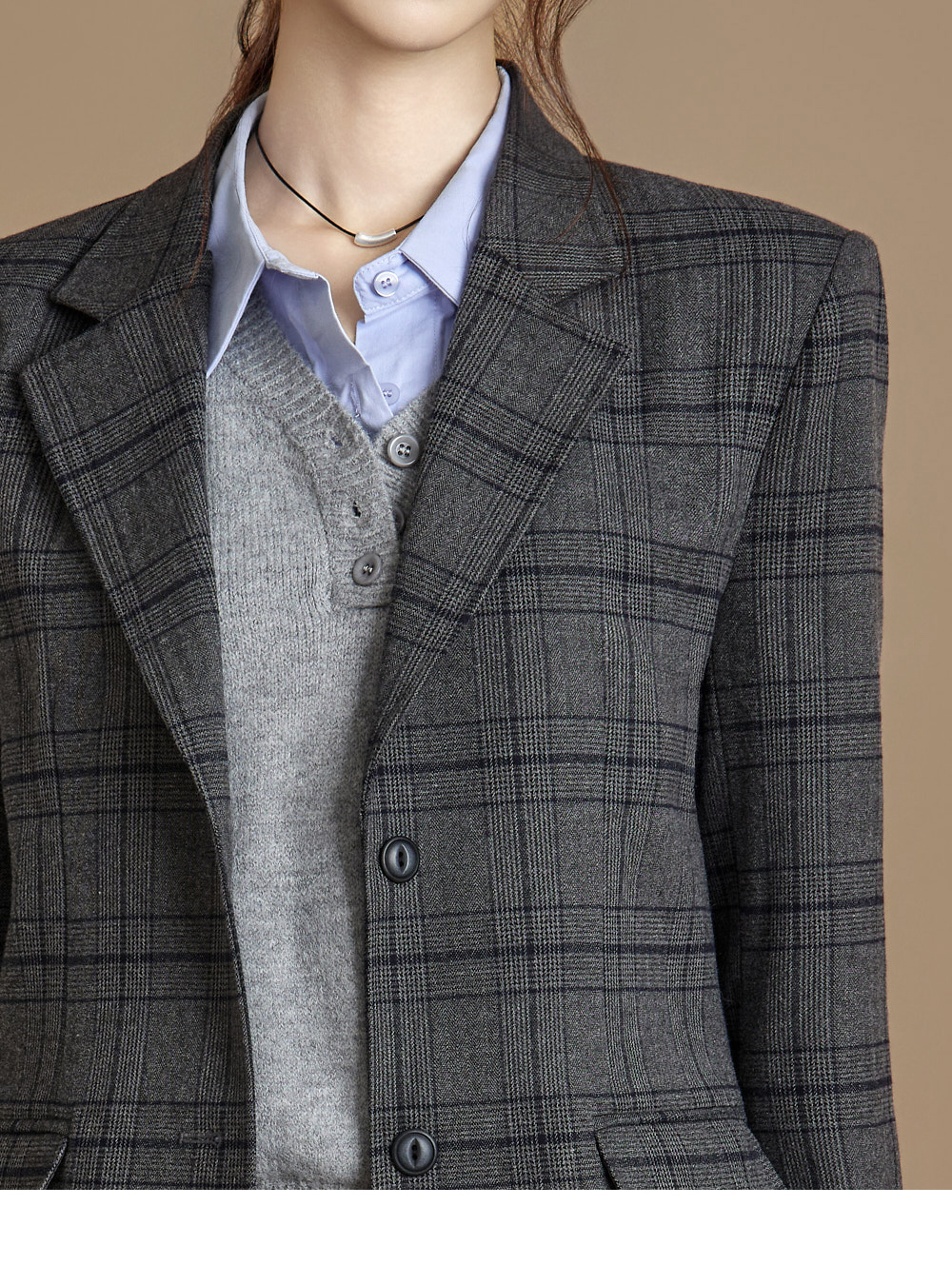前襟与袖口纽扣细节及格纹拼接为亮点,