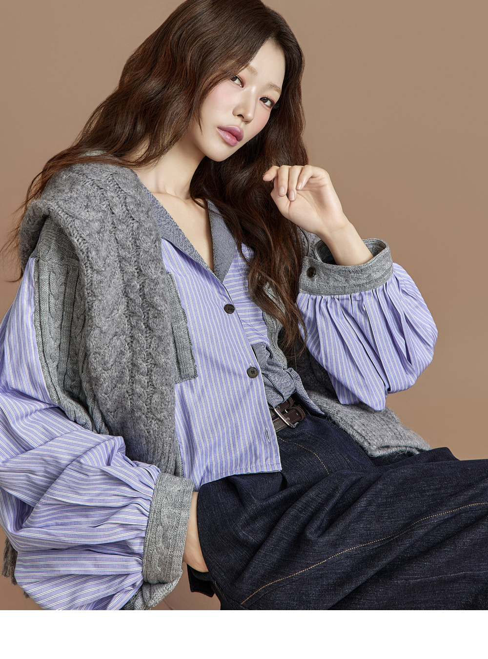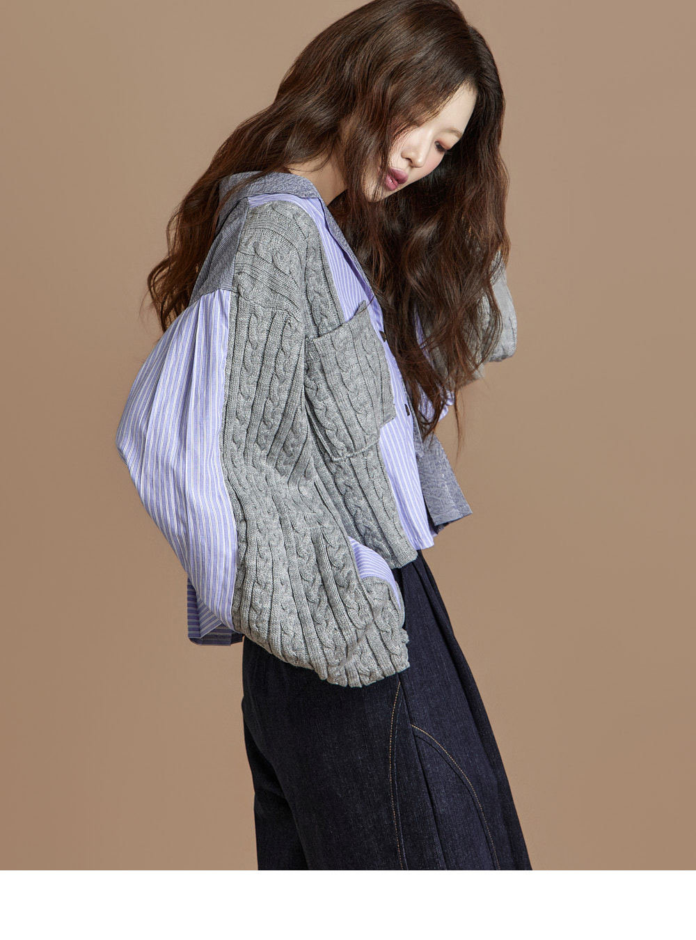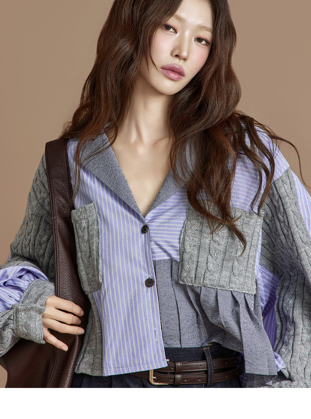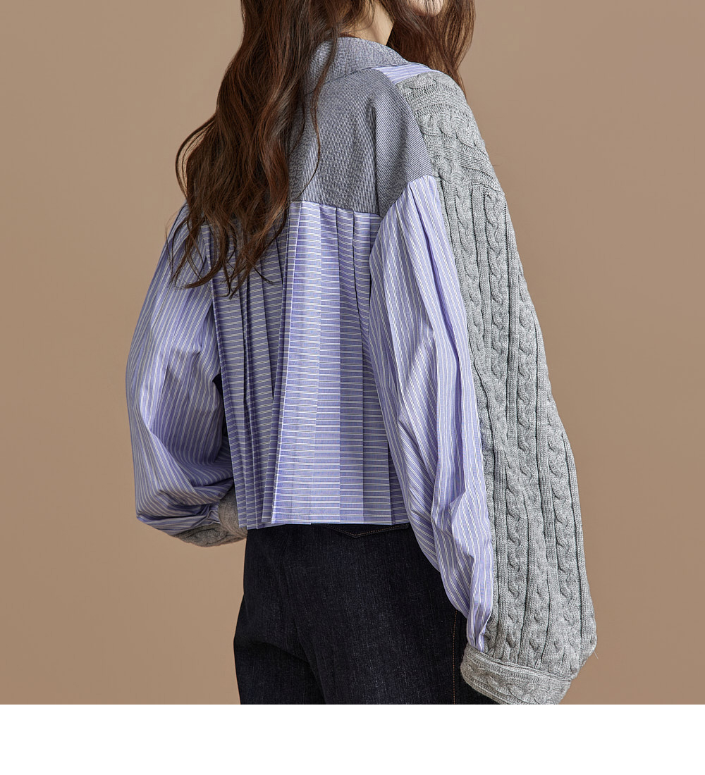 这是一款以针织拼接设计为亮点的短款衬衫。 采用聚酯纤维与天丝混纺面料制成,质地轻盈柔软,穿着舒适亲肤。 衬衫布料与针织材质相结合的设计,营造出独特的时尚氛围,条纹与褶皱细节更添层次感与个性魅力。 可单独穿着,也能与内搭或外套叠穿,从日常造型到约会穿搭都能轻松驾驭,是一款实用性与设计感兼具的单品。 模特身高171CM,穿着ONE尺码,示范颜色为天蓝色(SKY BLUE)。