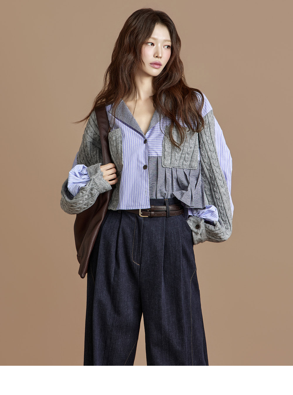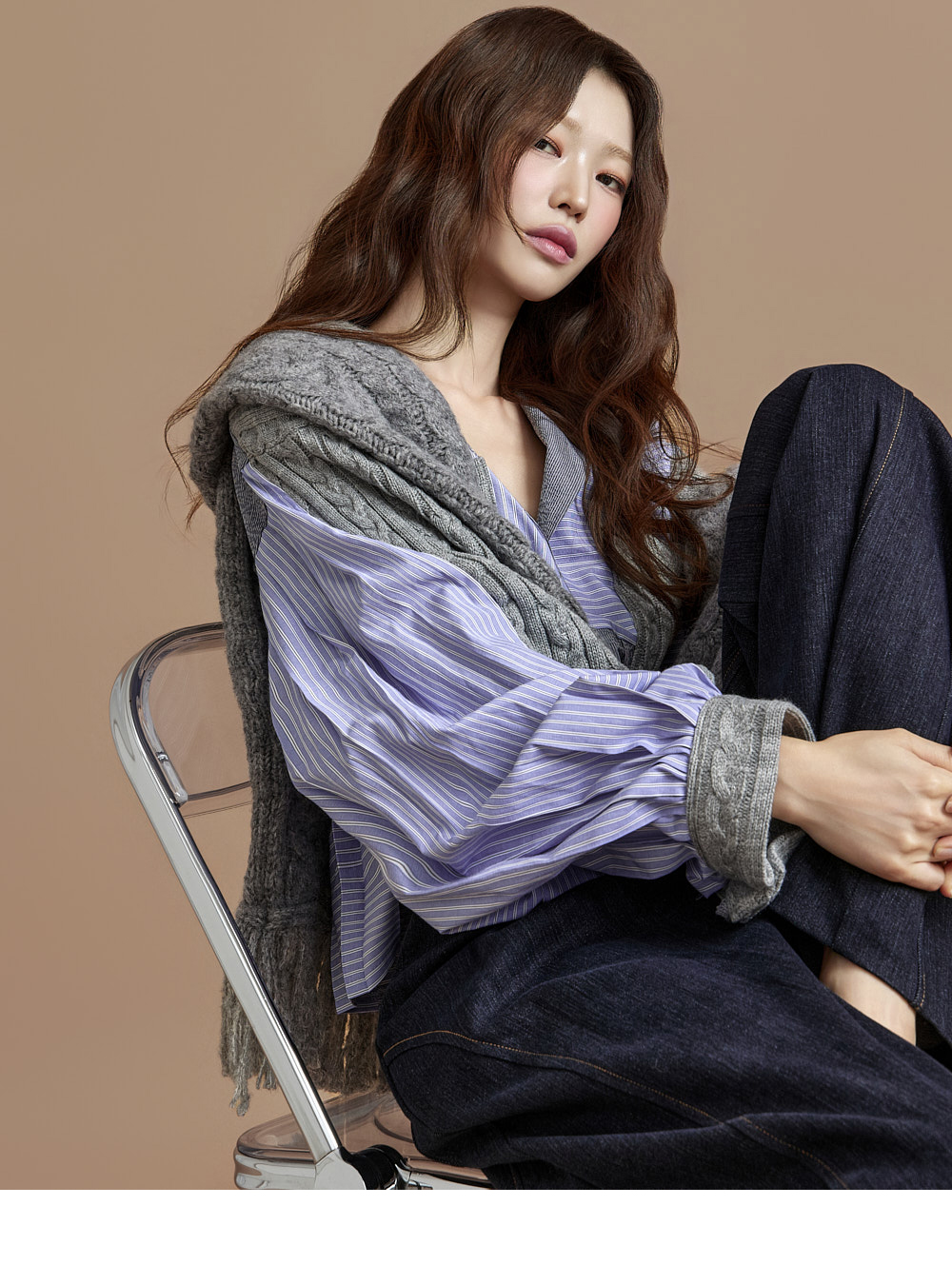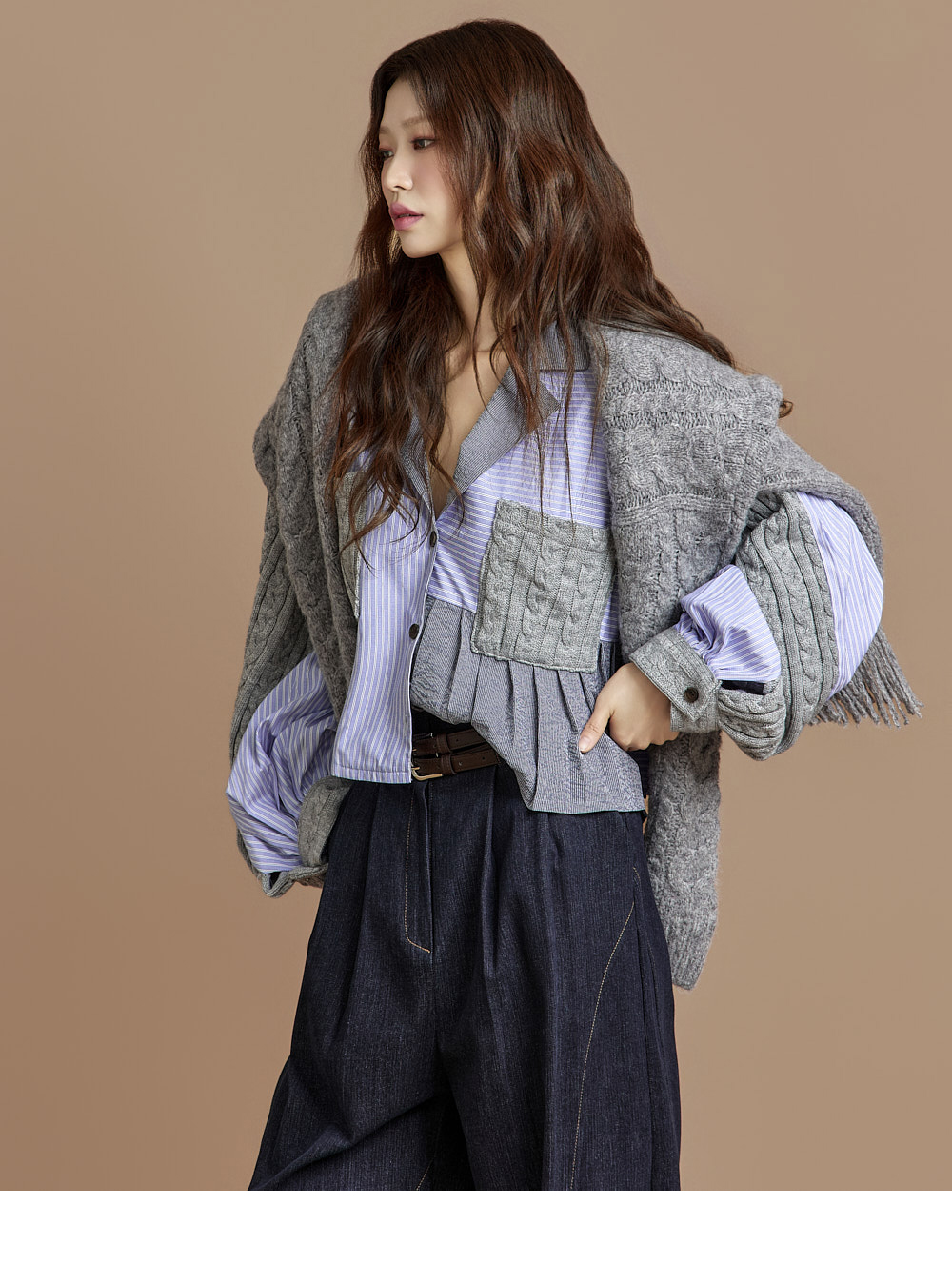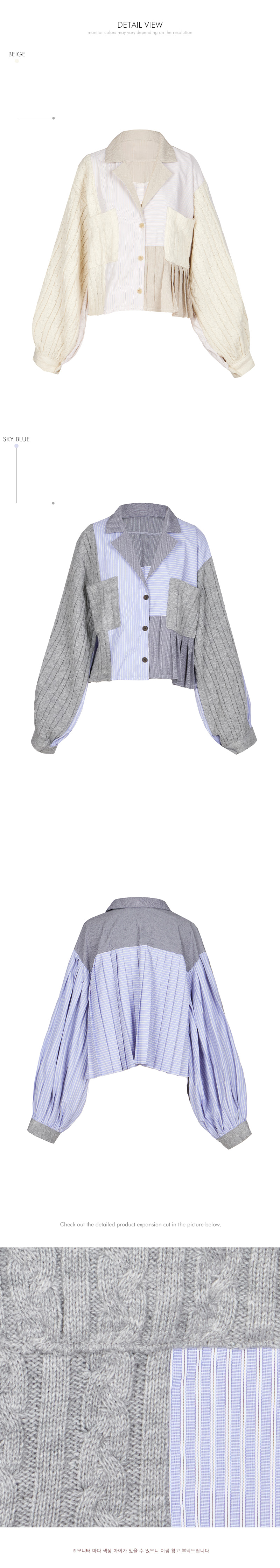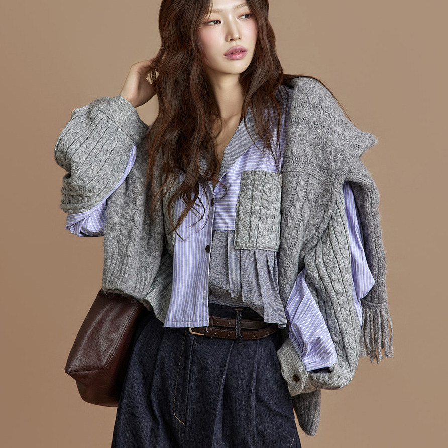 这是一款以针织拼接设计为亮点的短款衬衫。 采用聚酯纤维与天丝混纺面料制成,质地轻盈柔软,穿着舒适亲肤。 衬衫布料与针织材质相结合的设计,营造出独特的时尚氛围,条纹与褶皱细节更添层次感与个性魅力。 可单独穿着,也能与内搭或外套叠穿,从日常造型到约会穿搭都能轻松驾驭,是一款实用性与设计感兼具的单品。 模特身高171CM,穿着ONE尺码,示范颜色为天蓝色(SKY BLUE)。