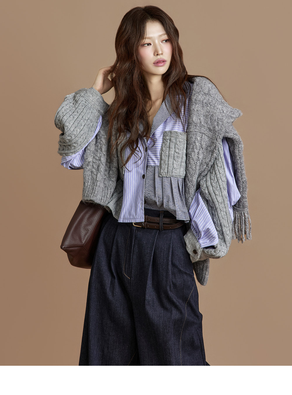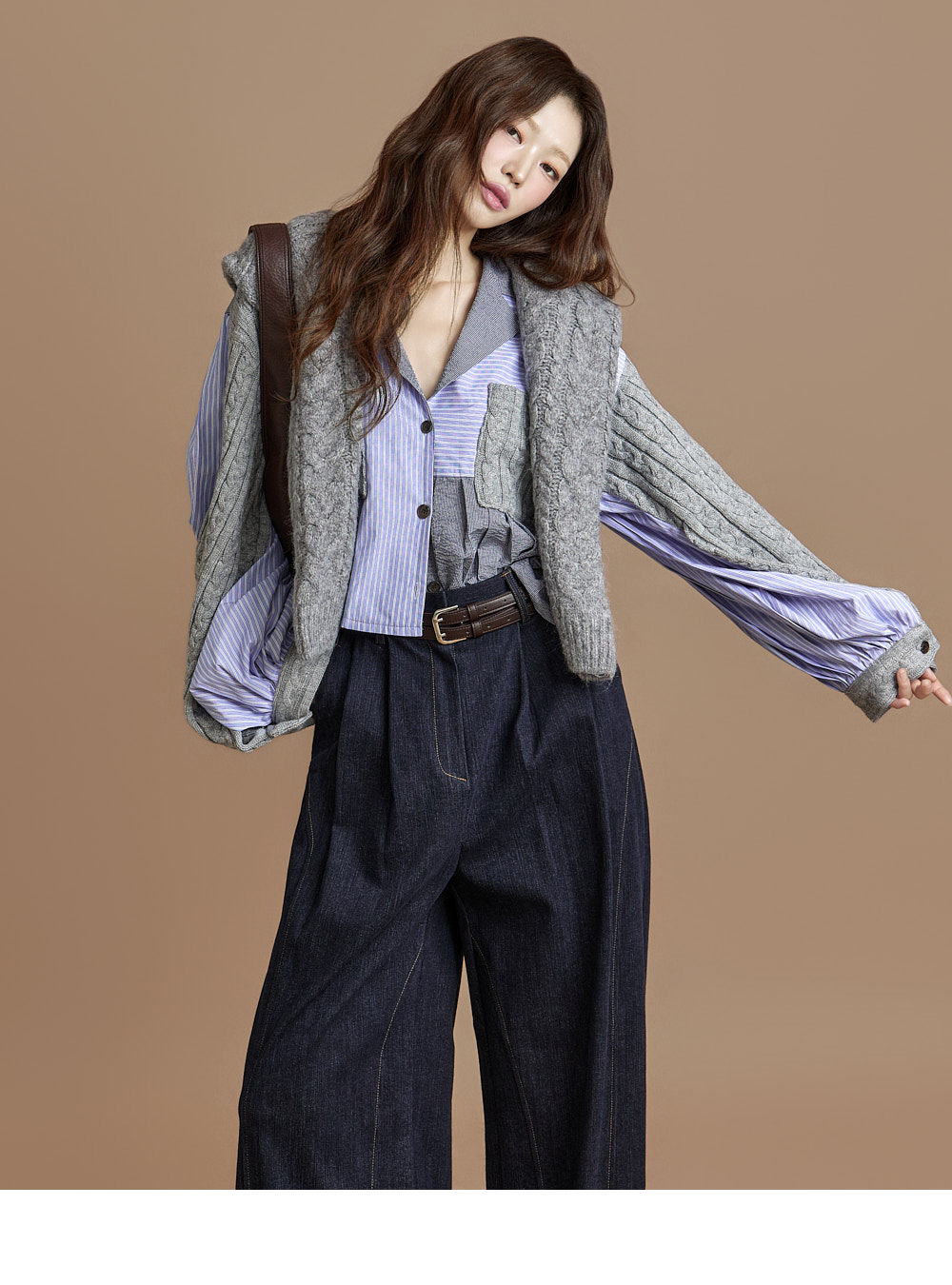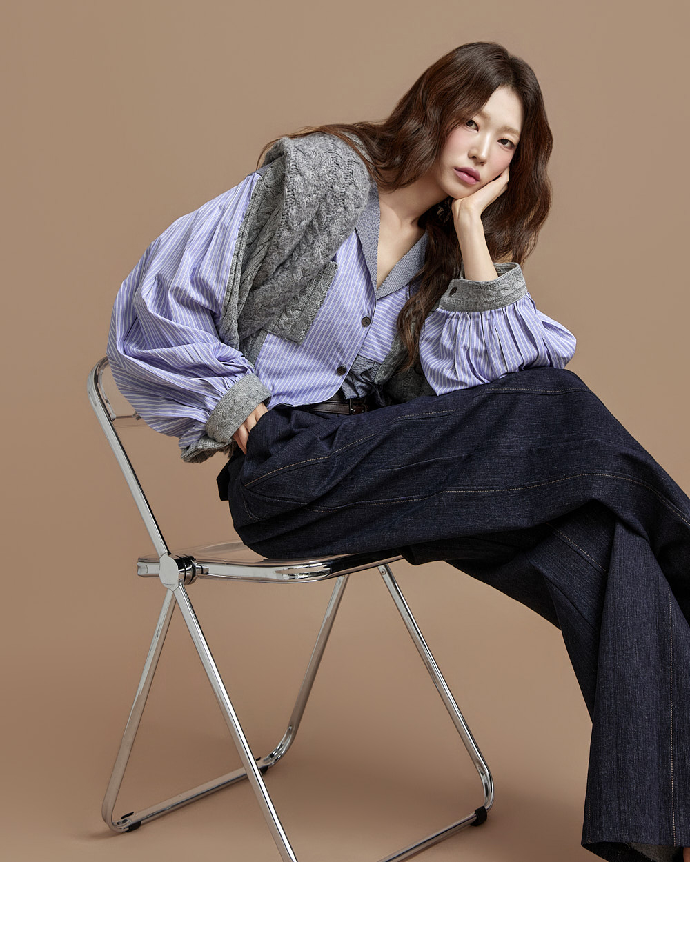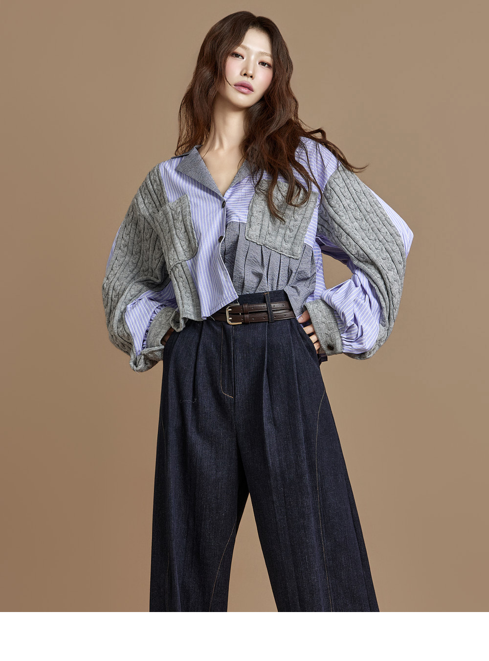 这是一款以针织拼接设计为亮点的短款衬衫。 采用聚酯纤维与天丝混纺面料制成,质地轻盈柔软,穿着舒适亲肤。 衬衫布料与针织材质相结合的设计,营造出独特的时尚氛围,条纹与褶皱细节更添层次感与个性魅力。 可单独穿着,也能与内搭或外套叠穿,从日常造型到约会穿搭都能轻松驾驭,是一款实用性与设计感兼具的单品。 模特身高171CM,穿着ONE尺码,示范颜色为天蓝色(SKY BLUE)。