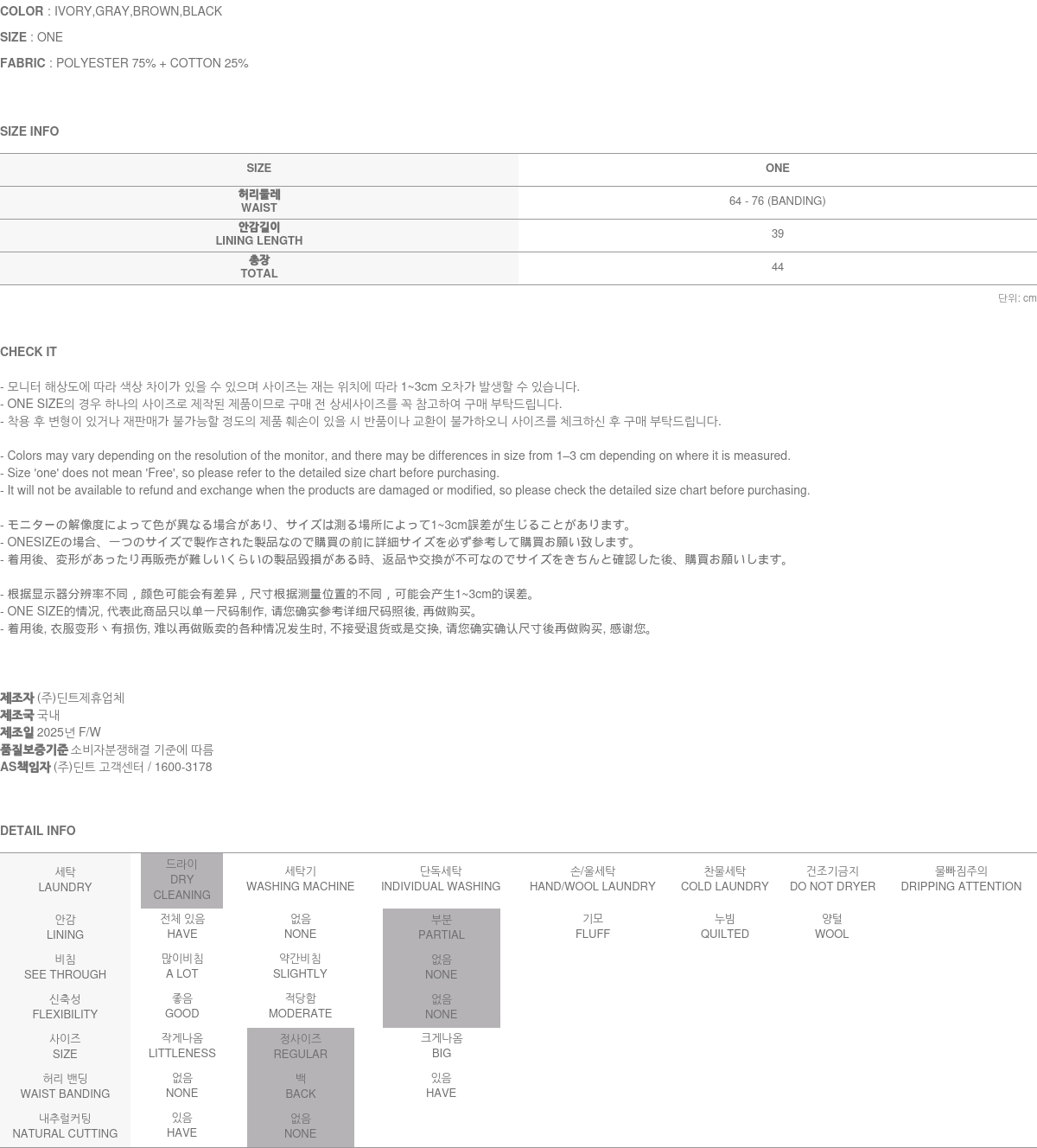 換貨 與 退貨 收到商品後, 7日內能在我的頁面申請交換或退貨, 申請後請將商品寄回DINT. 申請後, 請填寫包裹裡一同寄去的撤回申請書, 再將包裹包裝成一開始您收到時的狀態(包裝袋、衣架、贈品皆要一起寄送回來)發送至DINT即可. 因爲顧客變心所申請的換貨與退貨, 運費將由顧客負擔;誤送或是商品瑕疵的部分, 將由DINT負擔運費. 退貨住所爲:首爾市 衿川區 加山洞 459-8號 大韓通運 7樓 DINT股份有限公司 品質保證標準說明:符合電子商務等有關消費者保護法律規定的消費者可申請交換或是退貨.