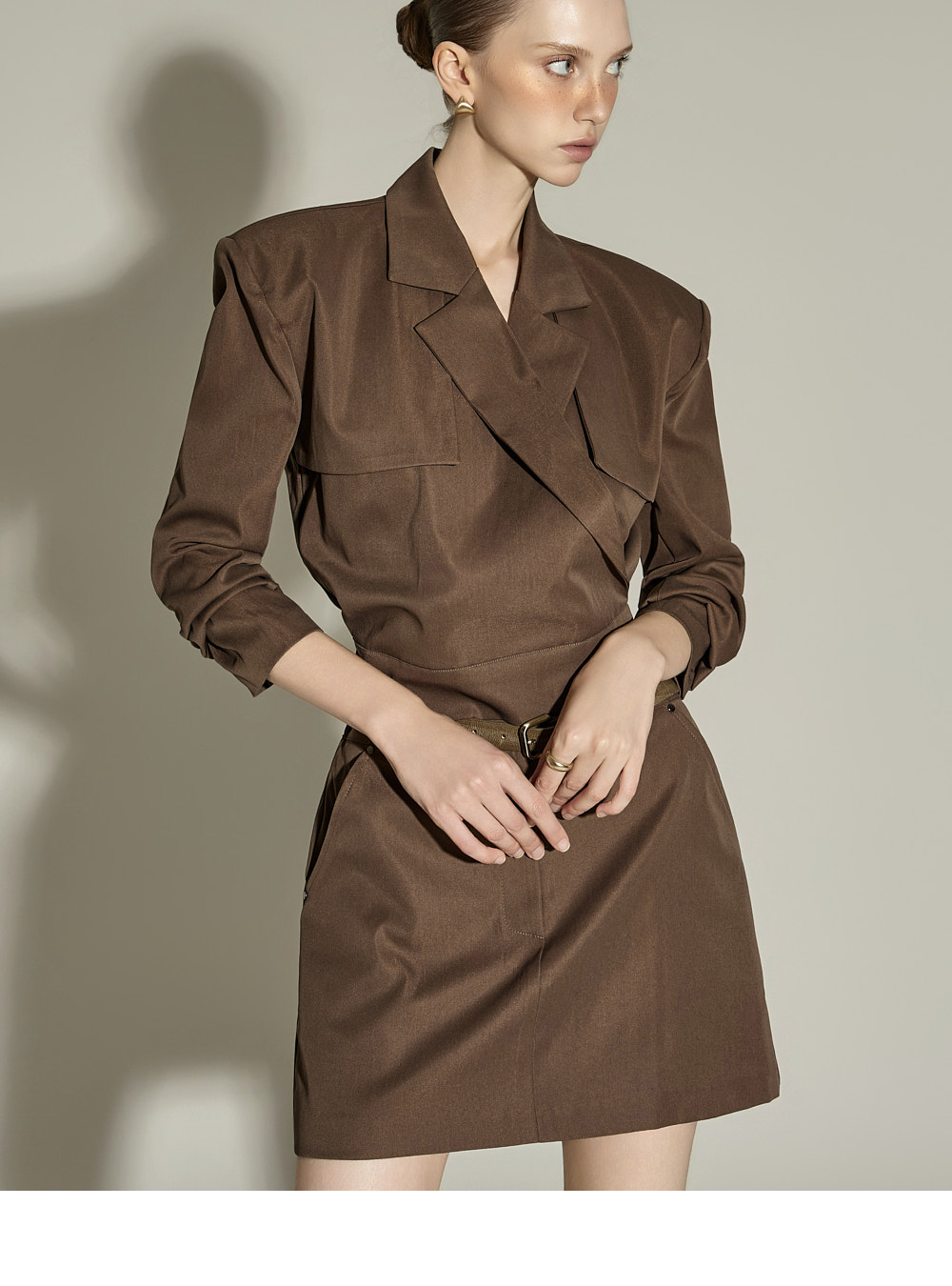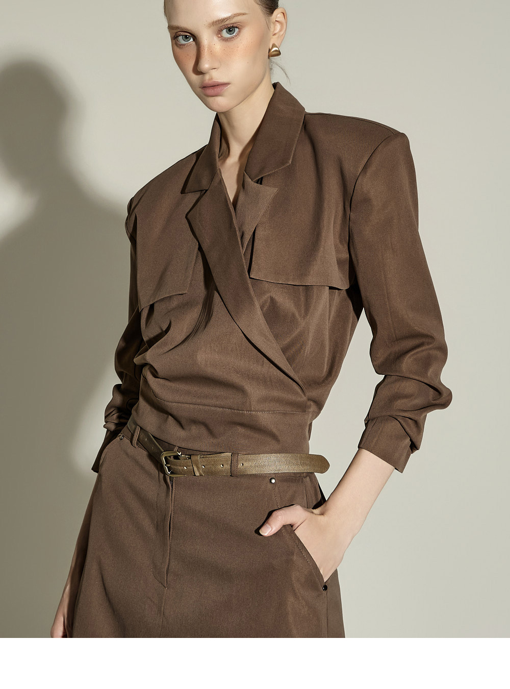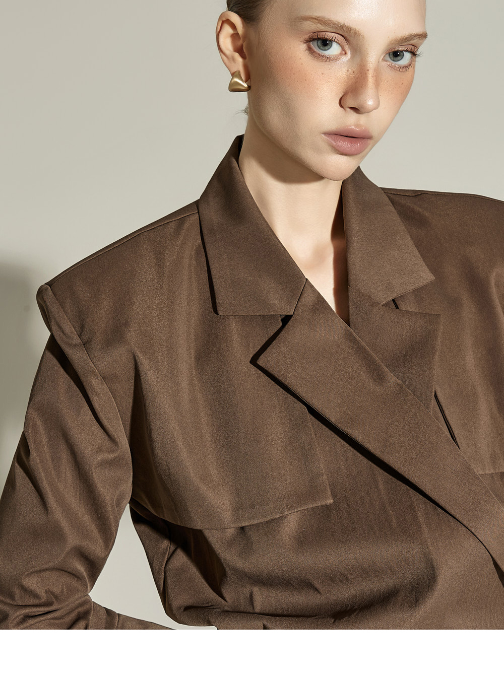 肩部内置适度厚度的垫肩,勾勒出干净的肩部线条。