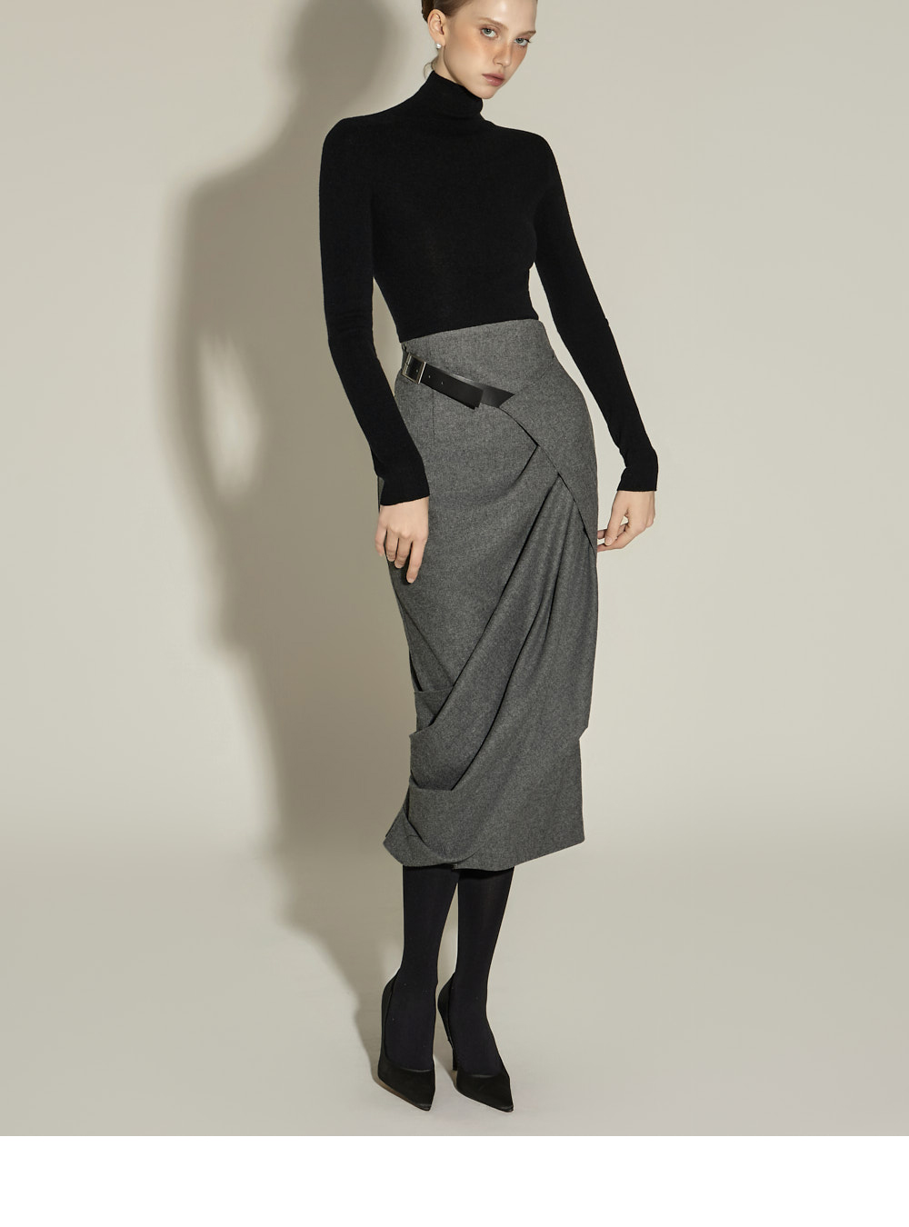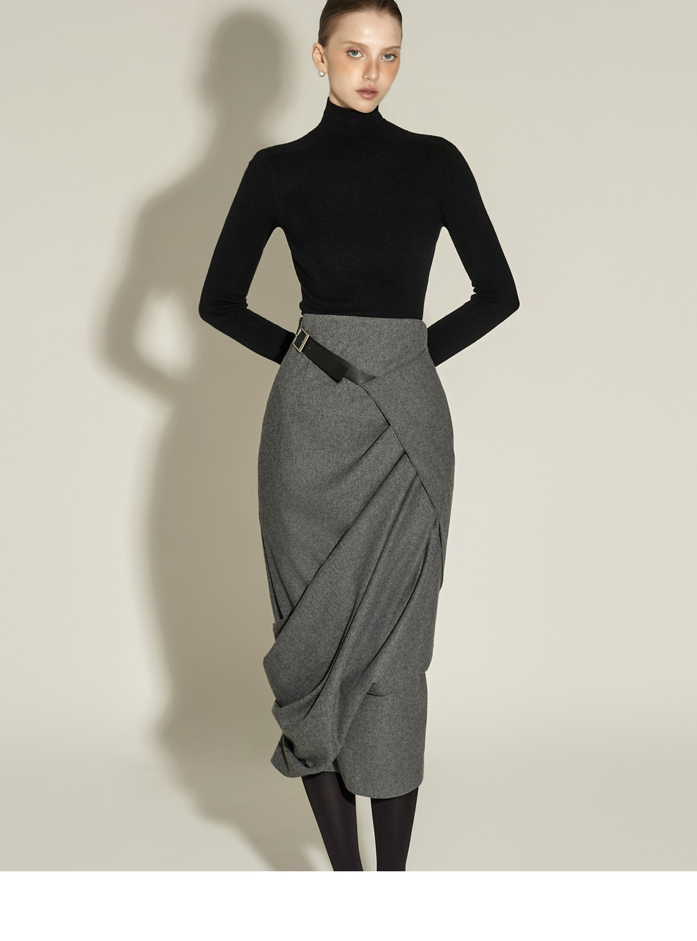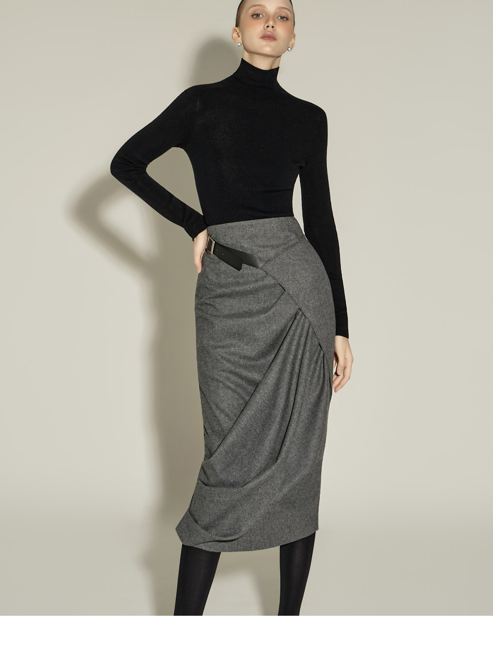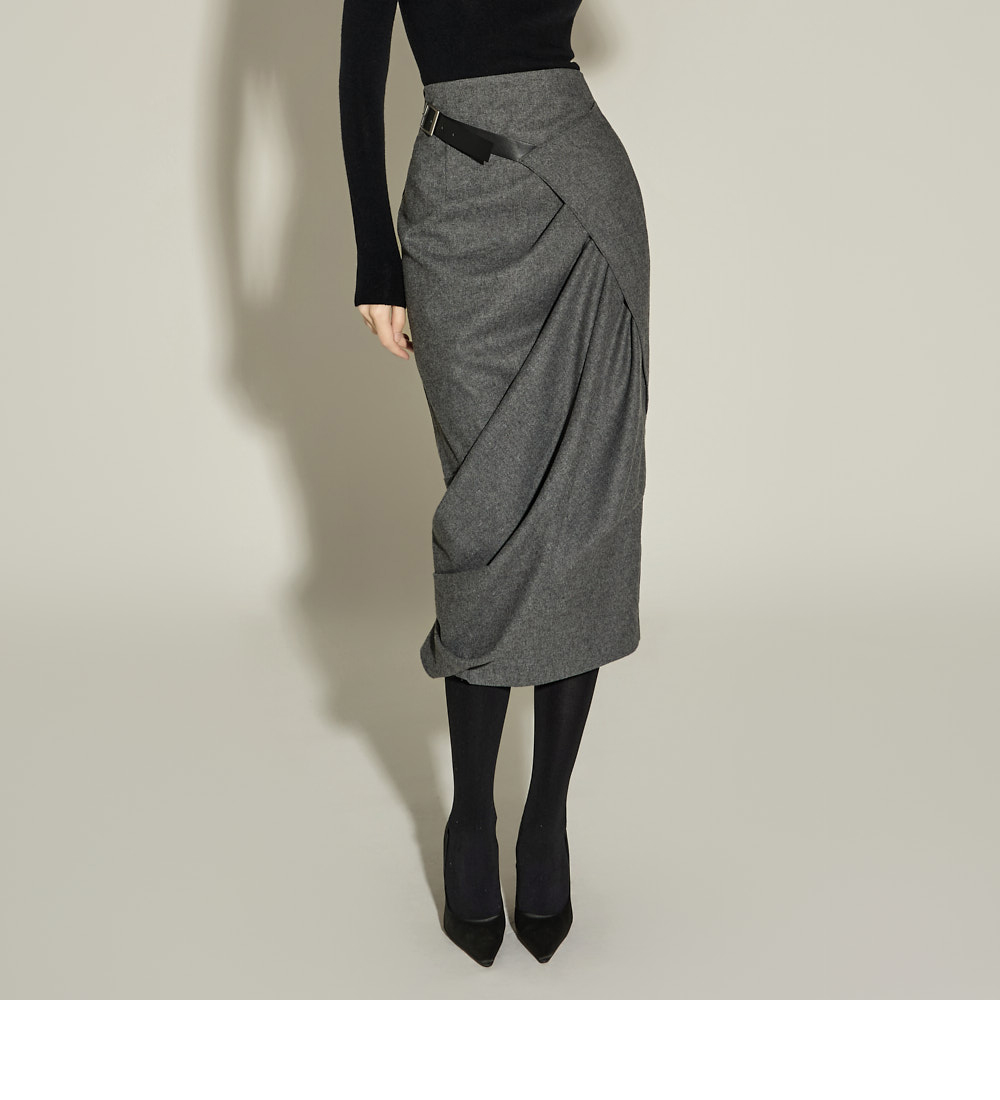 这是一款优雅风格的褶皱裹身腰带半身裙。 自然垂坠的褶皱剪裁营造出优雅氛围,腰带设计收紧腰线,展现纤细身形。 后侧拉链与开衩设计提升活动舒适度,H 型中长裙摆线条干净利落,呈现干练又精致的印象。 适合从正式场合到办公室造型的多种搭配。 174CM 模特穿着 S 码,示范深灰色款。