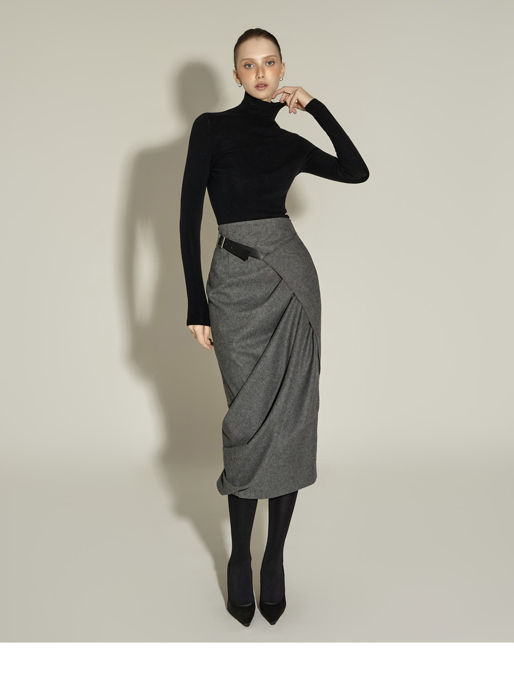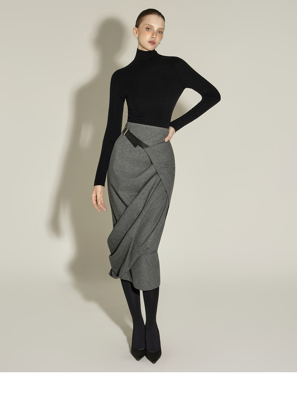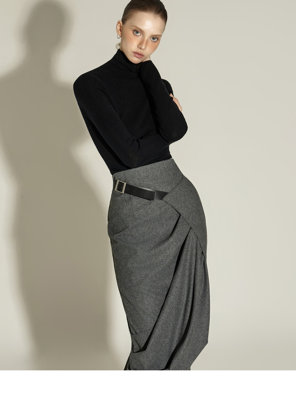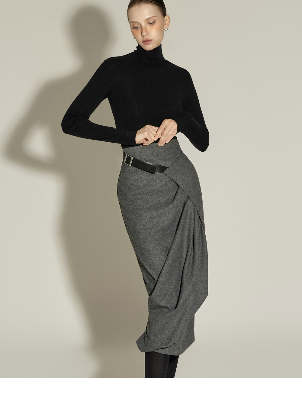 这是一款优雅风格的褶皱裹身腰带半身裙。 自然垂坠的褶皱剪裁营造出优雅氛围,腰带设计收紧腰线,展现纤细身形。 后侧拉链与开衩设计提升活动舒适度,H 型中长裙摆线条干净利落,呈现干练又精致的印象。 适合从正式场合到办公室造型的多种搭配。 174CM 模特穿着 S 码,示范深灰色款。