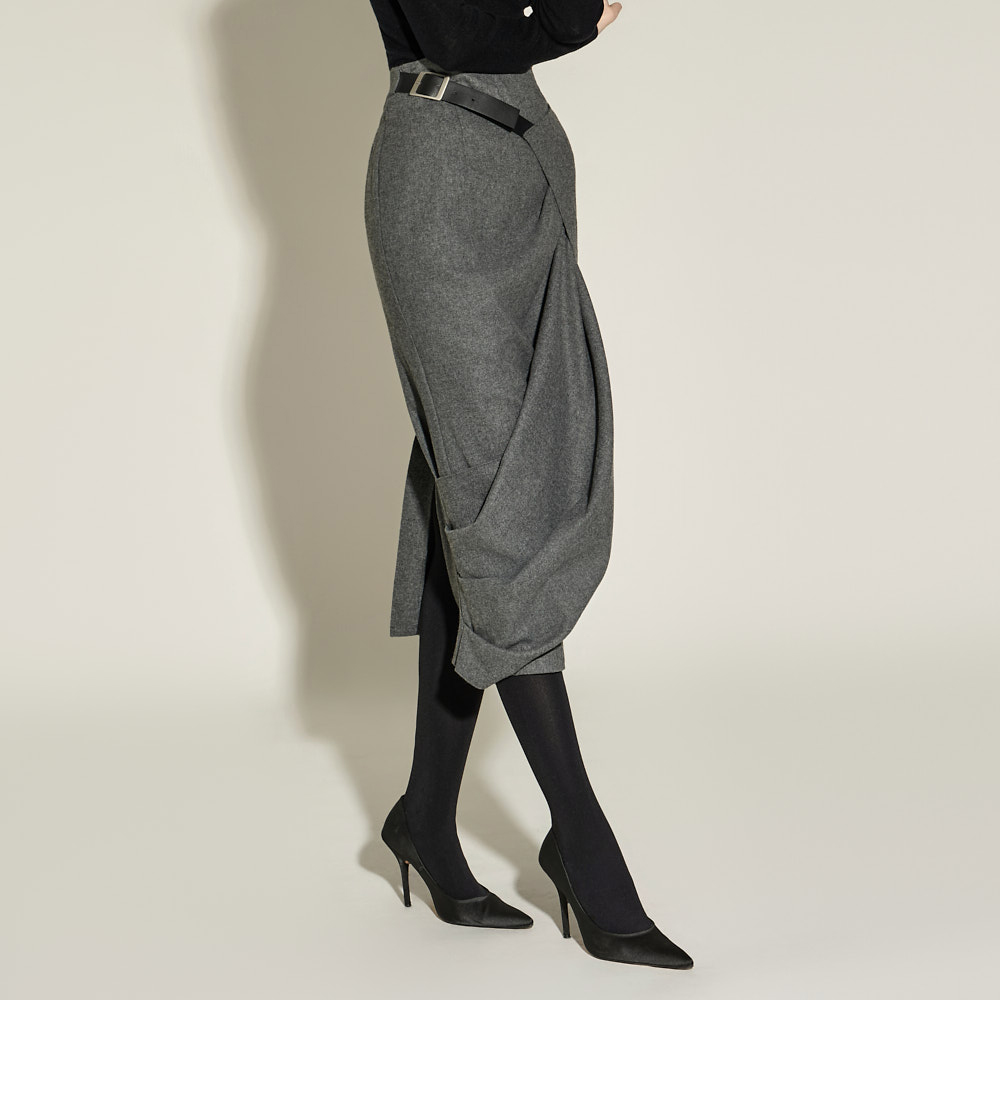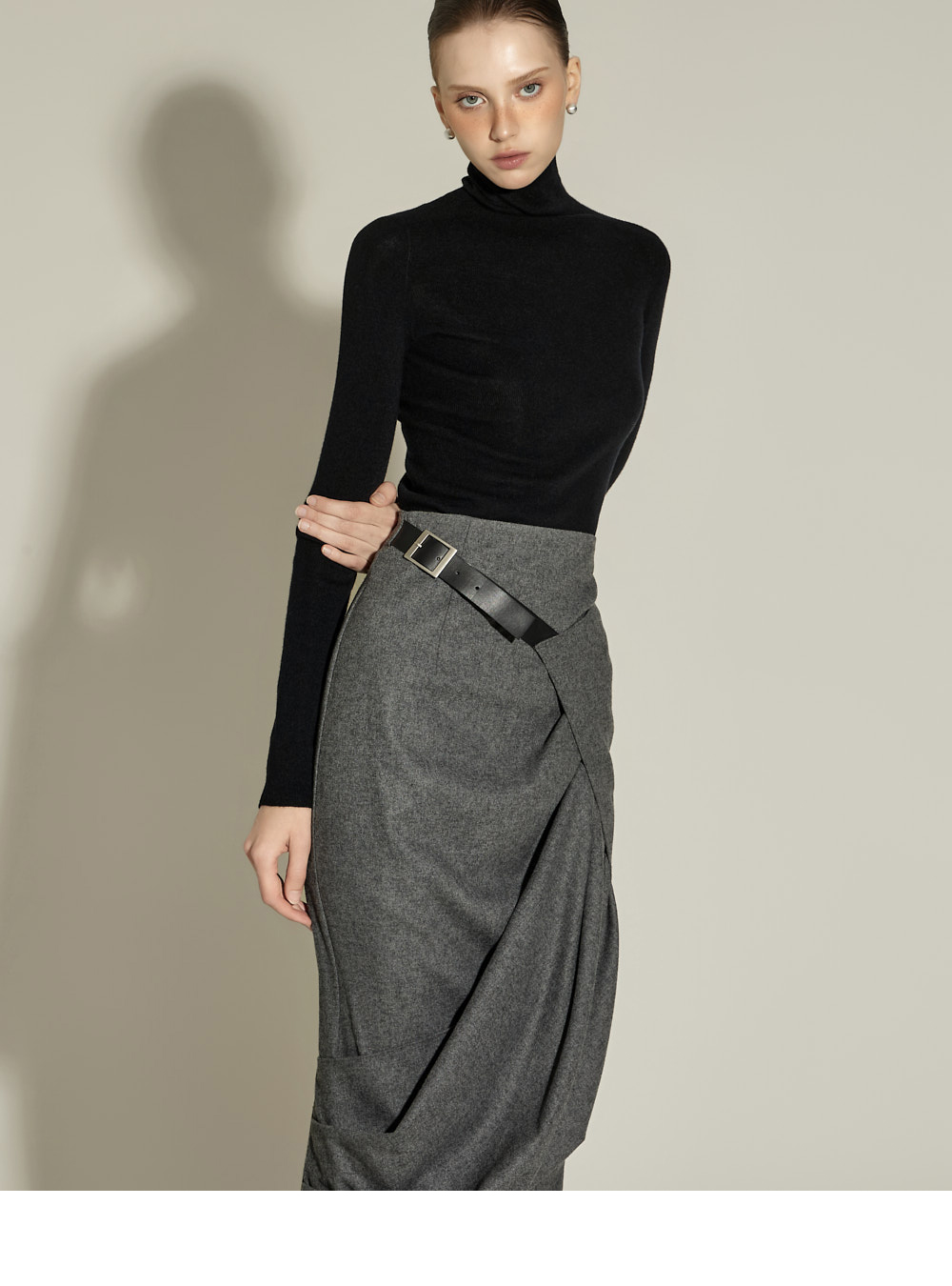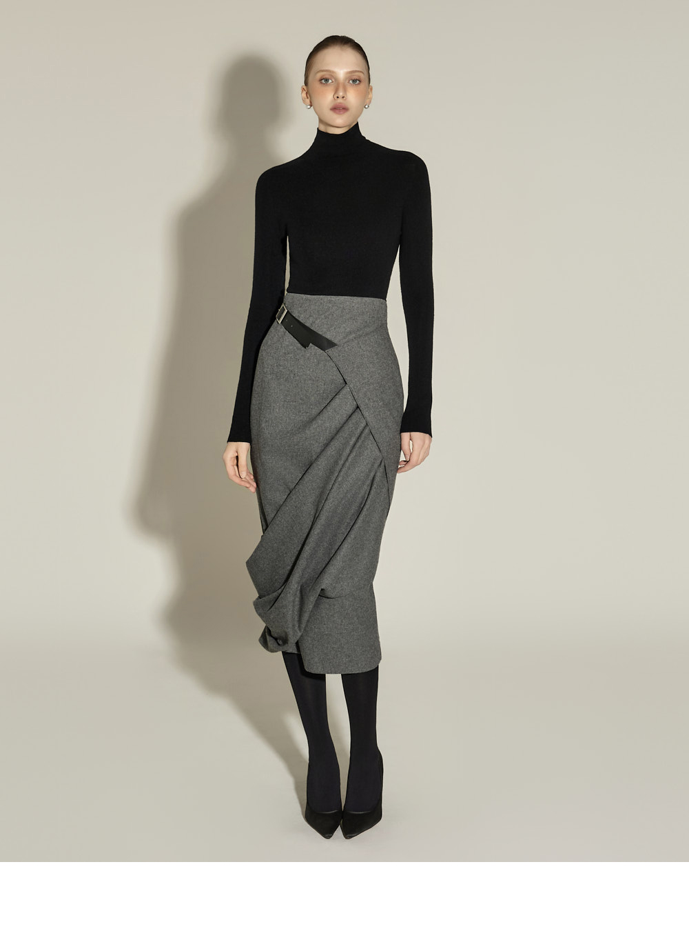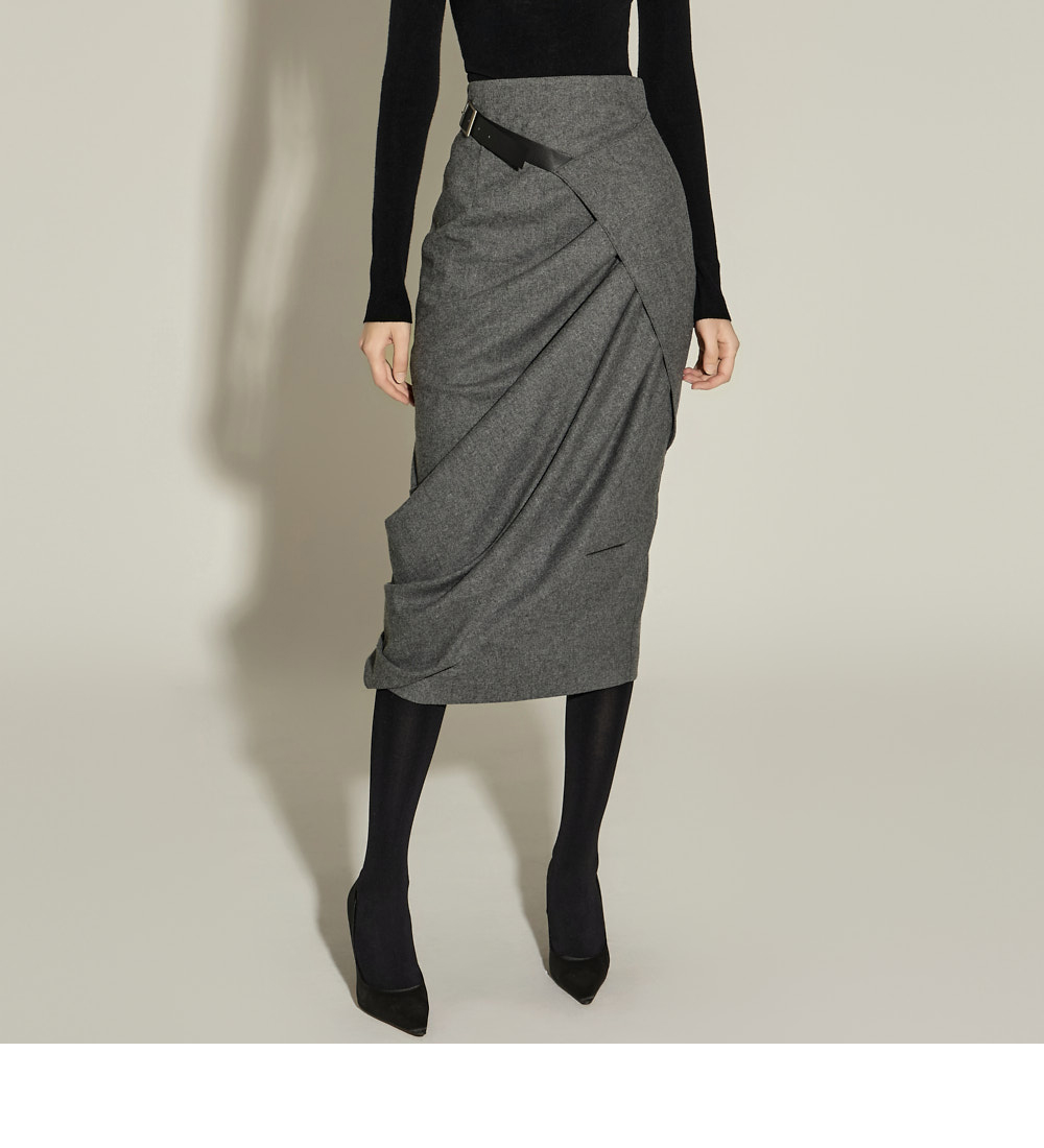 这是一款优雅风格的褶皱裹身腰带半身裙。 自然垂坠的褶皱剪裁营造出优雅氛围,腰带设计收紧腰线,展现纤细身形。 后侧拉链与开衩设计提升活动舒适度,H 型中长裙摆线条干净利落,呈现干练又精致的印象。 适合从正式场合到办公室造型的多种搭配。 174CM 模特穿着 S 码,示范深灰色款。