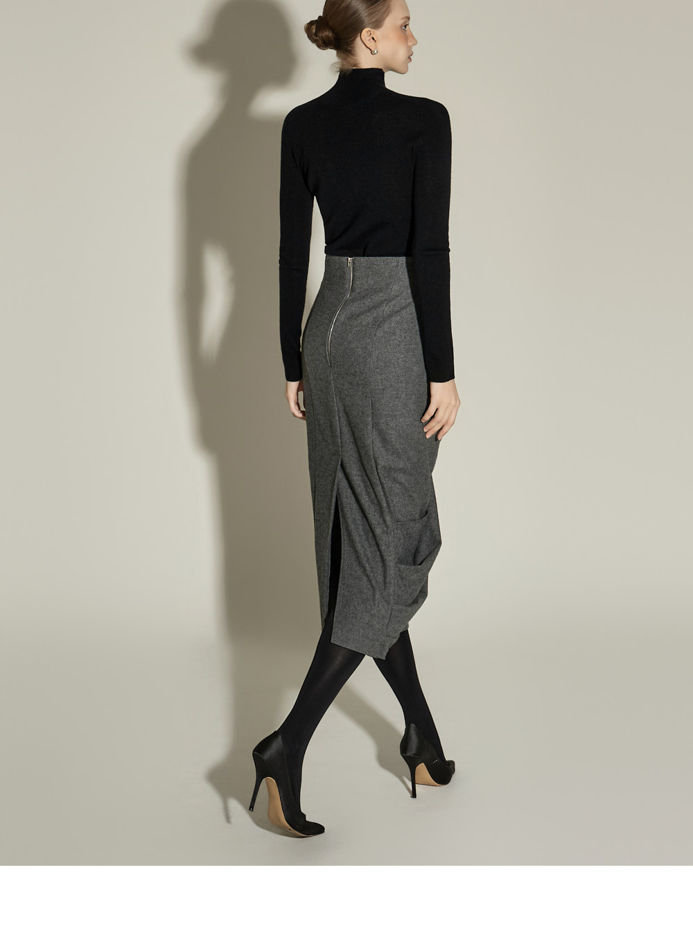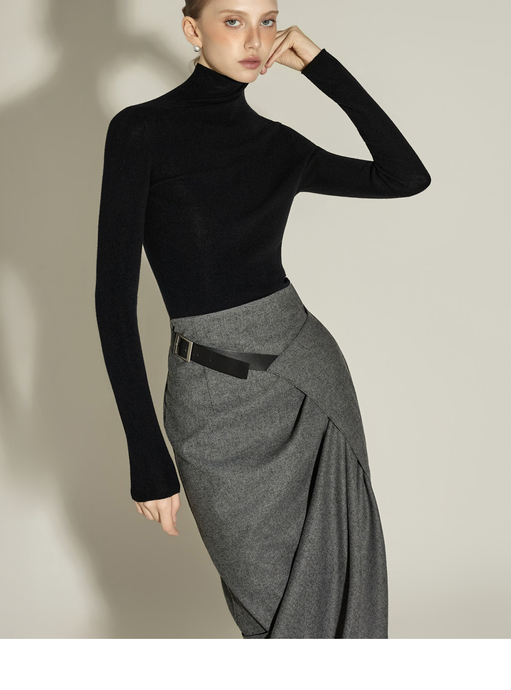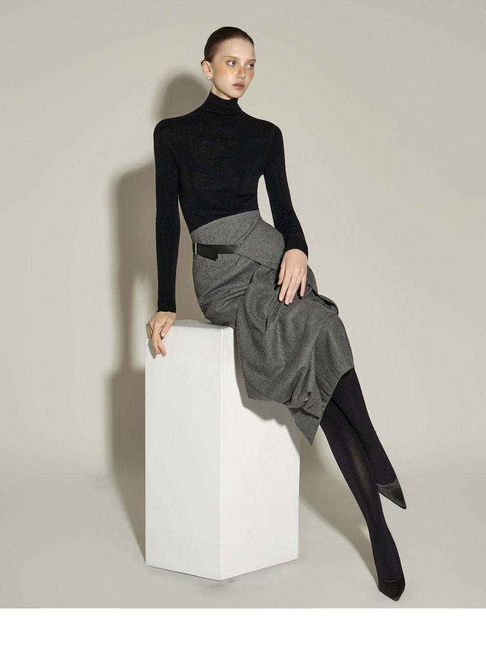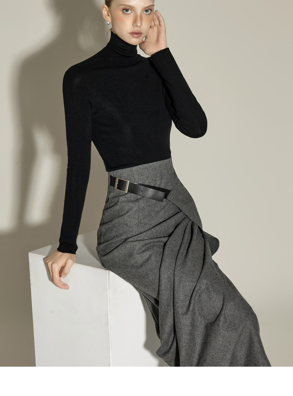 这是一款优雅风格的褶皱裹身腰带半身裙。 自然垂坠的褶皱剪裁营造出优雅氛围,腰带设计收紧腰线,展现纤细身形。 后侧拉链与开衩设计提升活动舒适度,H 型中长裙摆线条干净利落,呈现干练又精致的印象。 适合从正式场合到办公室造型的多种搭配。 174CM 模特穿着 S 码,示范深灰色款。