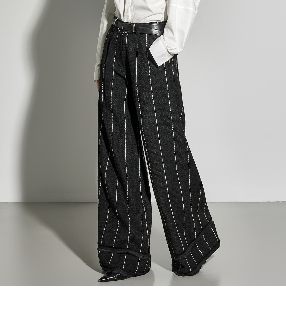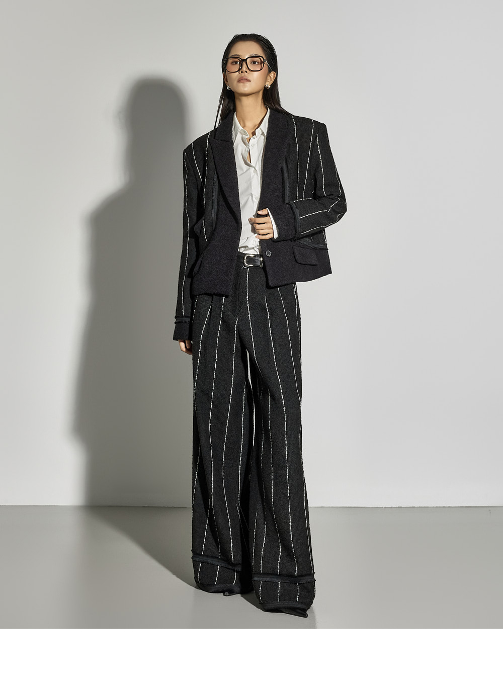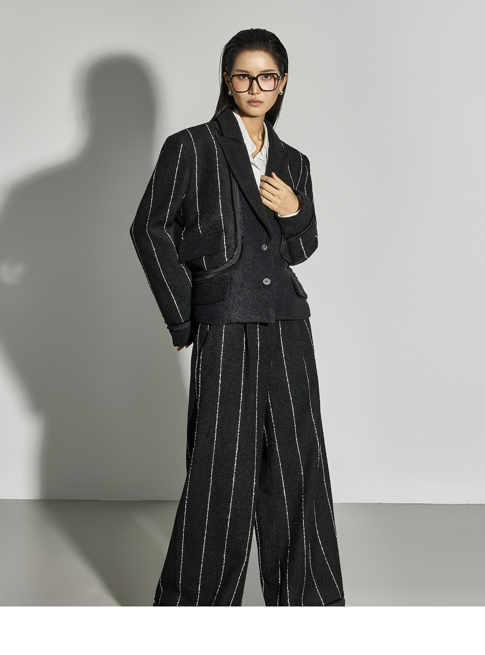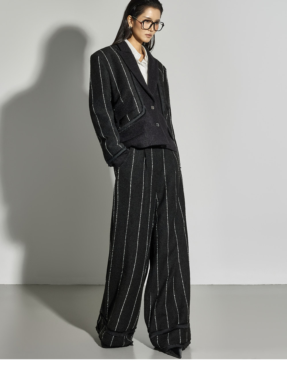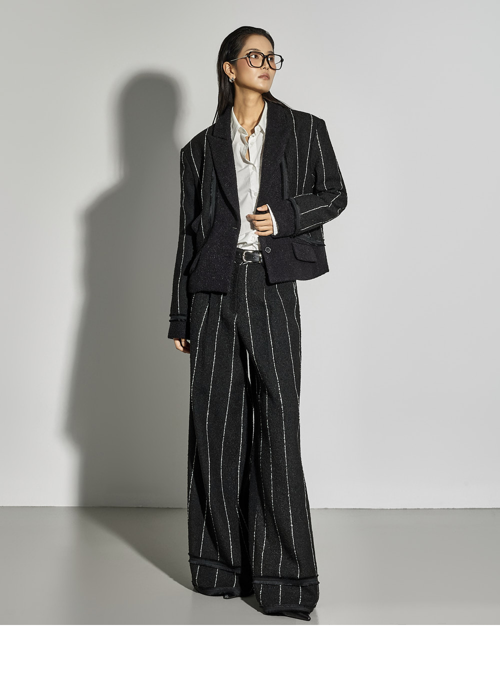 这是一款时尚感十足的条纹西装裤。 采用聚酯纤维与羊毛混纺材质制作,质地结实,同时带来温暖舒适的穿着感。 羊毛特有的细腻质感增添高级感,宽松的阔腿版型既舒适又打造精致廓形。 竖条纹图案视觉上拉长双腿,裤脚翻边设计增添经典亮点。 通过稳固支撑臀部与腰部的结构裁片,提升整体完成度。 与同材质西装外套搭配可呈现更加时尚、现代的套装造型,也可单穿,轻松驾驭从正式装到潮流休闲装的多种造型。 173CM模特身穿S码,BLACK色。