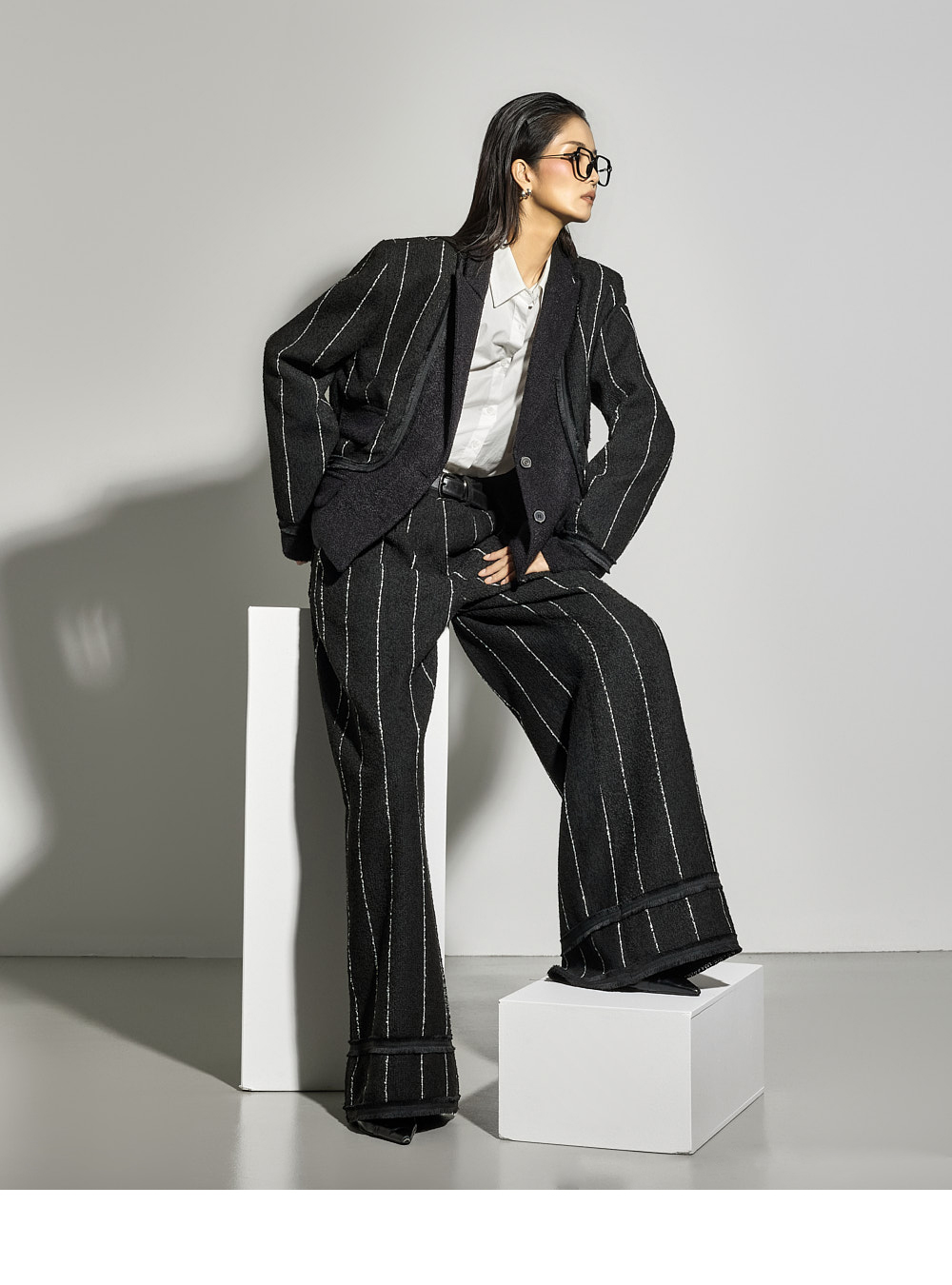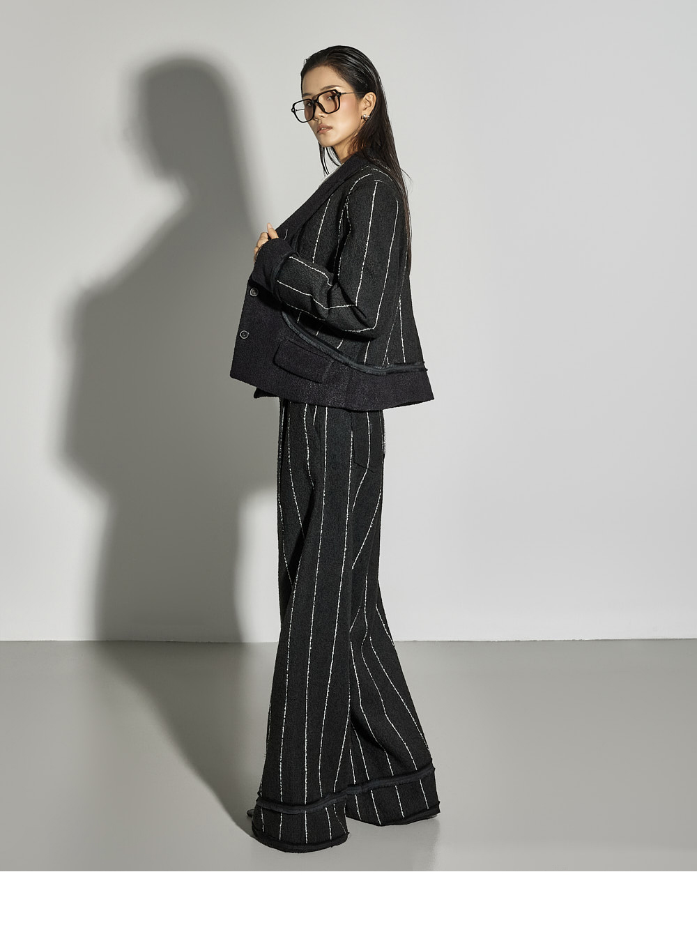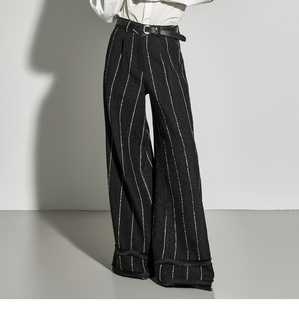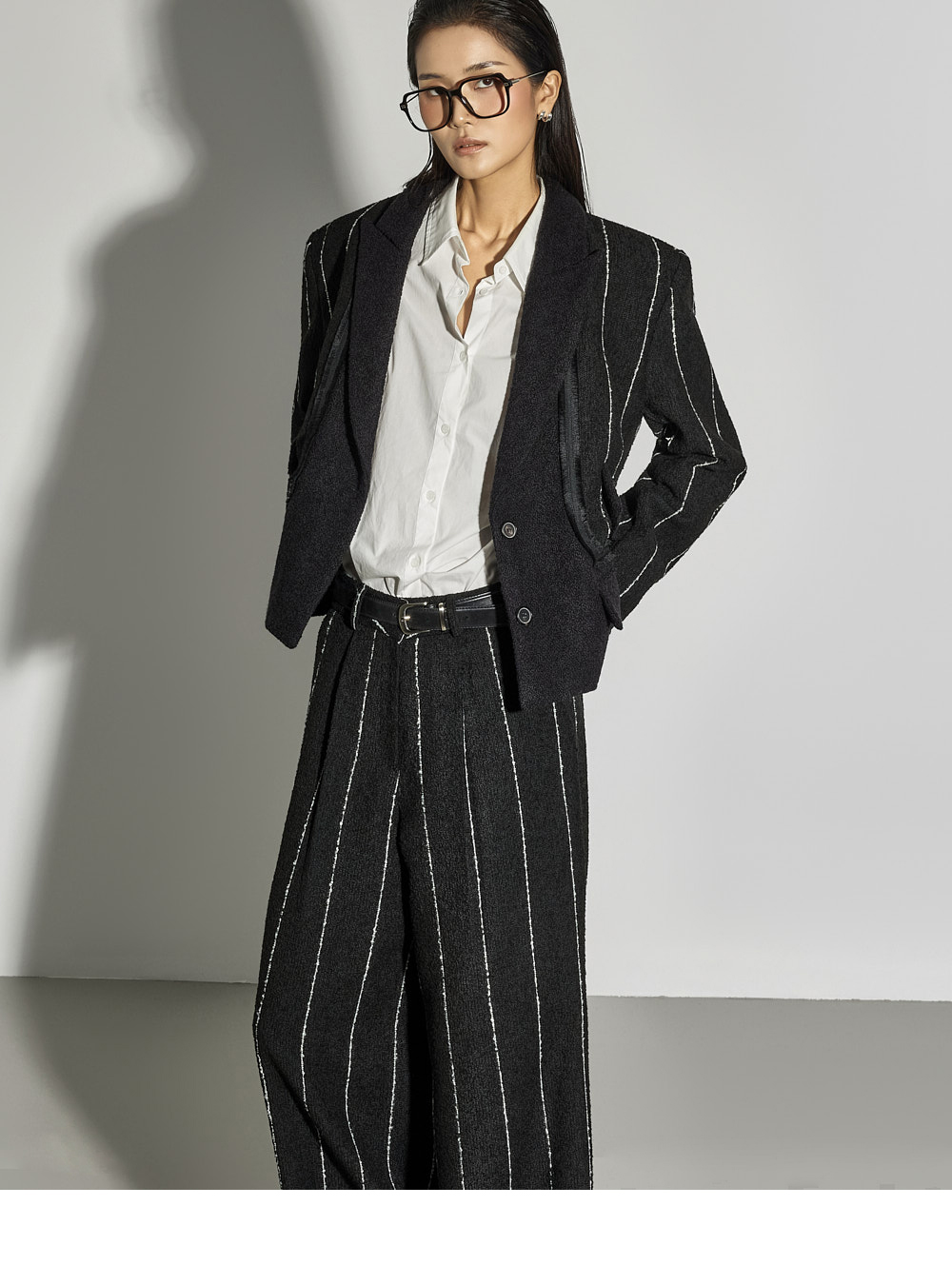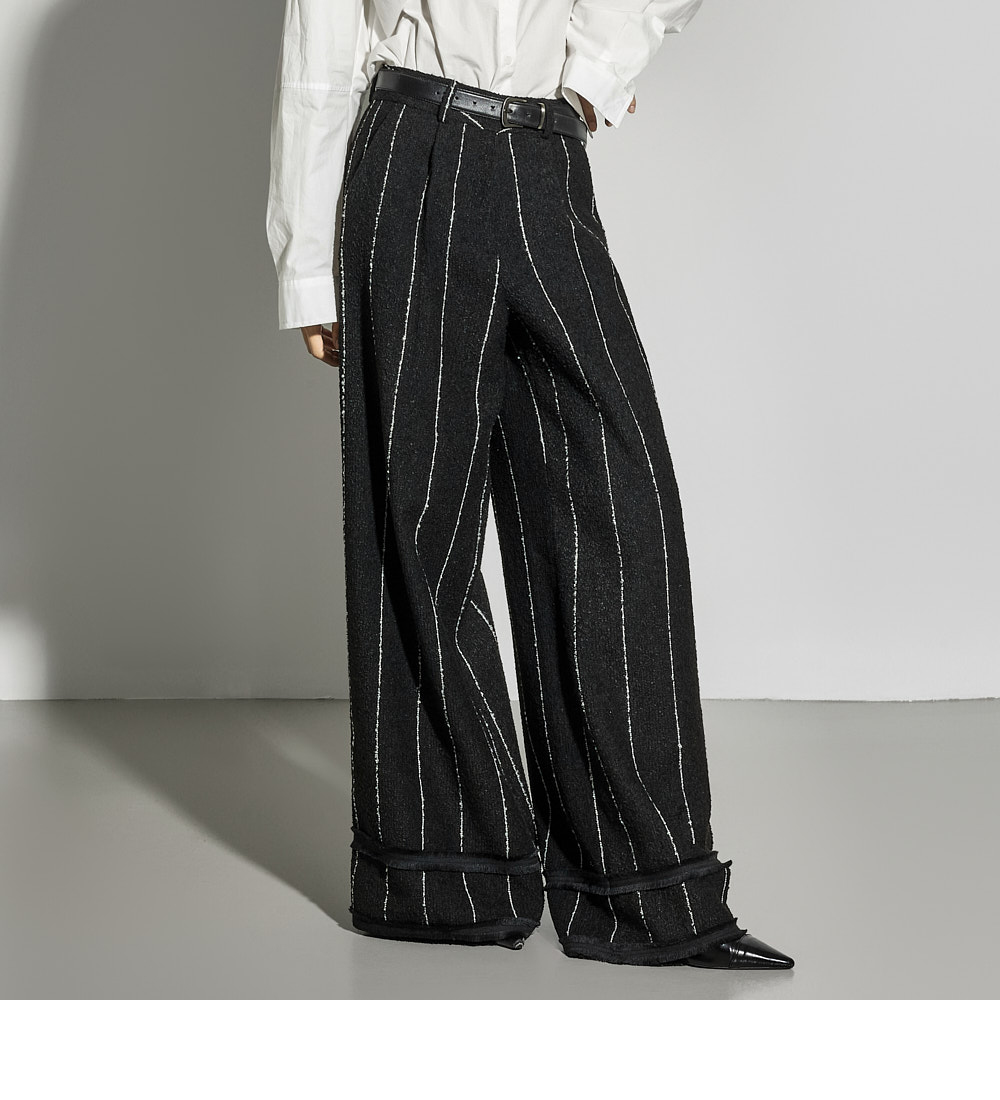 这是一款时尚感十足的条纹西装裤。 采用聚酯纤维与羊毛混纺材质制作,质地结实,同时带来温暖舒适的穿着感。 羊毛特有的细腻质感增添高级感,宽松的阔腿版型既舒适又打造精致廓形。 竖条纹图案视觉上拉长双腿,裤脚翻边设计增添经典亮点。 通过稳固支撑臀部与腰部的结构裁片,提升整体完成度。 与同材质西装外套搭配可呈现更加时尚、现代的套装造型,也可单穿,轻松驾驭从正式装到潮流休闲装的多种造型。 173CM模特身穿S码,BLACK色。
