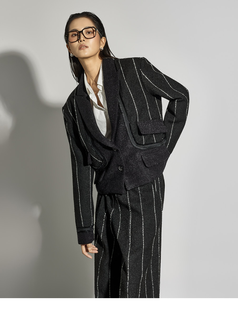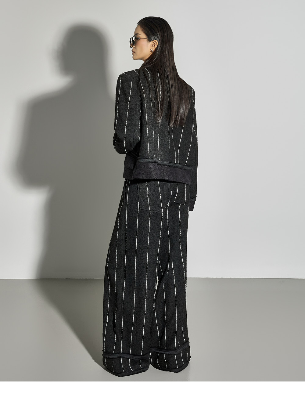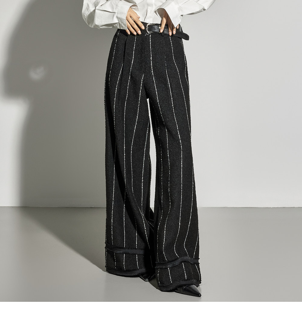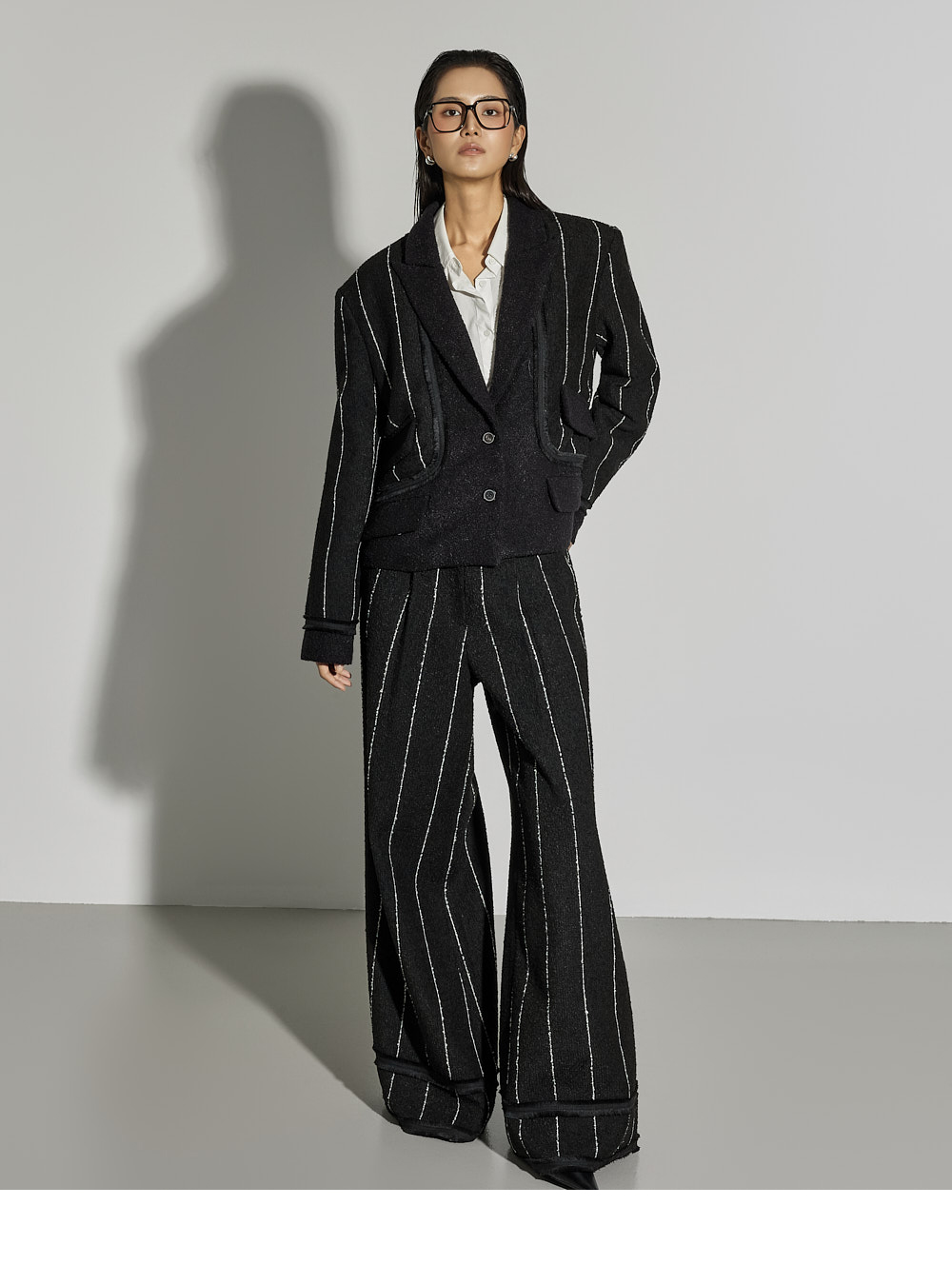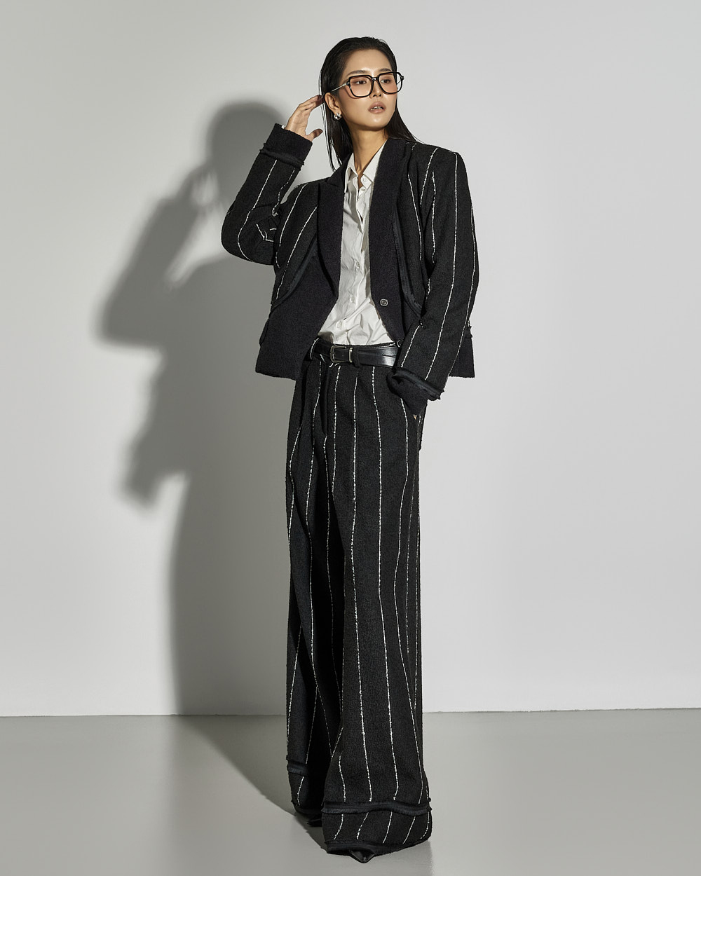 这是一款时尚感十足的条纹西装裤。 采用聚酯纤维与羊毛混纺材质制作,质地结实,同时带来温暖舒适的穿着感。 羊毛特有的细腻质感增添高级感,宽松的阔腿版型既舒适又打造精致廓形。 竖条纹图案视觉上拉长双腿,裤脚翻边设计增添经典亮点。 通过稳固支撑臀部与腰部的结构裁片,提升整体完成度。 与同材质西装外套搭配可呈现更加时尚、现代的套装造型,也可单穿,轻松驾驭从正式装到潮流休闲装的多种造型。 173CM模特身穿S码,BLACK色。