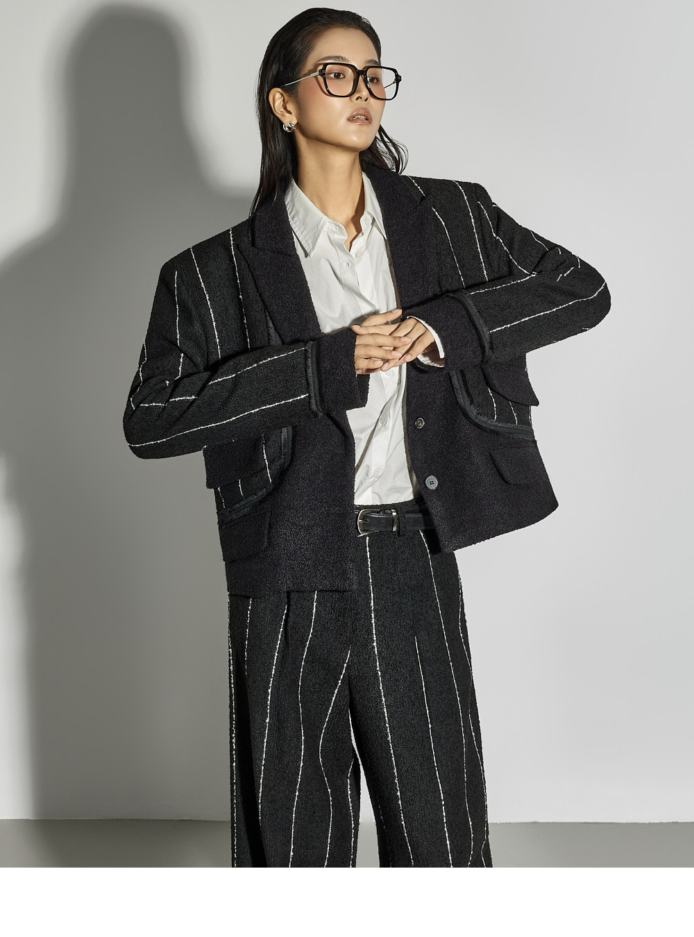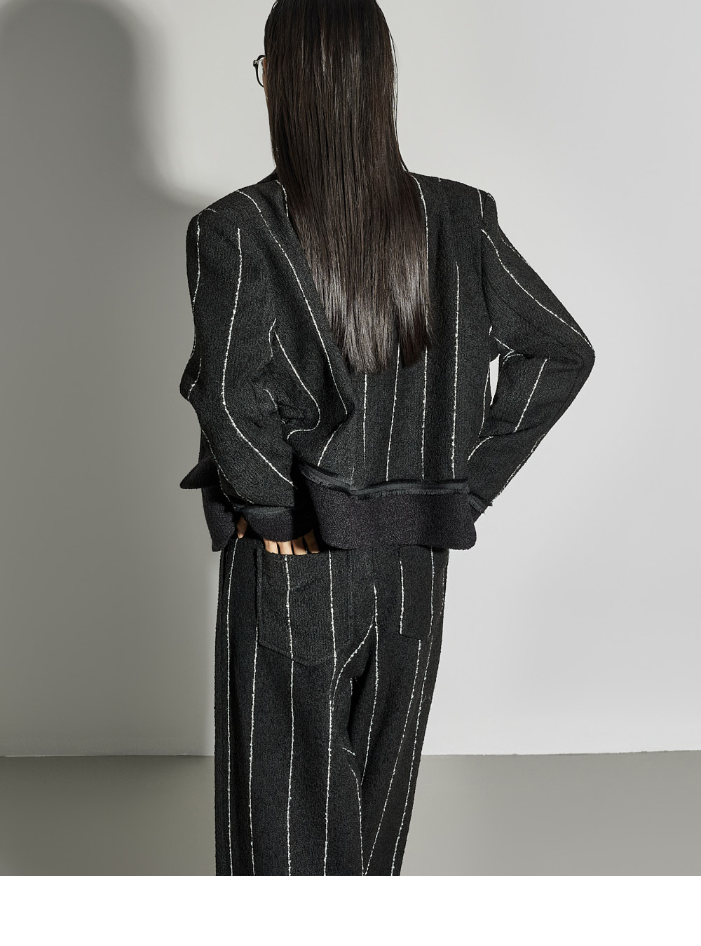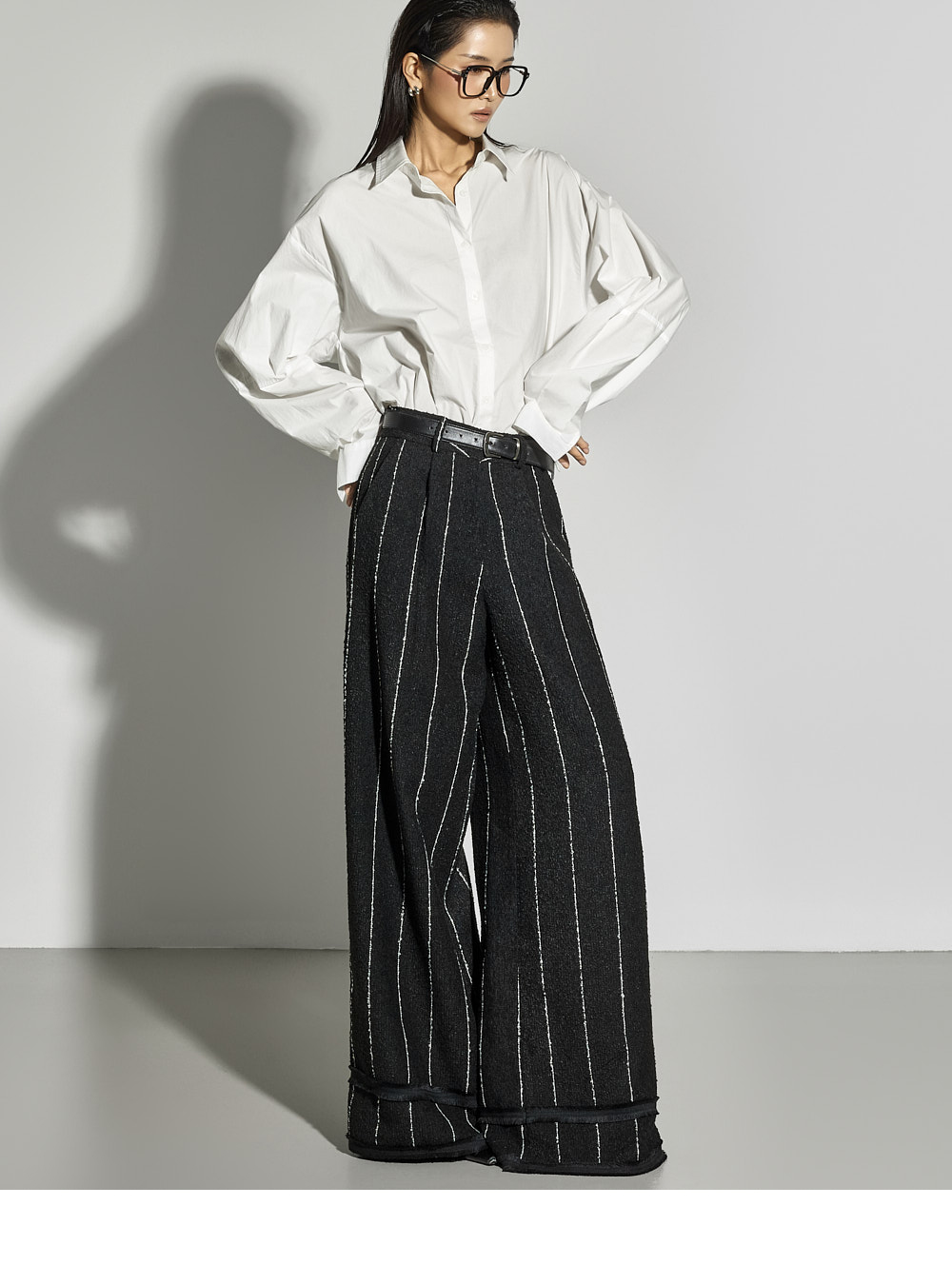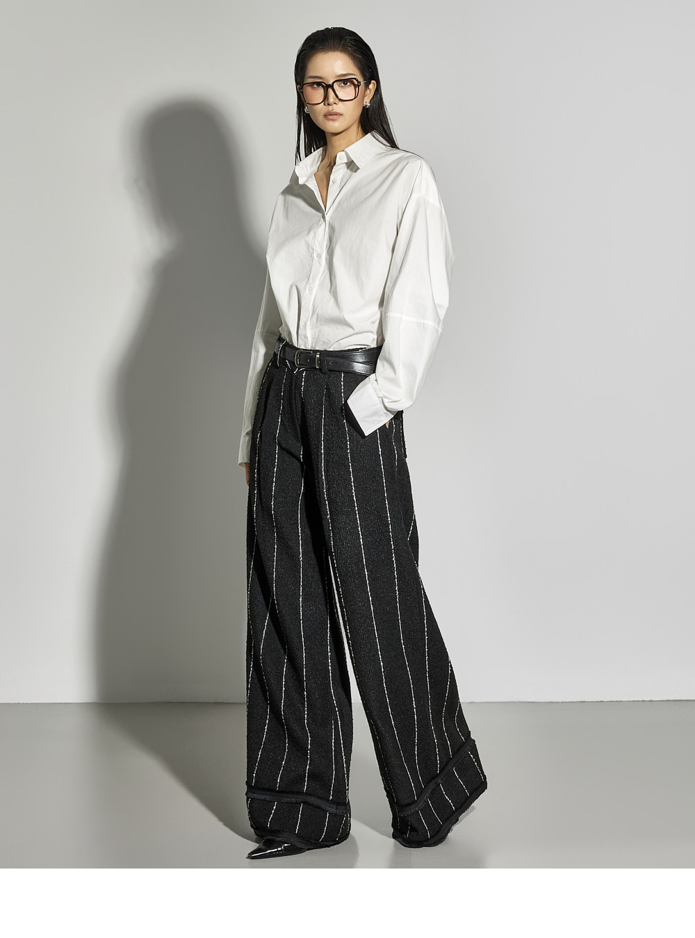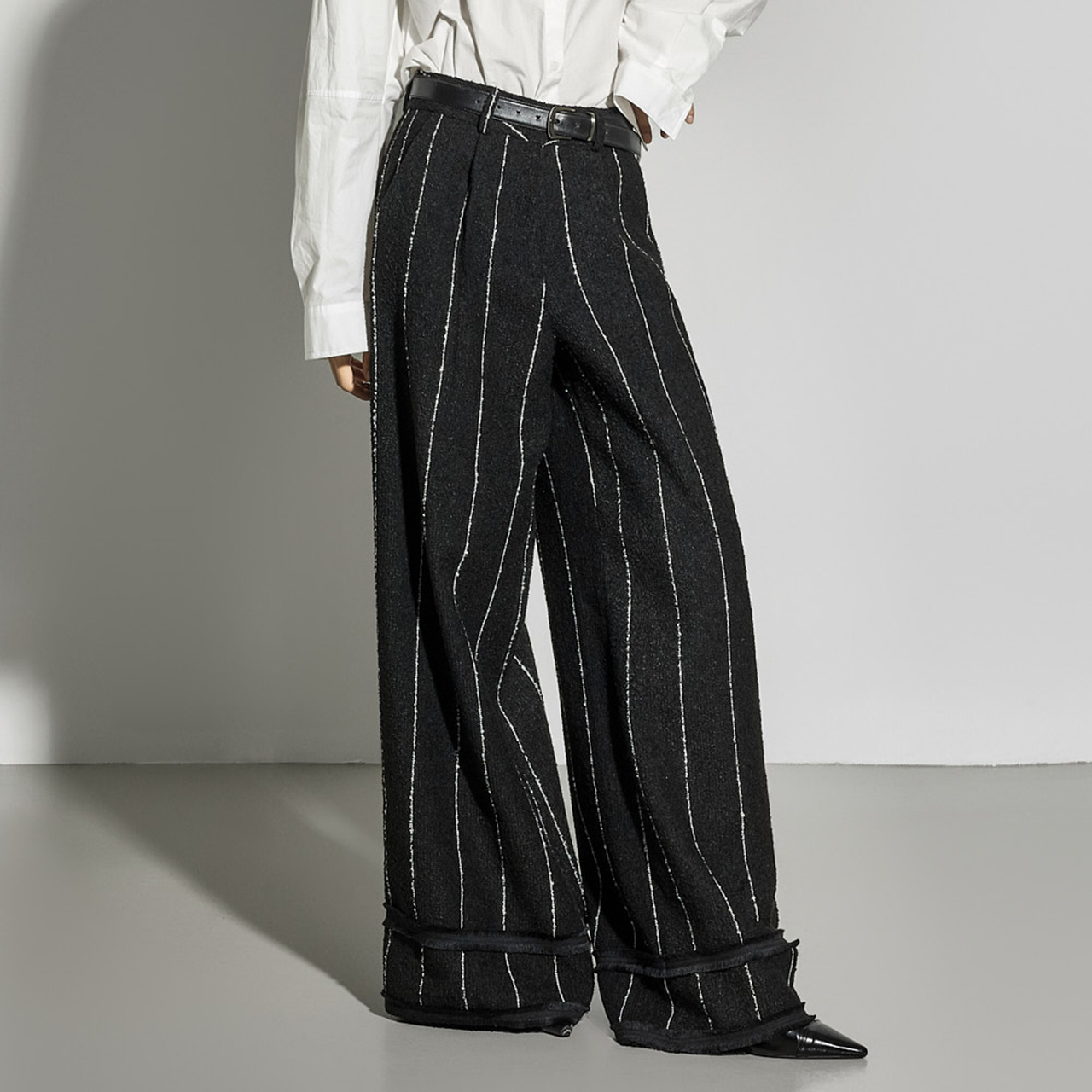 这是一款时尚感十足的条纹西装裤。 采用聚酯纤维与羊毛混纺材质制作,质地结实,同时带来温暖舒适的穿着感。 羊毛特有的细腻质感增添高级感,宽松的阔腿版型既舒适又打造精致廓形。 竖条纹图案视觉上拉长双腿,裤脚翻边设计增添经典亮点。 通过稳固支撑臀部与腰部的结构裁片,提升整体完成度。 与同材质西装外套搭配可呈现更加时尚、现代的套装造型,也可单穿,轻松驾驭从正式装到潮流休闲装的多种造型。 173CM模特身穿S码,BLACK色。