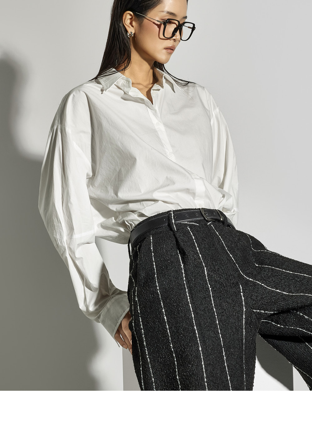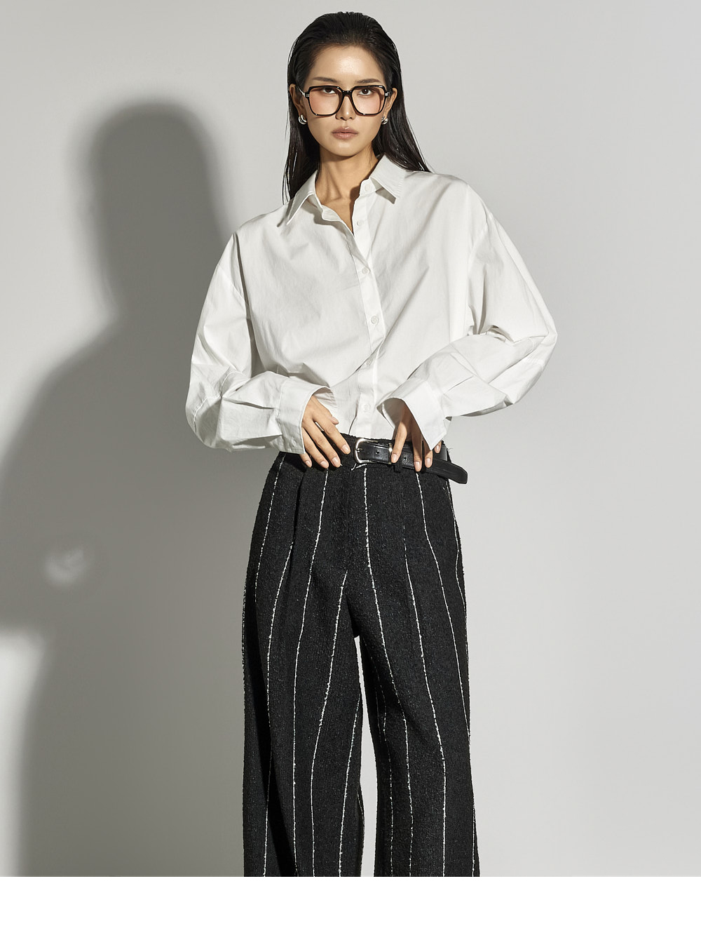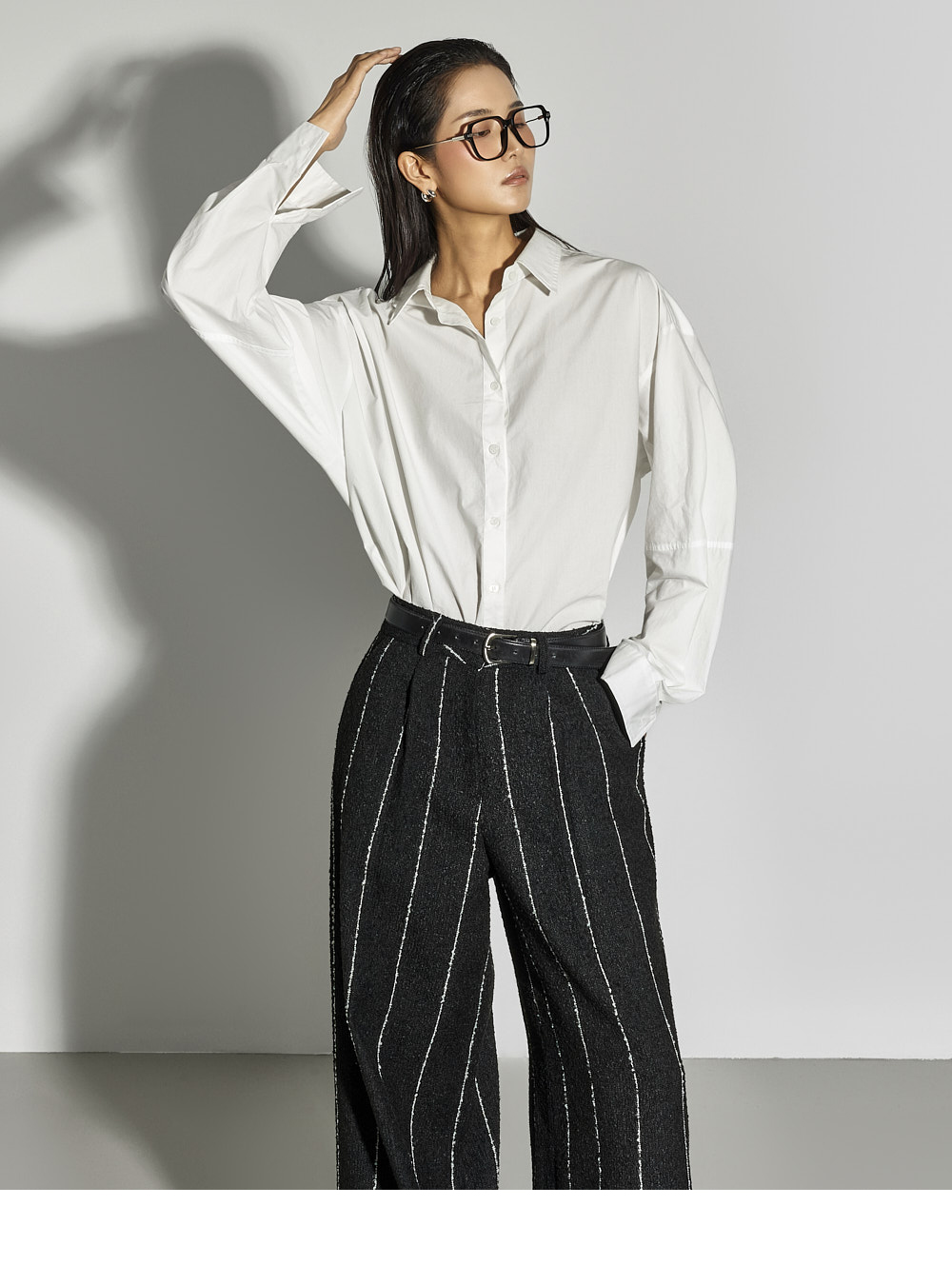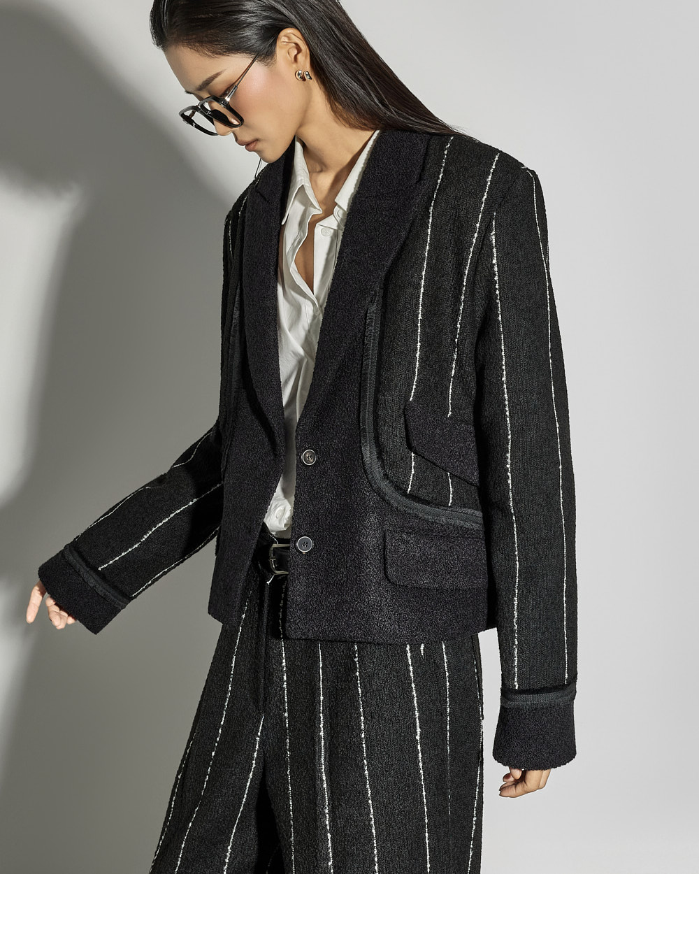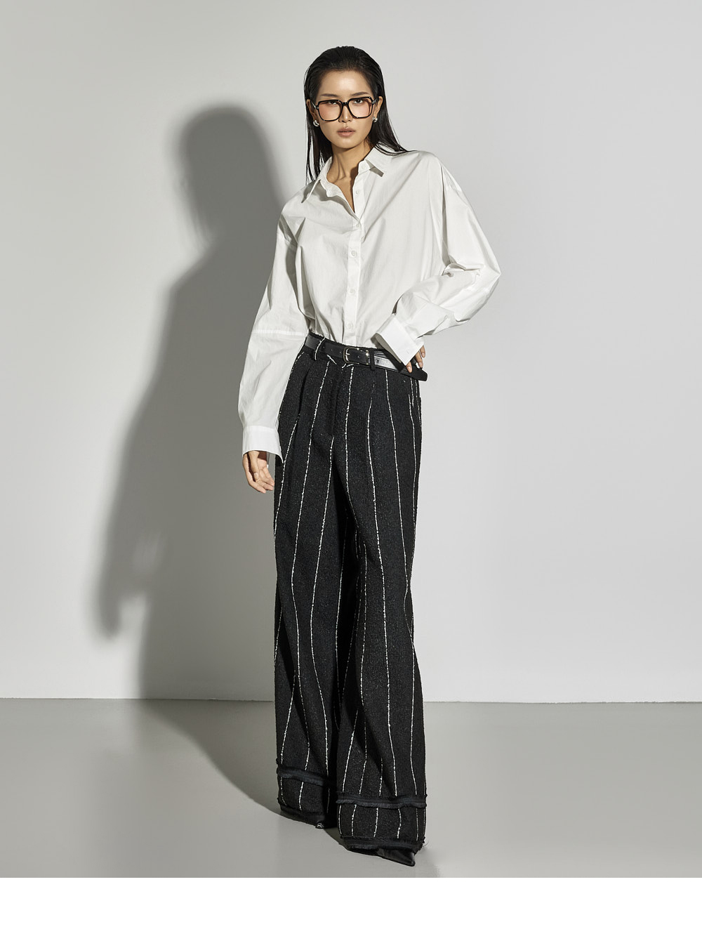 这是一款时尚感十足的条纹西装裤。 采用聚酯纤维与羊毛混纺材质制作,质地结实,同时带来温暖舒适的穿着感。 羊毛特有的细腻质感增添高级感,宽松的阔腿版型既舒适又打造精致廓形。 竖条纹图案视觉上拉长双腿,裤脚翻边设计增添经典亮点。 通过稳固支撑臀部与腰部的结构裁片,提升整体完成度。 与同材质西装外套搭配可呈现更加时尚、现代的套装造型,也可单穿,轻松驾驭从正式装到潮流休闲装的多种造型。 173CM模特身穿S码,BLACK色。