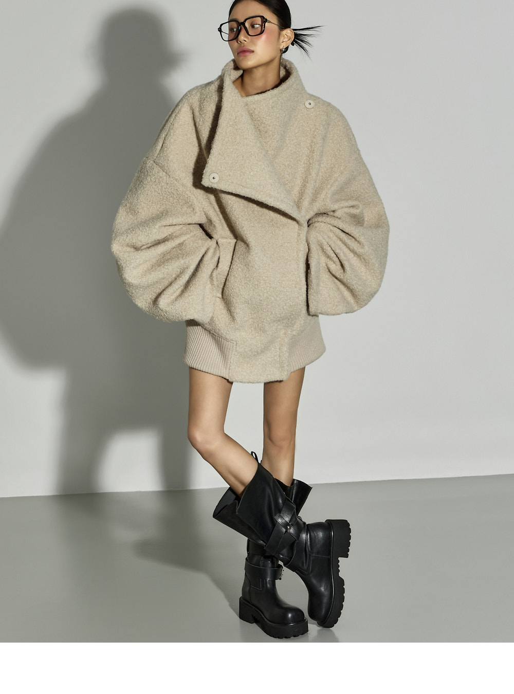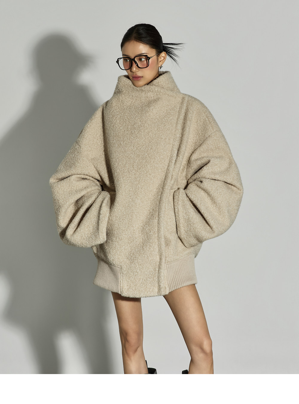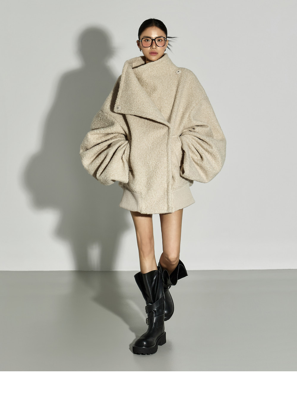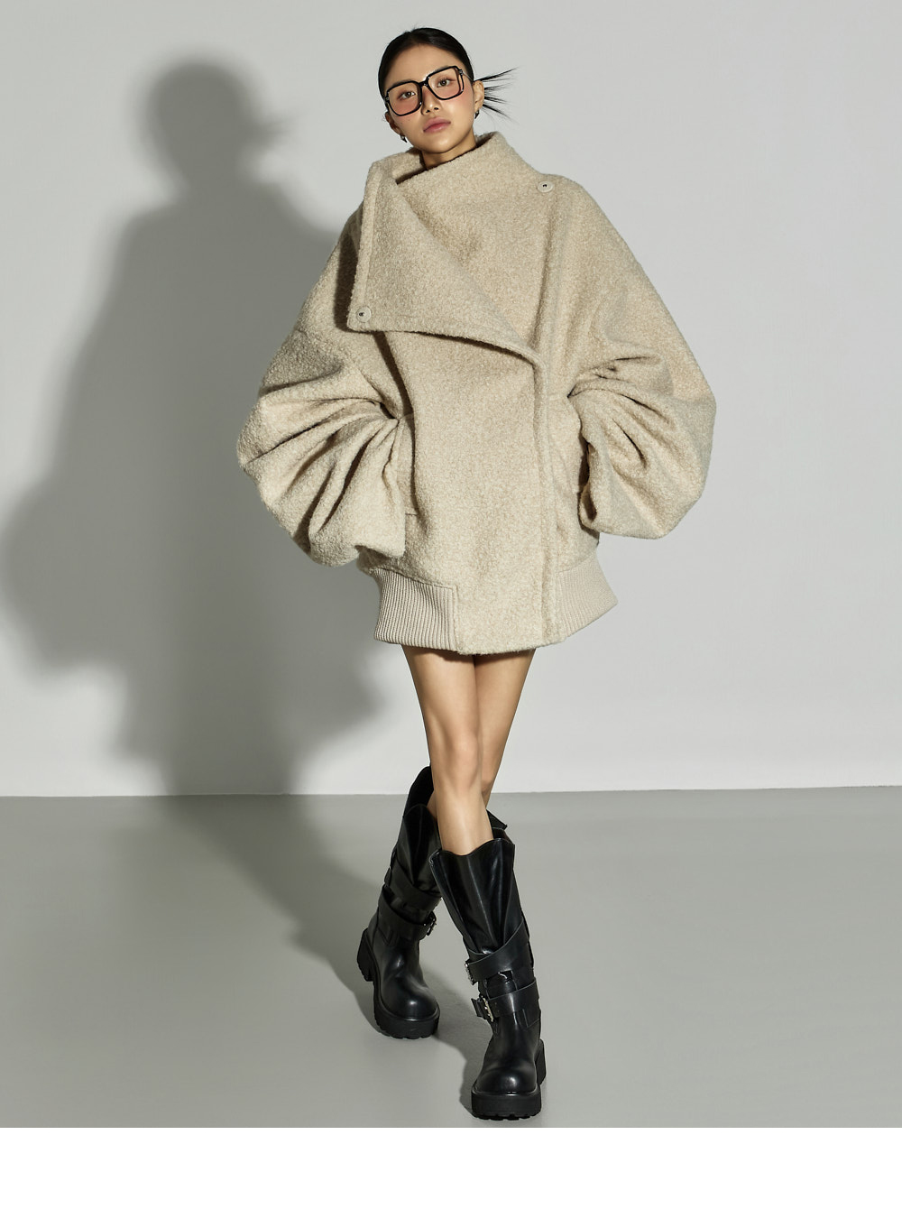 宽松版型搭配袖口褶皱设计,营造出有层次感且时尚的轮廓。