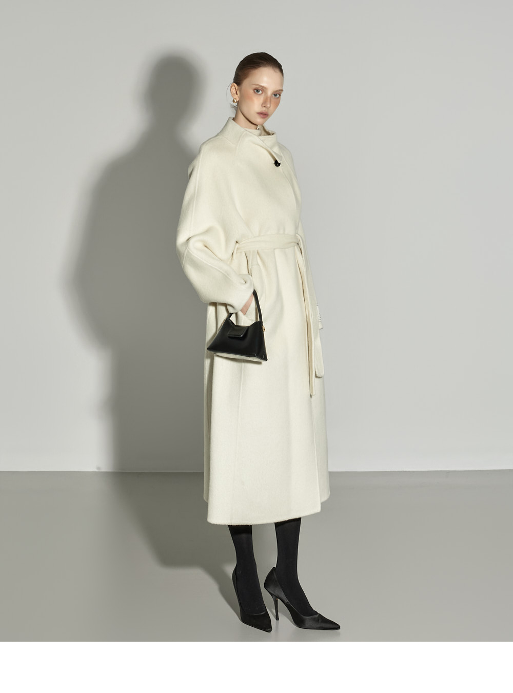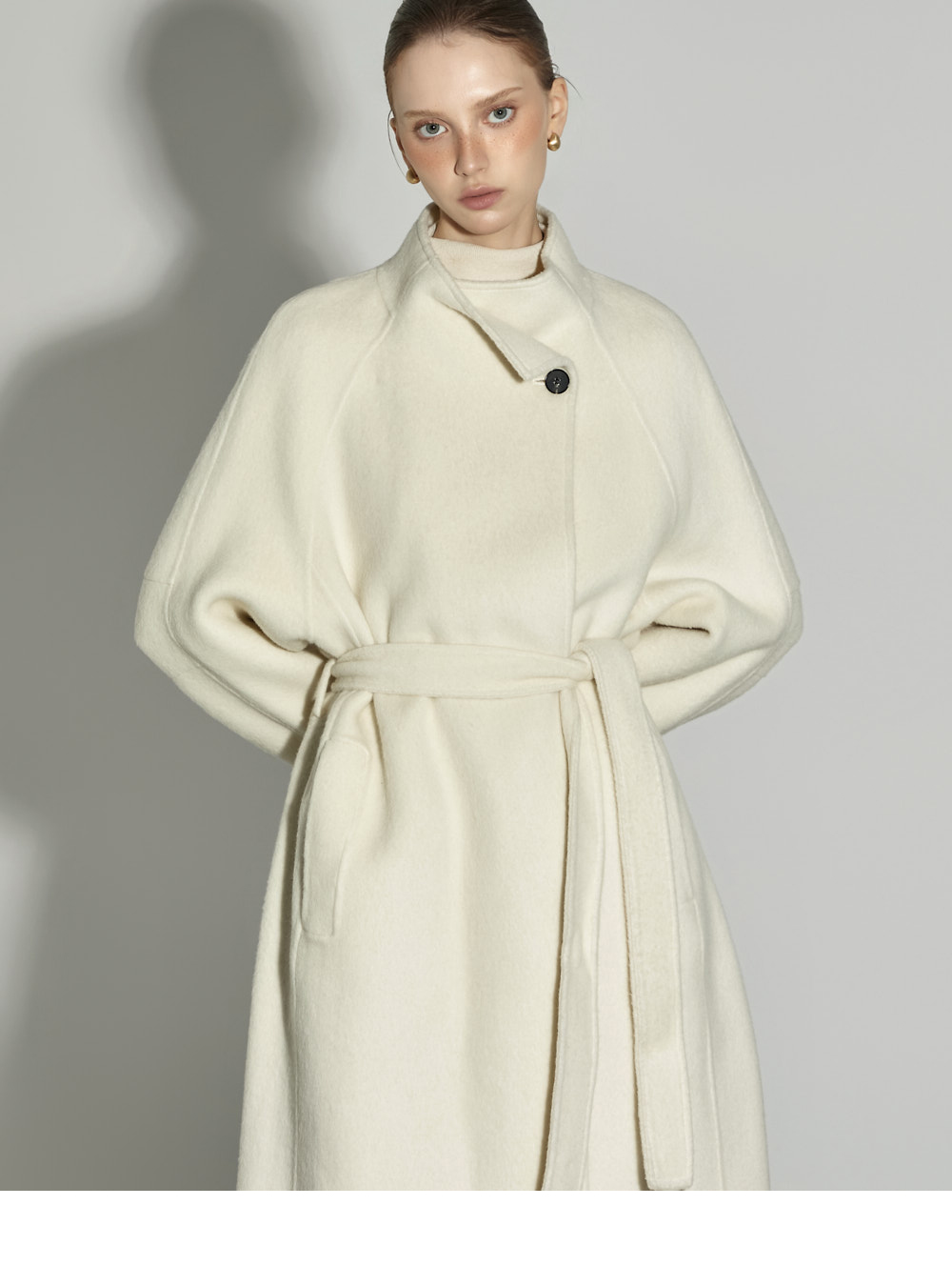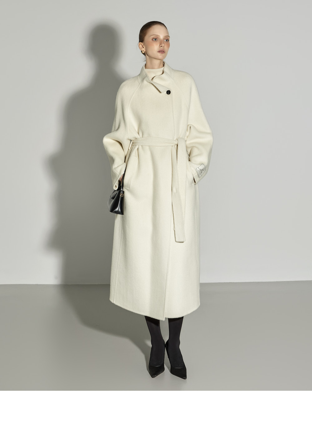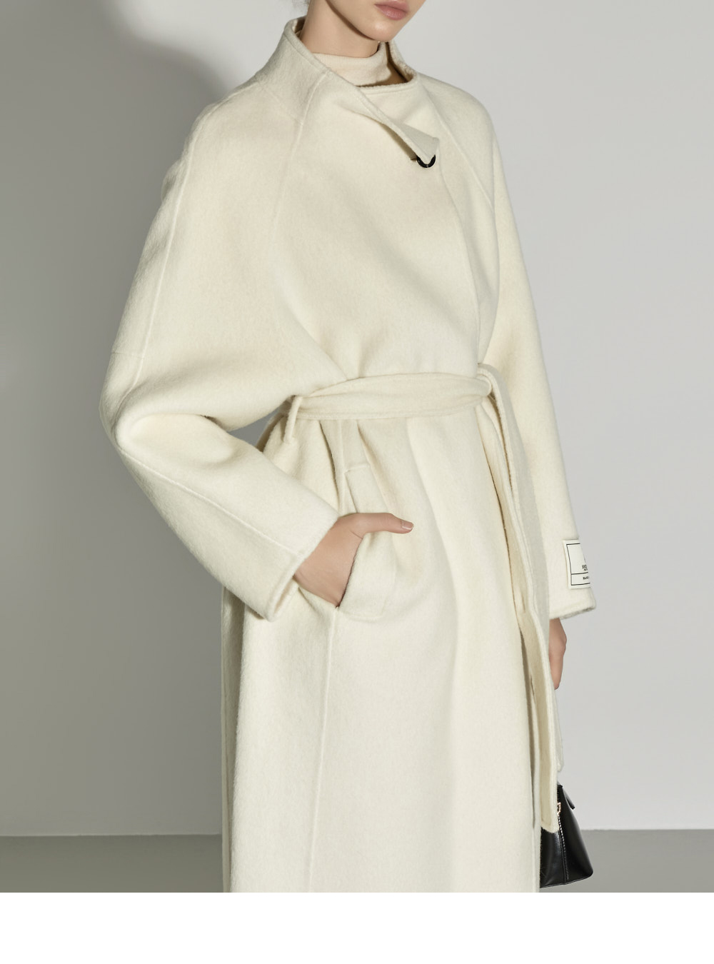 这是一款散发出现代气息的高领长款大衣。 采用羊毛与人造丝混纺面料制成,触感柔软舒适,保暖又轻盈,从换季时节到初冬皆可轻松驾驭。 高领设计与宽松版型相结合,营造出舒适又高级的氛围,搭配腰带与内扣开合设计,可自由调节,展现多样造型。 背部开衩与两侧口袋细节的加入,提升了实穿性与活动便利性。 174CM 模特穿着 M(ONE) 尺码,IVORY 颜色。