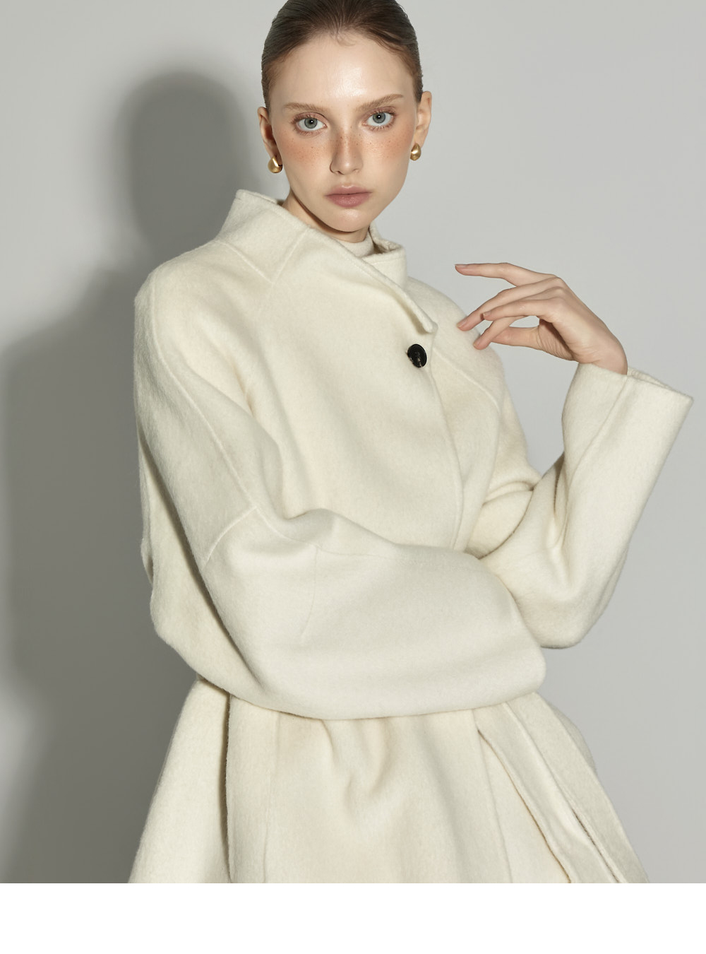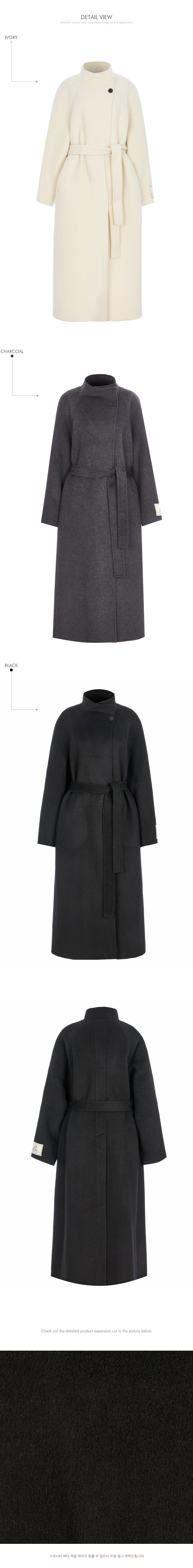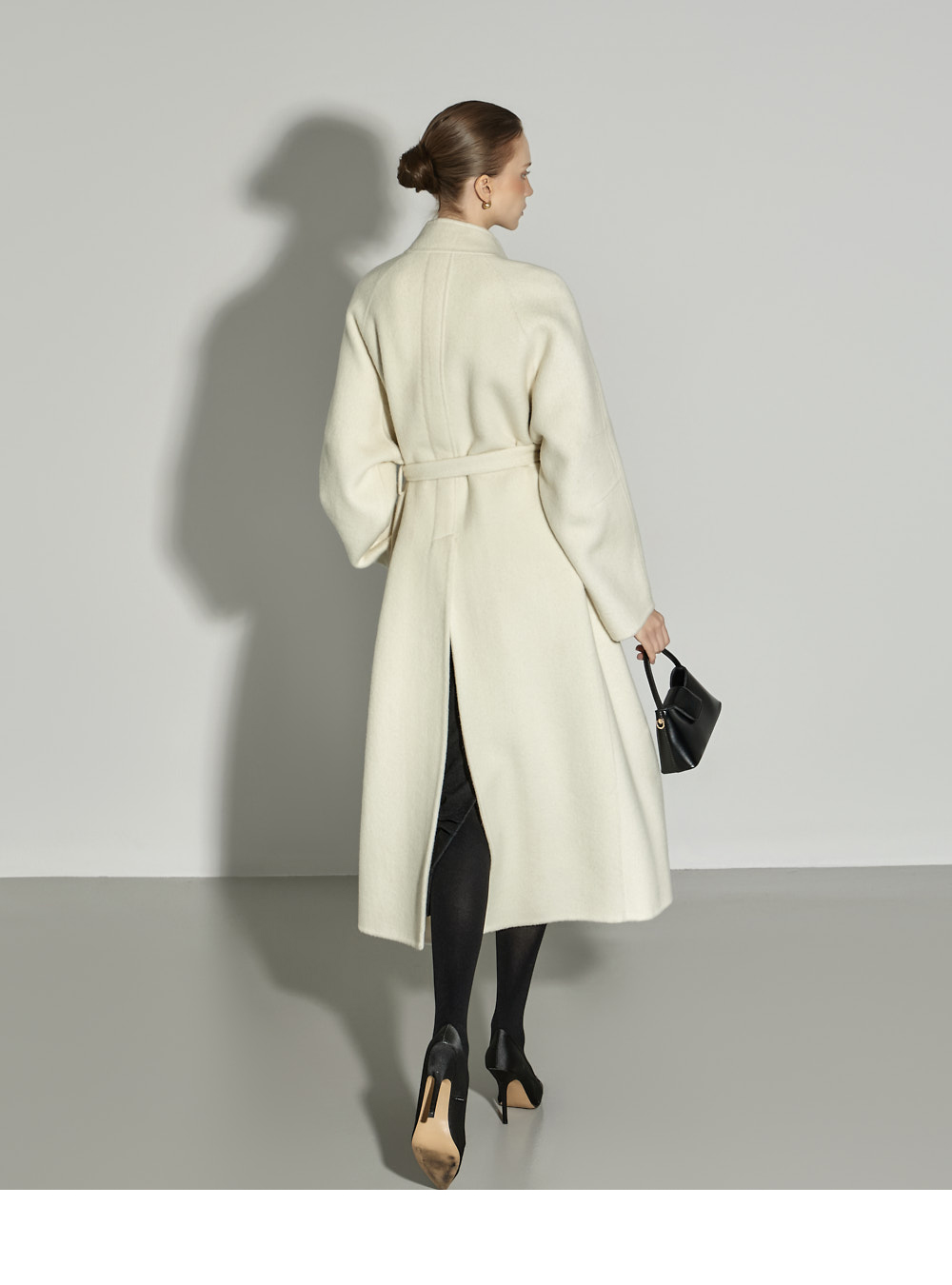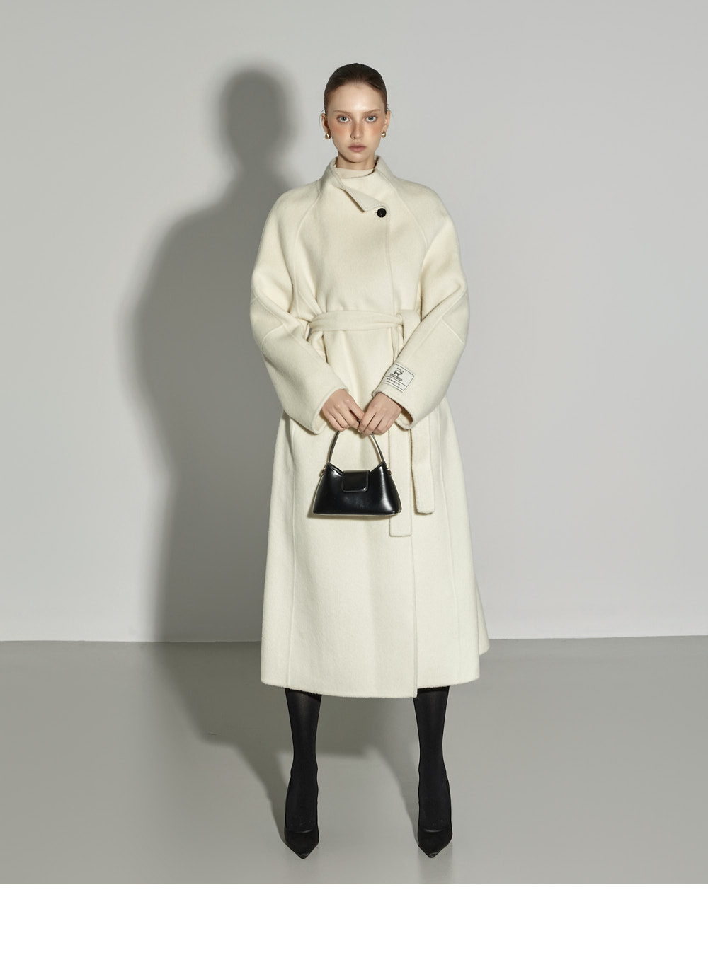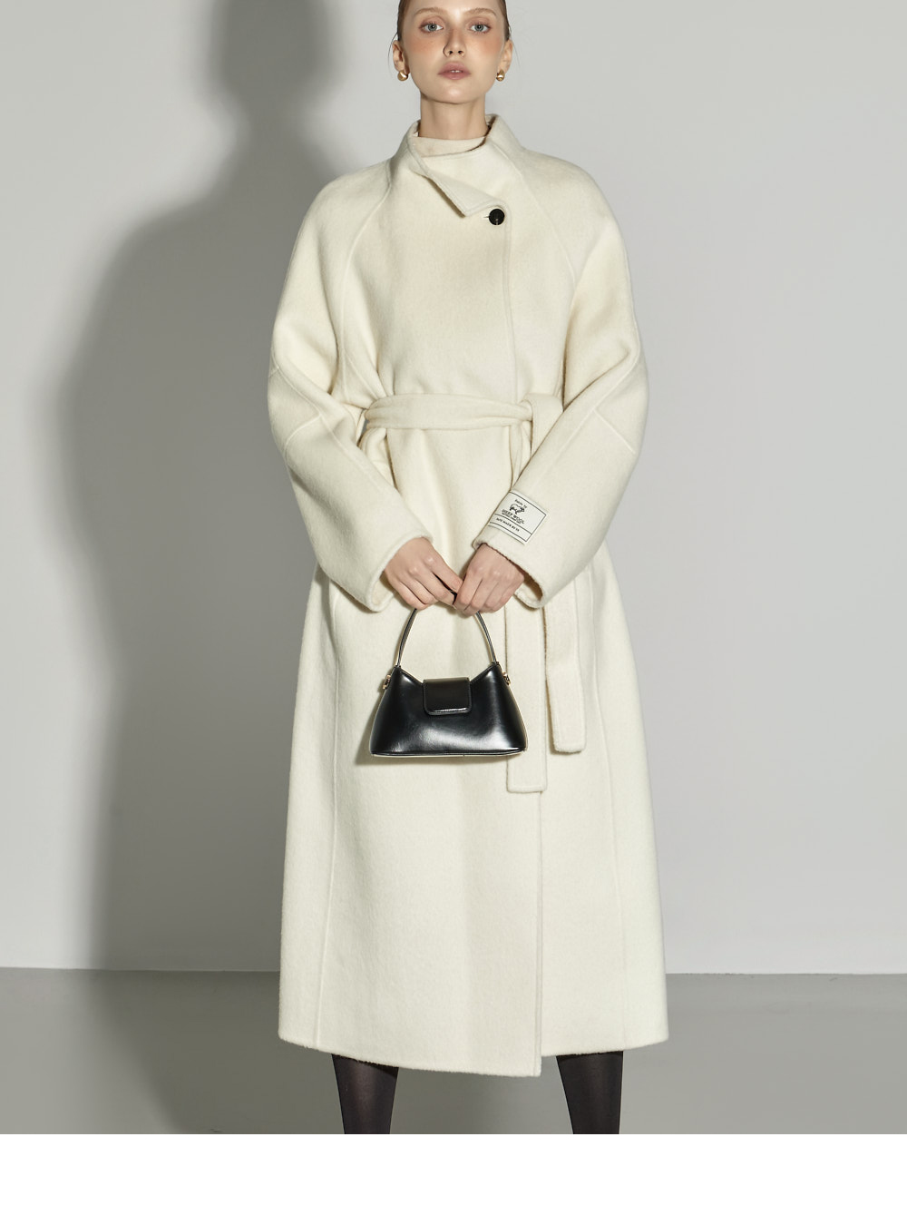 这是一款散发出现代气息的高领长款大衣。 采用羊毛与人造丝混纺面料制成,触感柔软舒适,保暖又轻盈,从换季时节到初冬皆可轻松驾驭。 高领设计与宽松版型相结合,营造出舒适又高级的氛围,搭配腰带与内扣开合设计,可自由调节,展现多样造型。 背部开衩与两侧口袋细节的加入,提升了实穿性与活动便利性。 174CM 模特穿着 M(ONE) 尺码,IVORY 颜色。