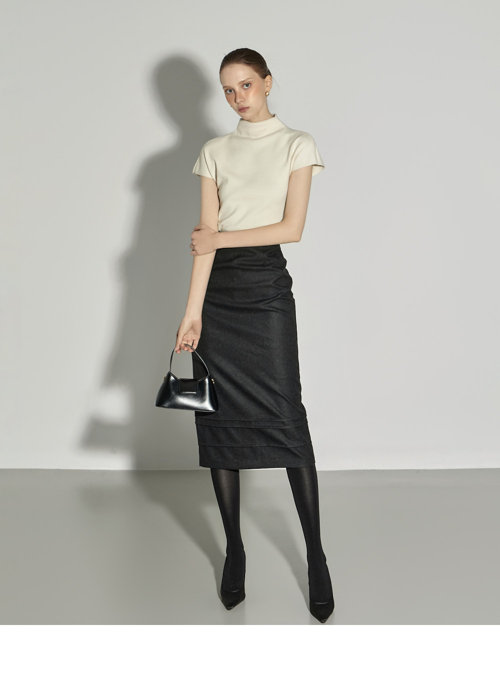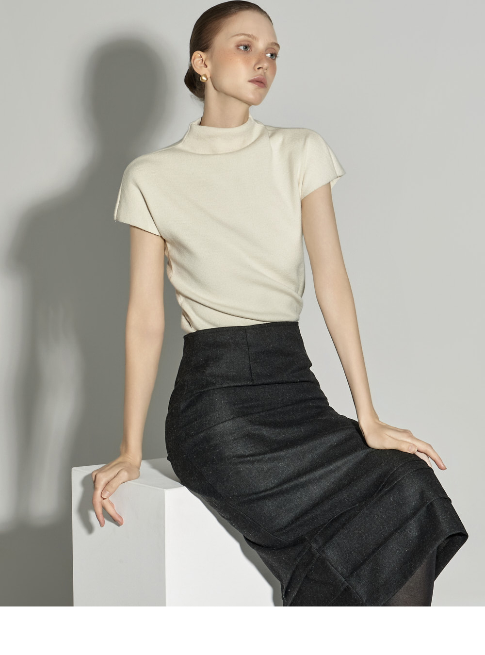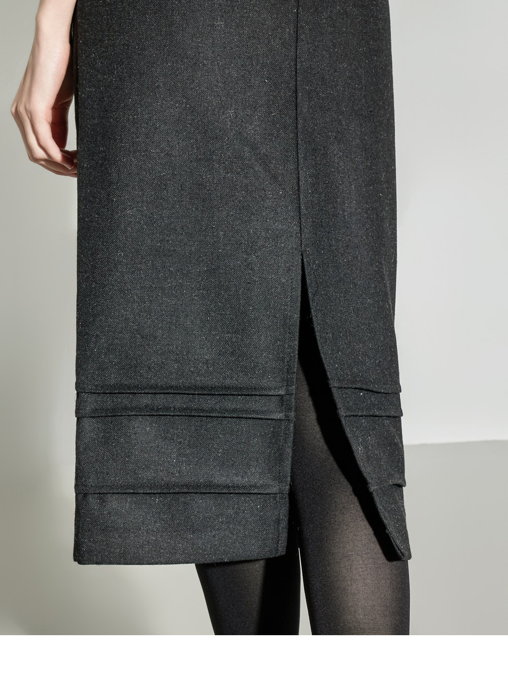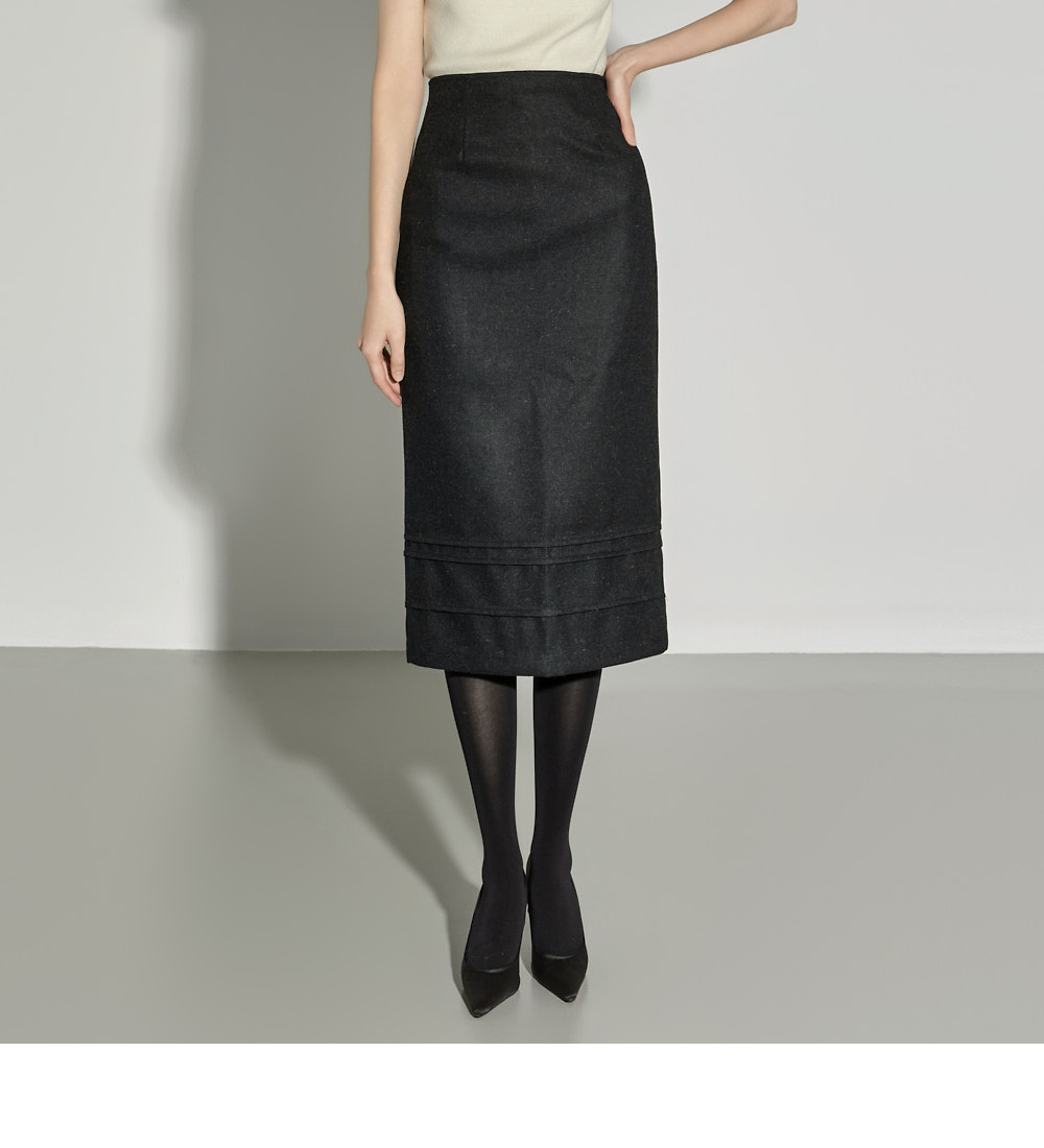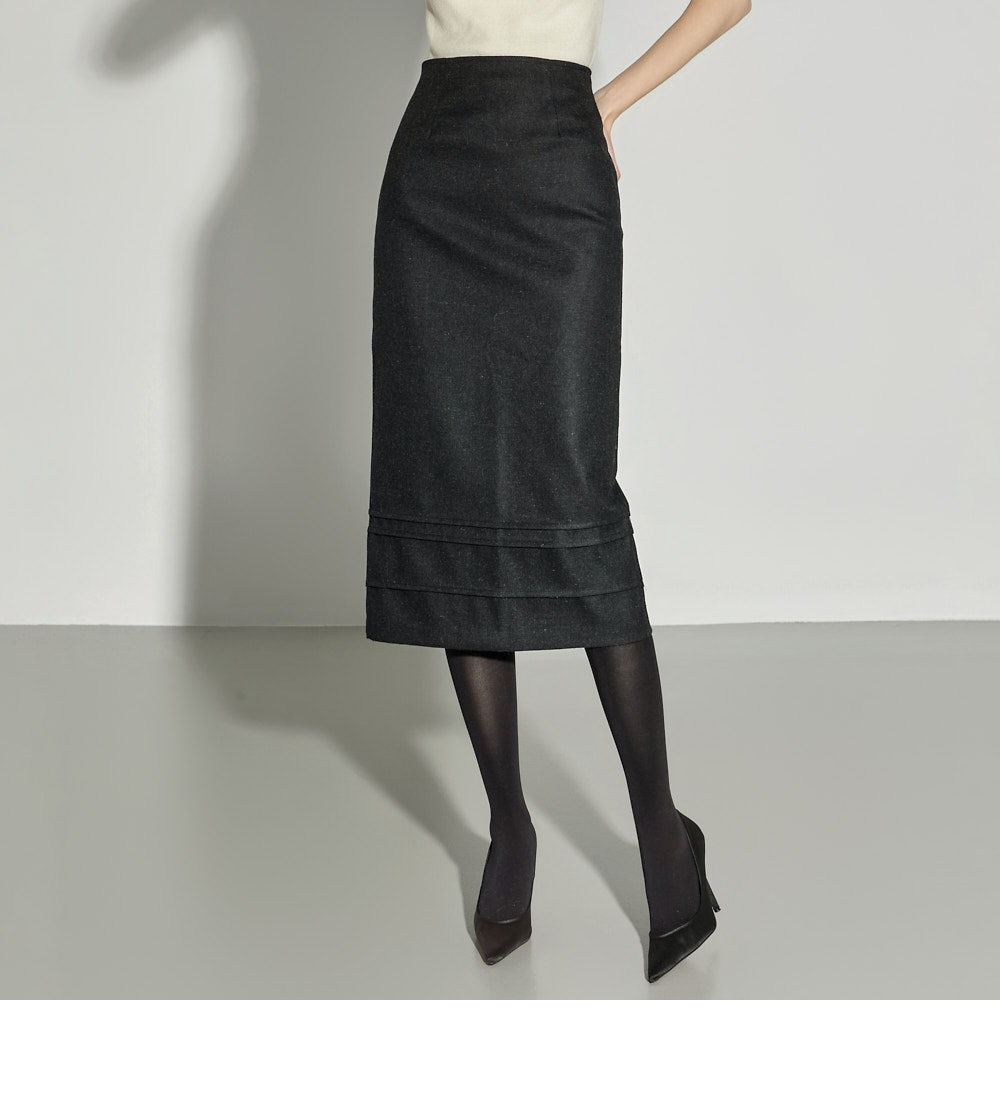休闲风格的羊毛半身裙。采用聚酯纤维与羊毛混纺面料制作,穿着时既温暖又结实舒适。修身的H型裙身展现干练整洁的氛围,下摆前褶设计增添精致感。后拉链开合与后中开衩设计提高活动便利性,局部内衬处理让穿着无透视顾虑,舒适安心。无论搭配正式夹克还是休闲上衣都非常合适,可用于日常穿搭或办公造型。174CM 模特 S 尺码,黑色。