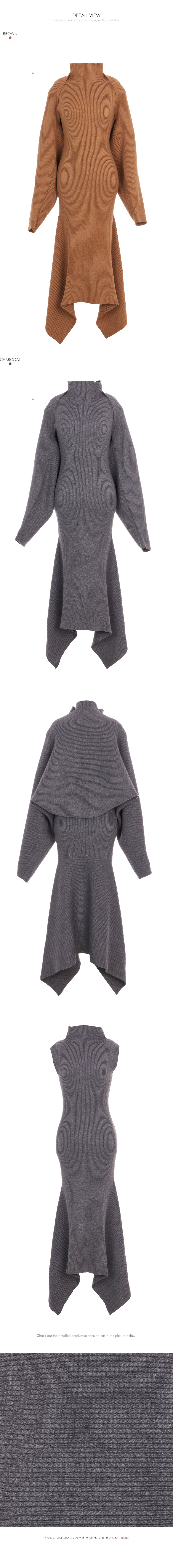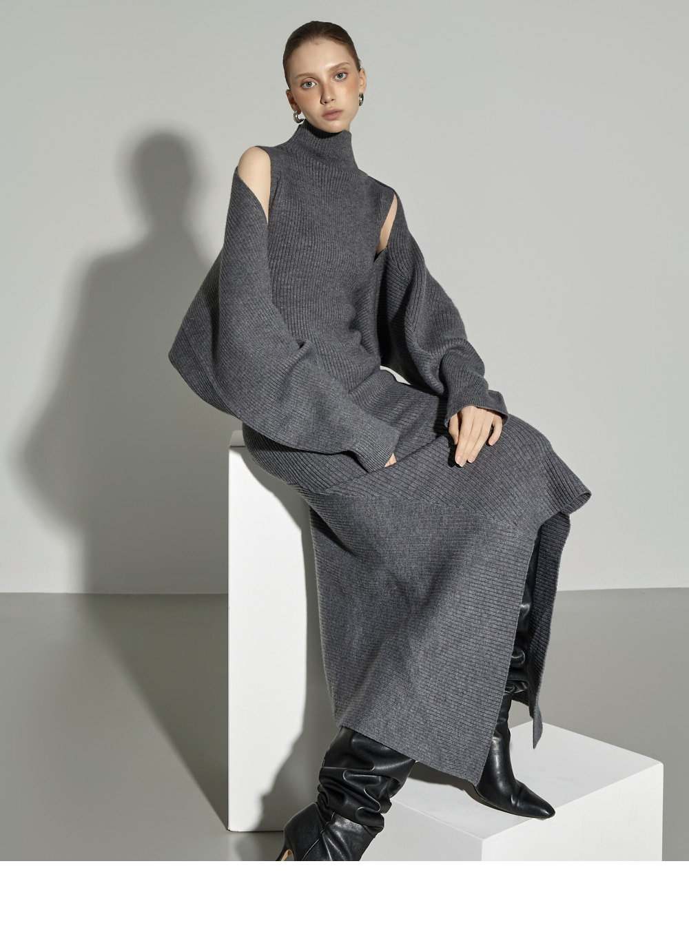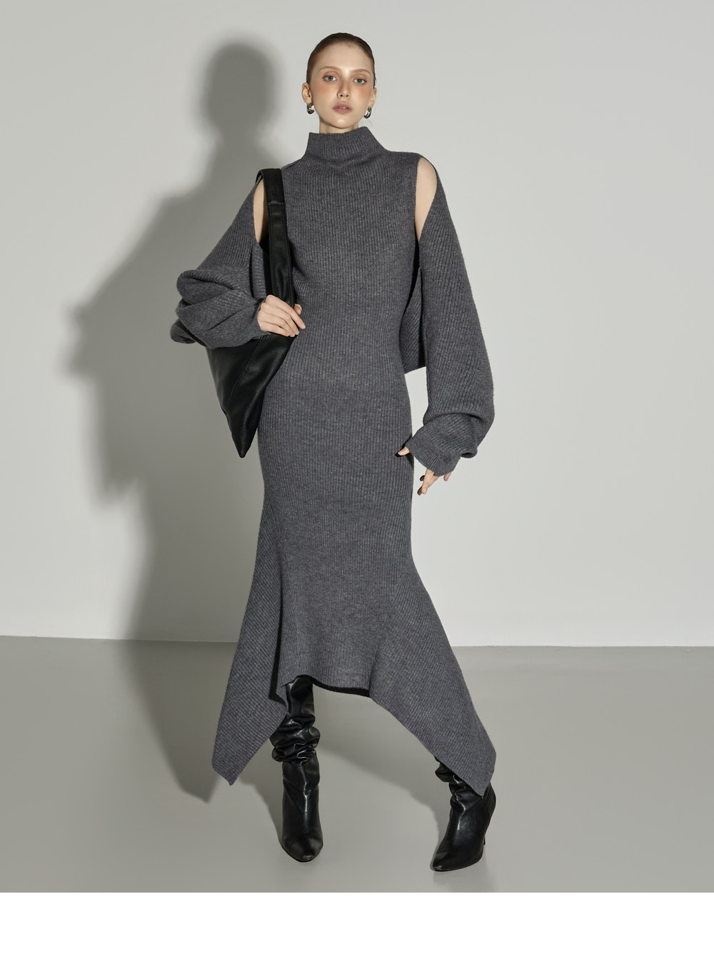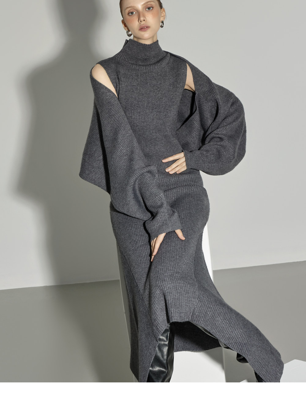 套装包含长款无袖针织连衣裙与不规则下摆设计的针织披肩,可单穿即可呈现完整造型。