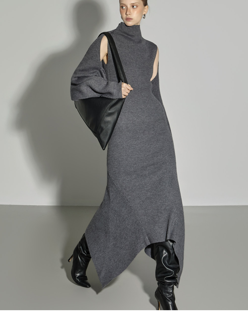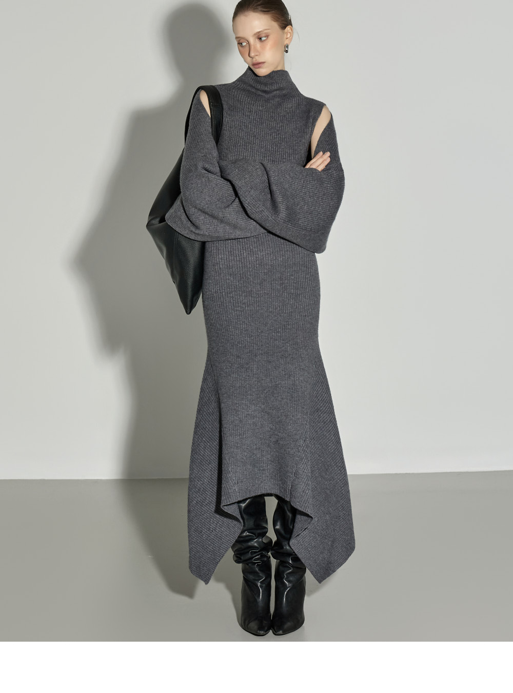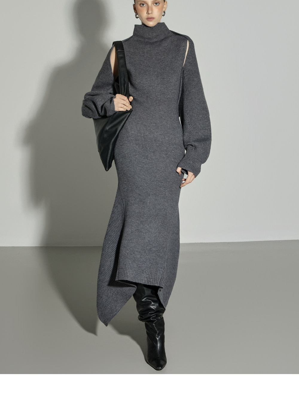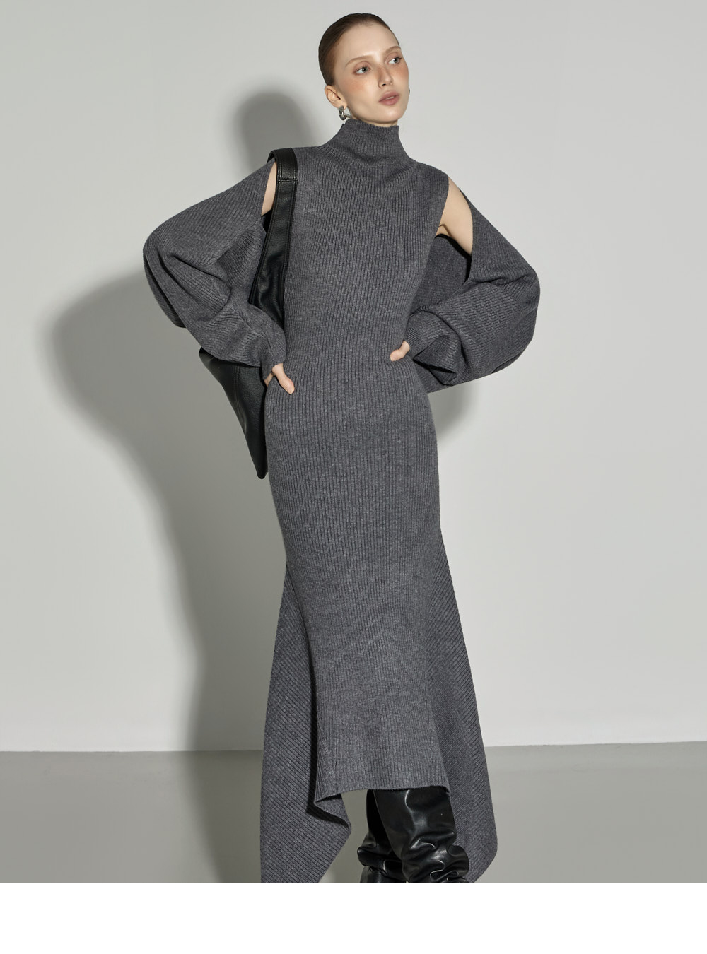 套装包含长款无袖针织连衣裙与不规则下摆设计的针织披肩,可单穿即可呈现完整造型。