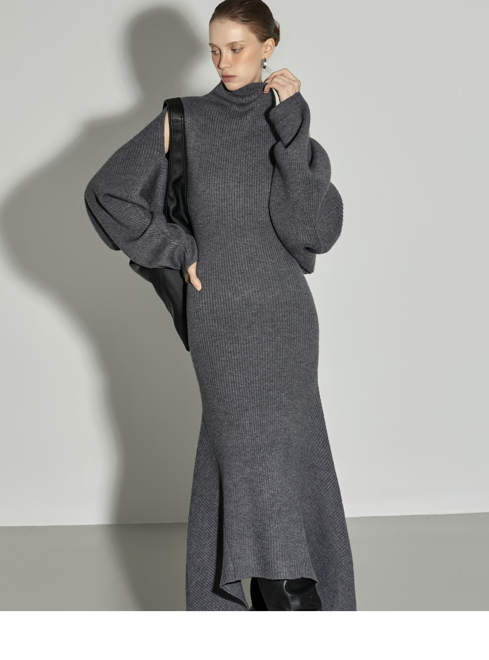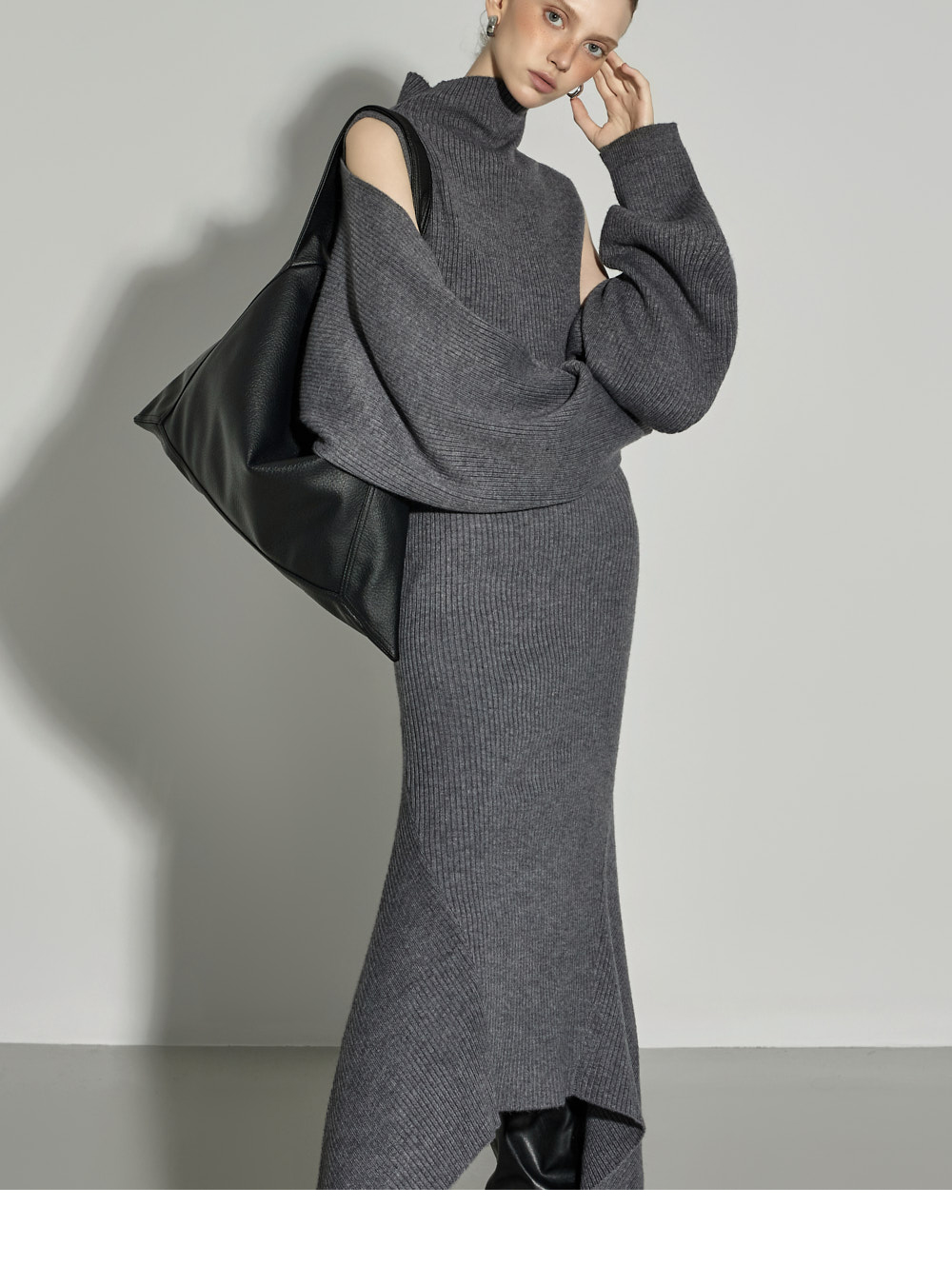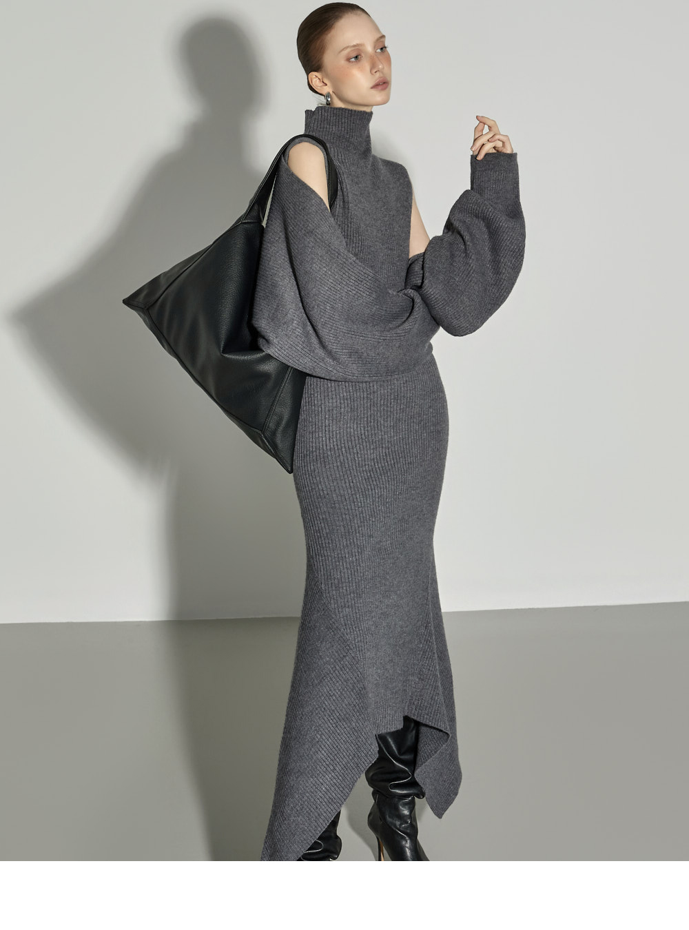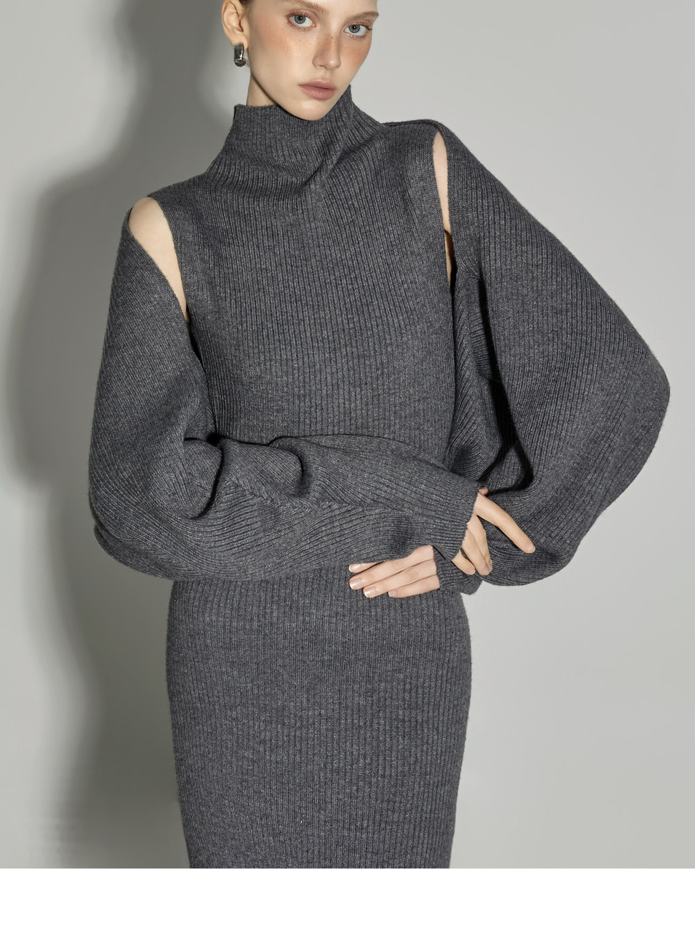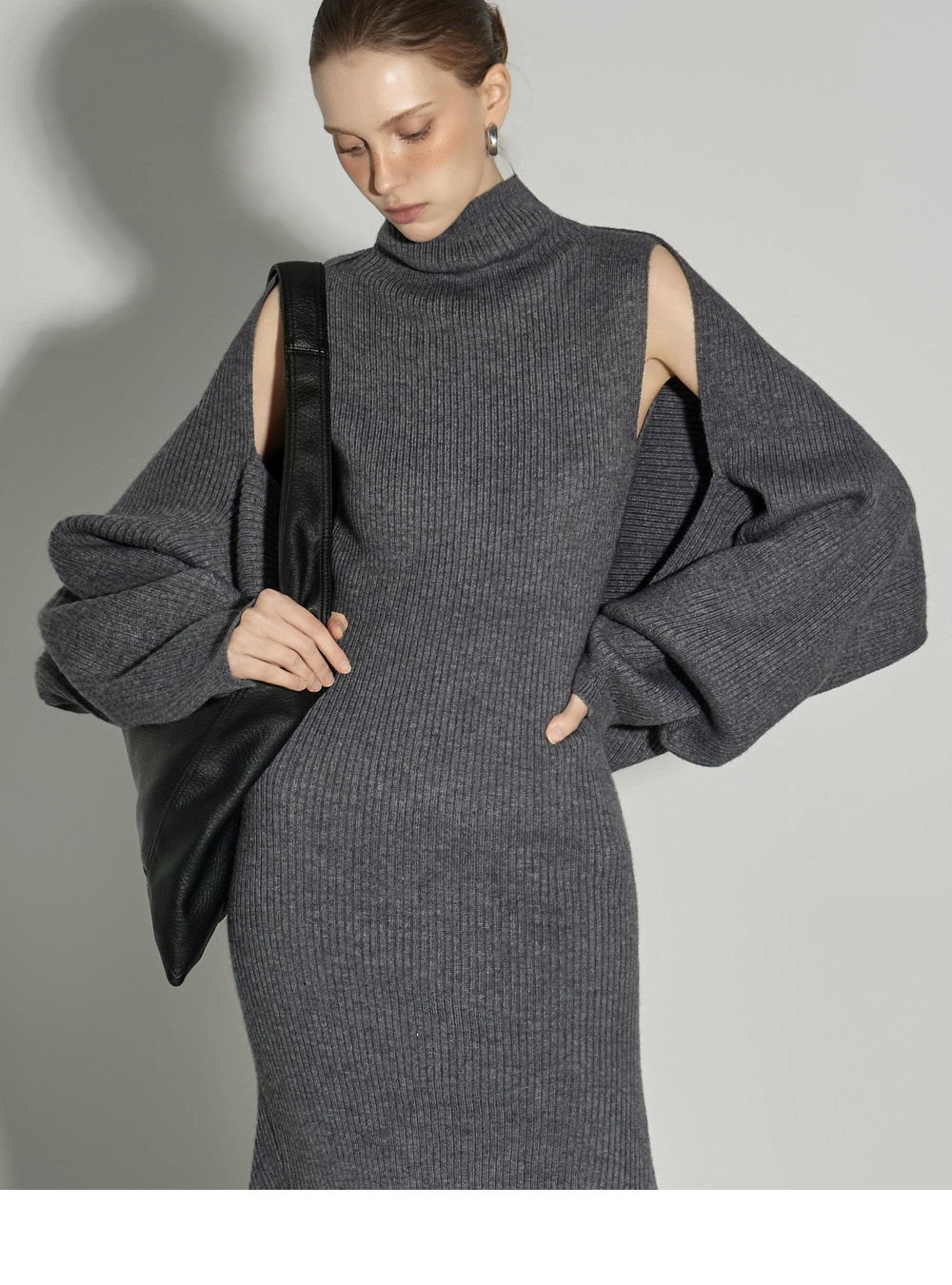 套装包含长款无袖针织连衣裙与不规则下摆设计的针织披肩,可单穿即可呈现完整造型。