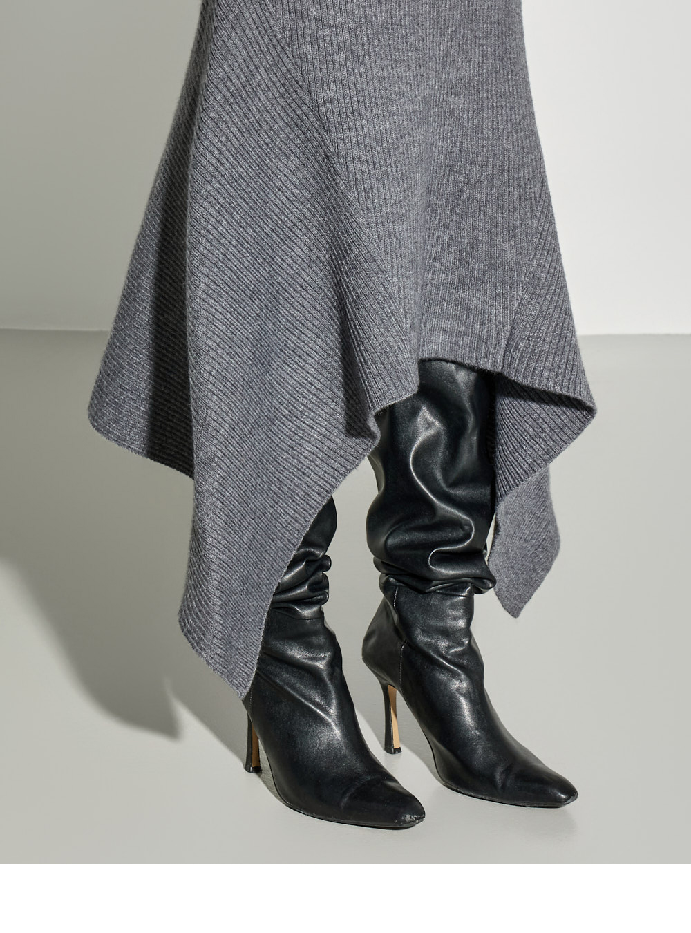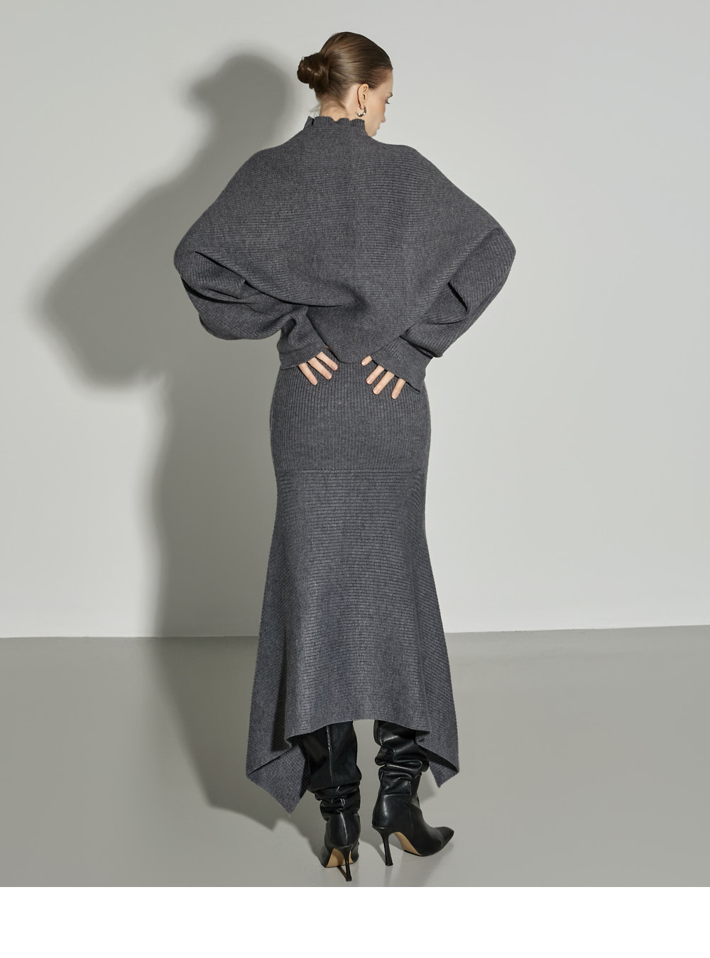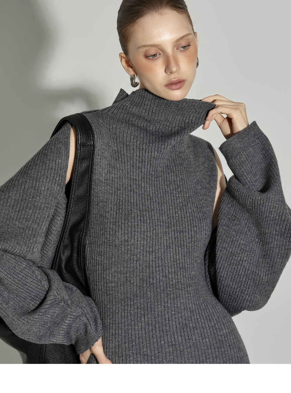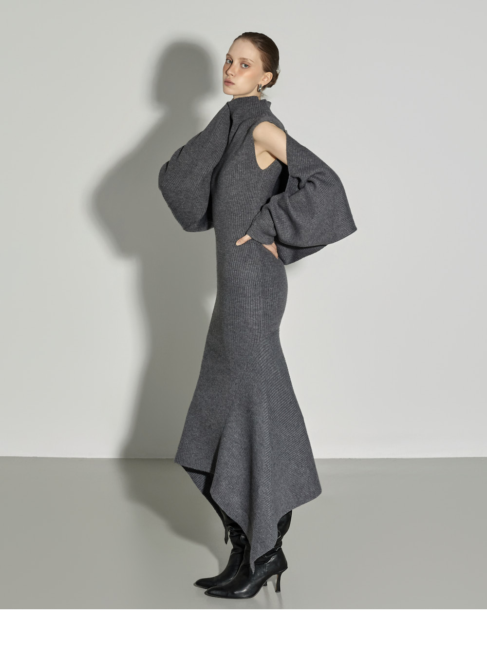 套装包含长款无袖针织连衣裙与不规则下摆设计的针织披肩,可单穿即可呈现完整造型。
