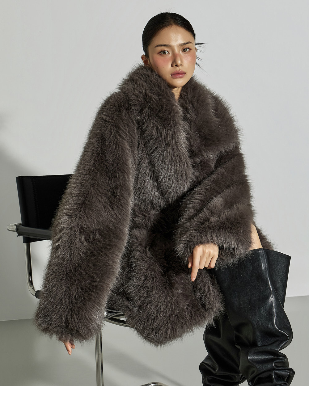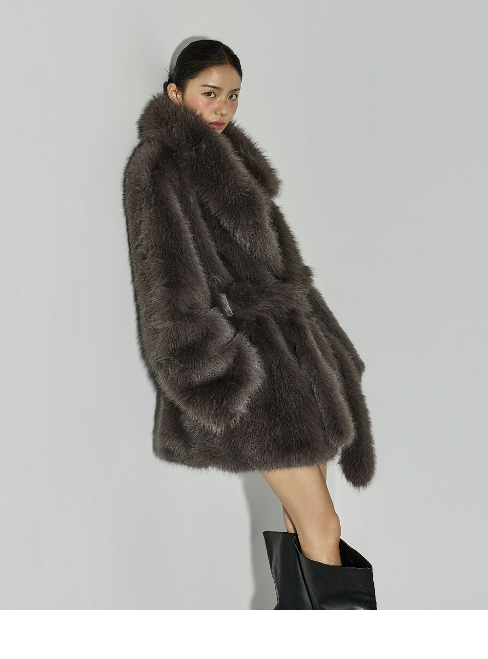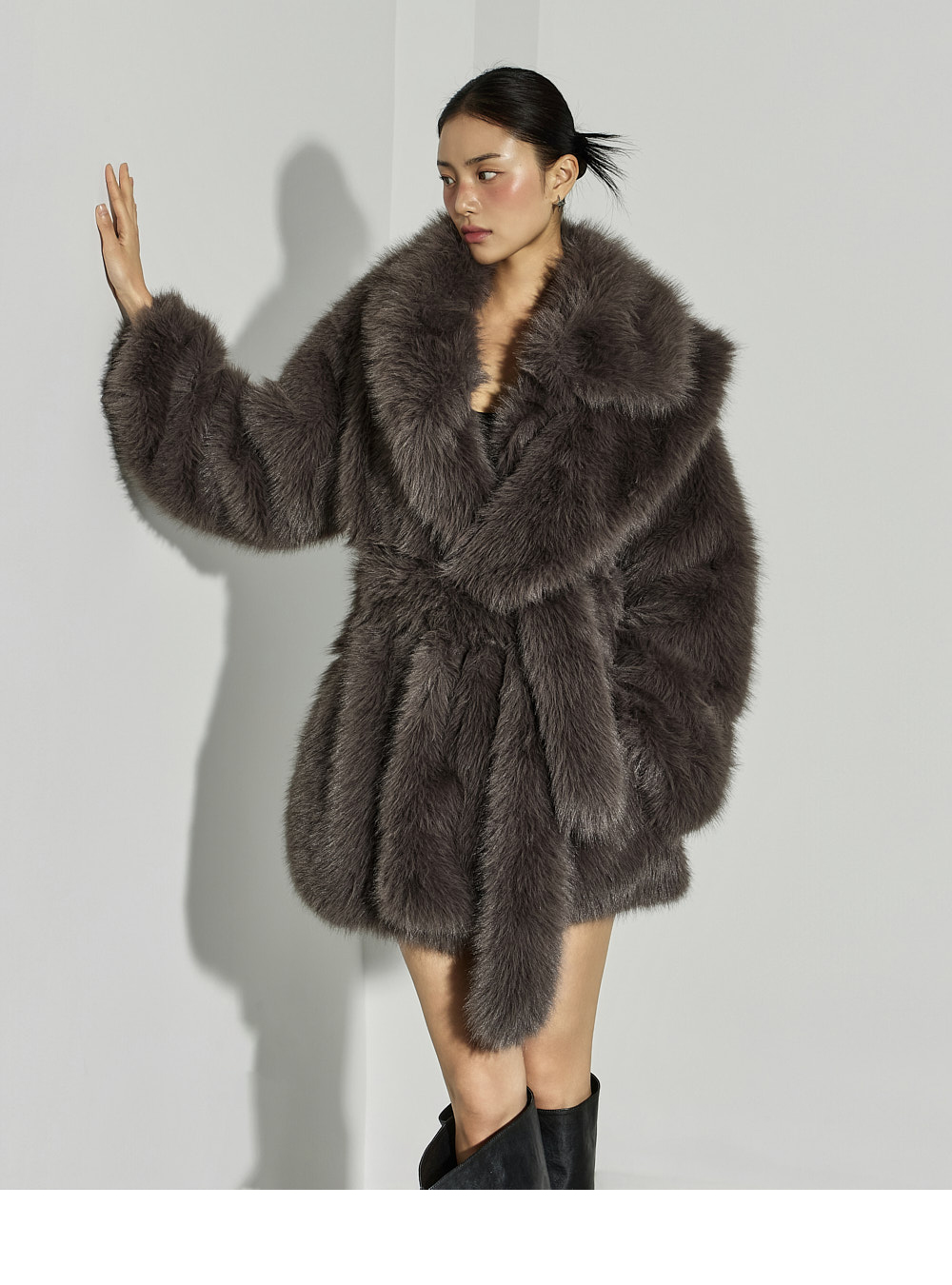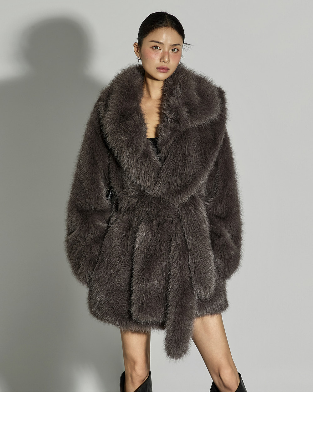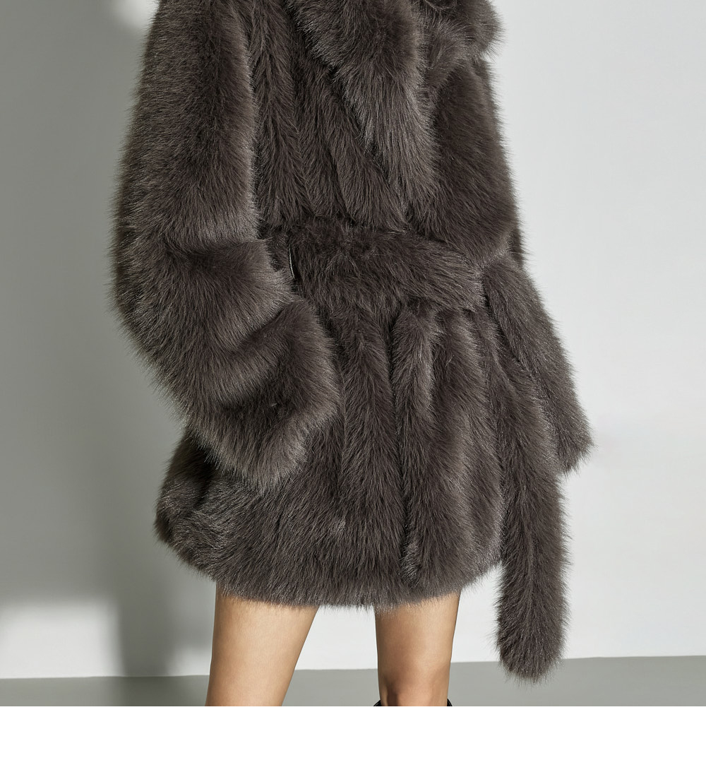 这是一款散发优雅气质的夹克。采用聚酯纤维面料制成,触感柔软,质地轻盈,带来舒适的穿着体验。仿皮草材质特有的柔软与温暖质感,加上 ONE 尺码设计,宽松版型自然垂坠,塑造出干练又时尚的轮廓。配有腰带,可调节腰线,轻松打造多样化的造型,不对称翻领设计更增添独特亮点。基础配色便于搭配,无论是日常造型还是正式穿搭都能轻松驾驭。这款融合了精致与个性美感的单品,是秋冬季节值得推荐的亮点外套。174CM 模特穿着 ONE 尺码,深灰色。