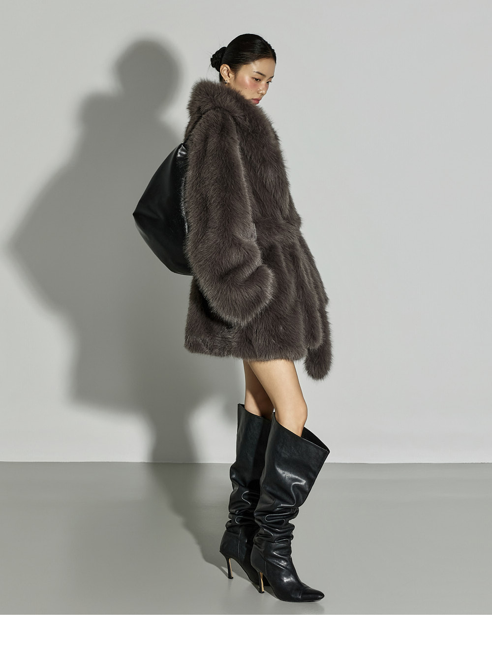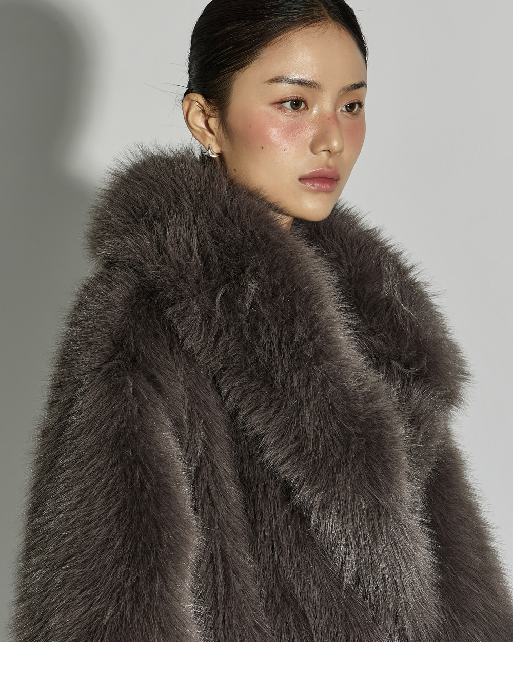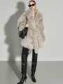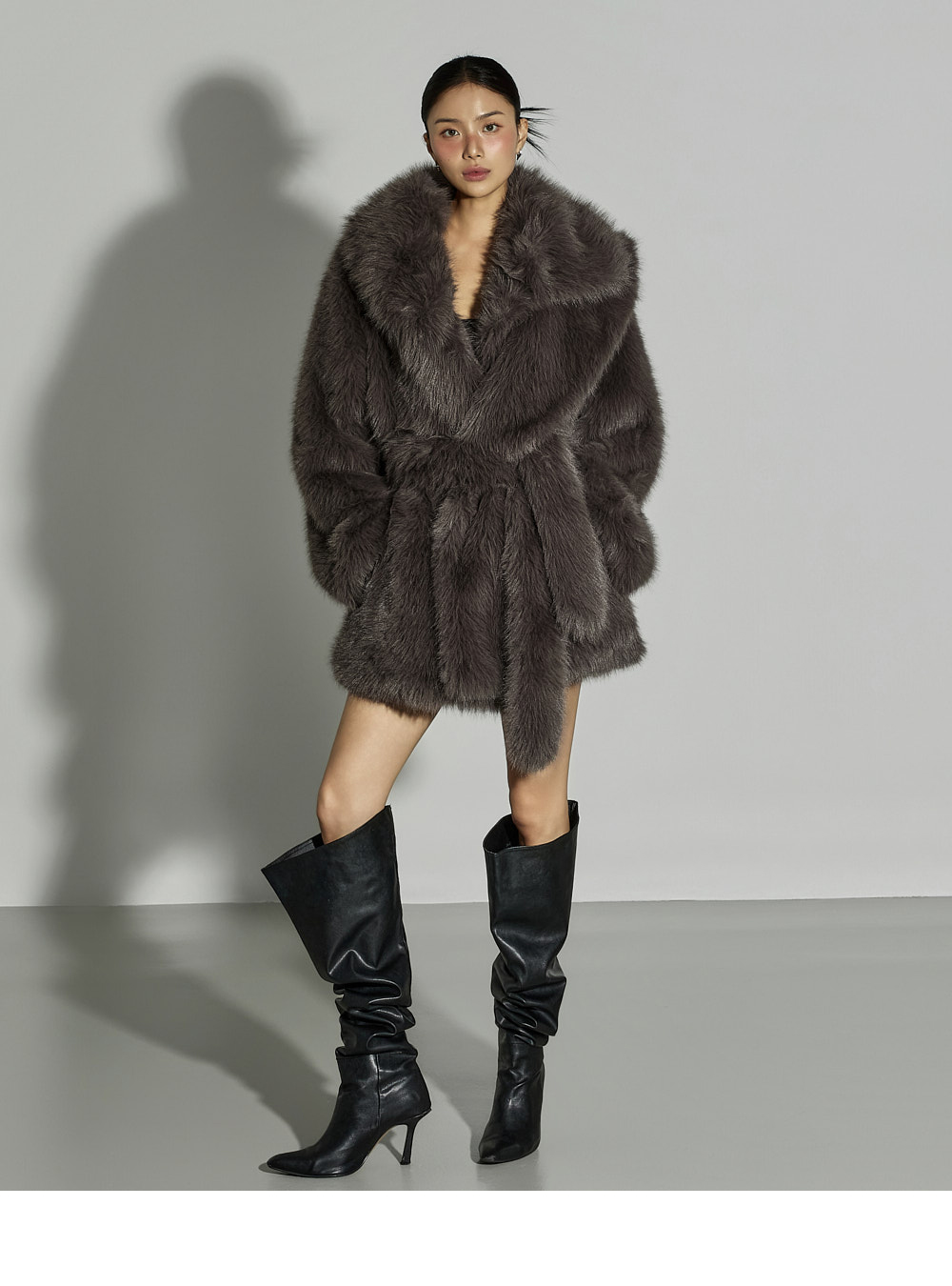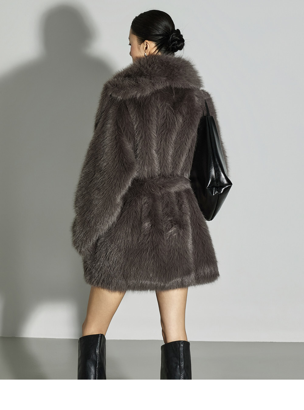 这是一款散发优雅气质的夹克。采用聚酯纤维面料制成,触感柔软,质地轻盈,带来舒适的穿着体验。仿皮草材质特有的柔软与温暖质感,加上 ONE 尺码设计,宽松版型自然垂坠,塑造出干练又时尚的轮廓。配有腰带,可调节腰线,轻松打造多样化的造型,不对称翻领设计更增添独特亮点。基础配色便于搭配,无论是日常造型还是正式穿搭都能轻松驾驭。这款融合了精致与个性美感的单品,是秋冬季节值得推荐的亮点外套。174CM 模特穿着 ONE 尺码,深灰色。