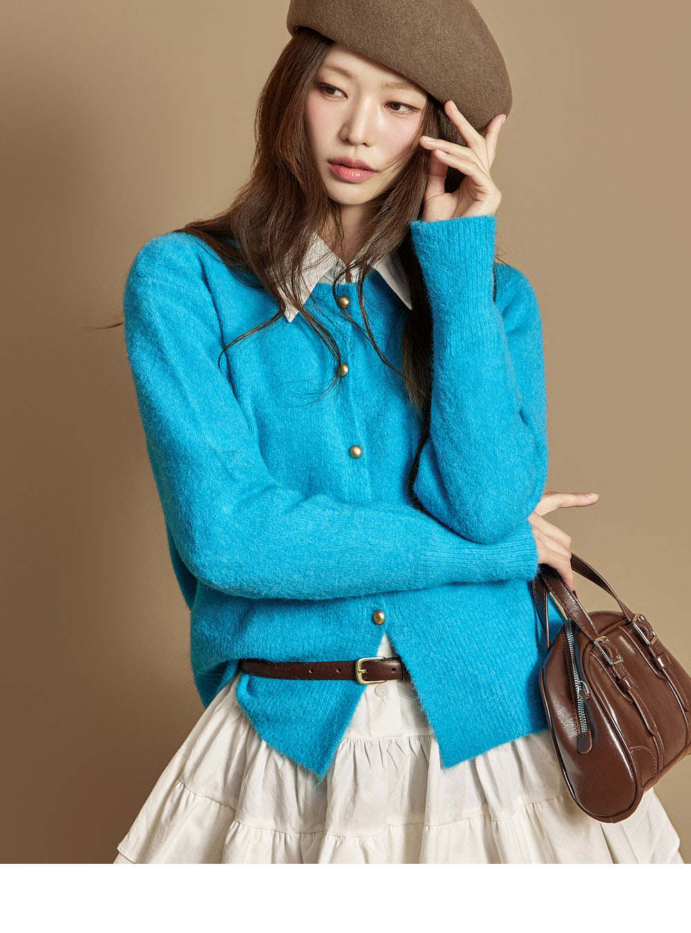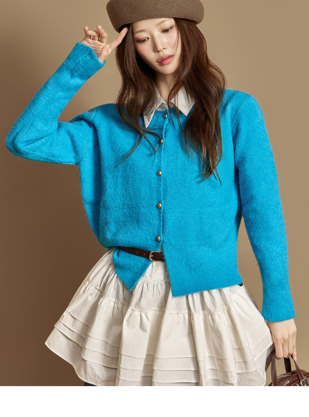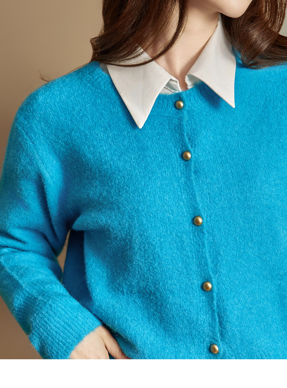 这是一款休闲日常风格的软质纽扣开衫。