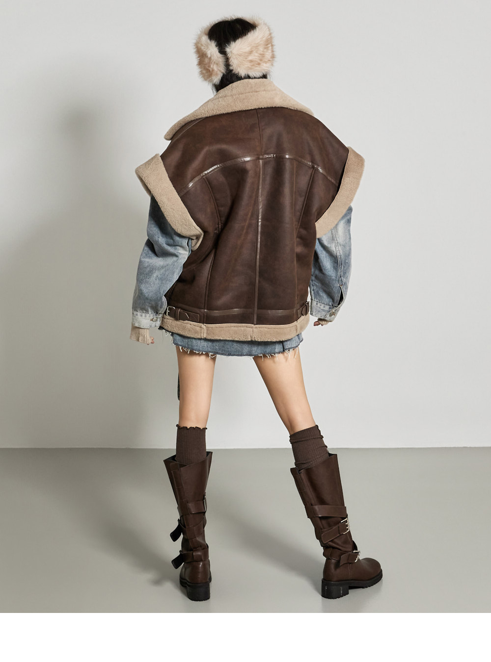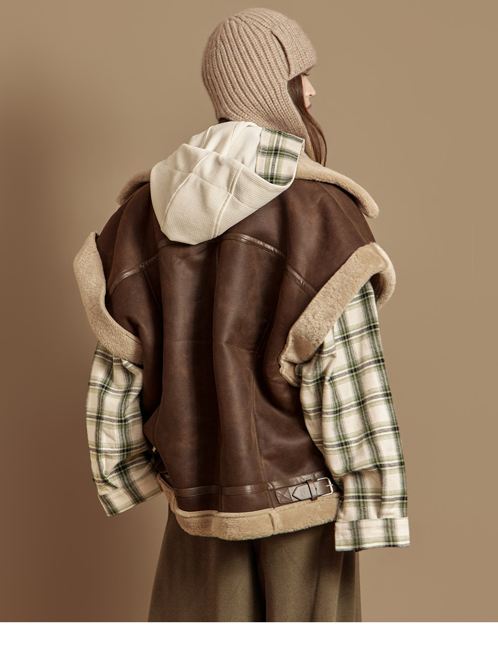 时尚氛围的麂皮毛绒马甲。 采用绒面质感的聚酯混纺材质制作,带来柔软温暖的穿着感,内里为仿毛绒衬里,增加舒适度。 高领设计,可搭配腰带闭合,兼顾保暖性与造型感。 宽松的oversize版型可与各种内搭轻松搭配,前侧拉链闭合及两侧口袋提升实用性。 作为单穿即可成为造型亮点的马甲,非常适合冬季叠搭穿搭。 模特身高171CM,ONE SIZE,穿棕色款。