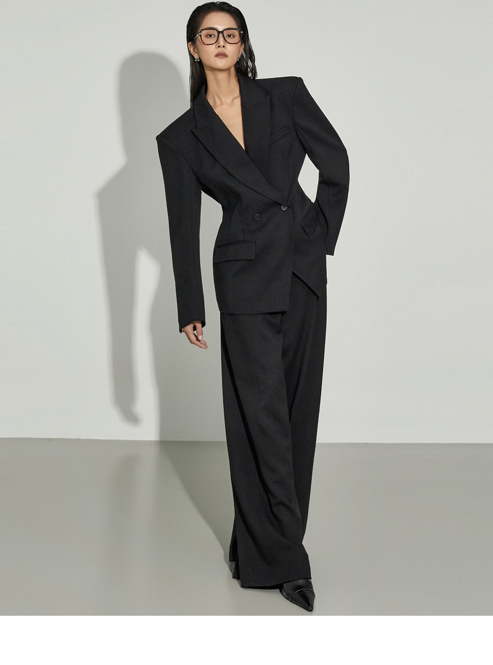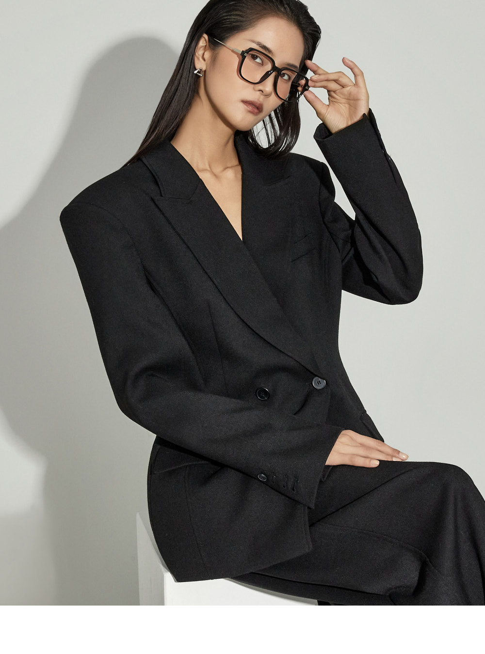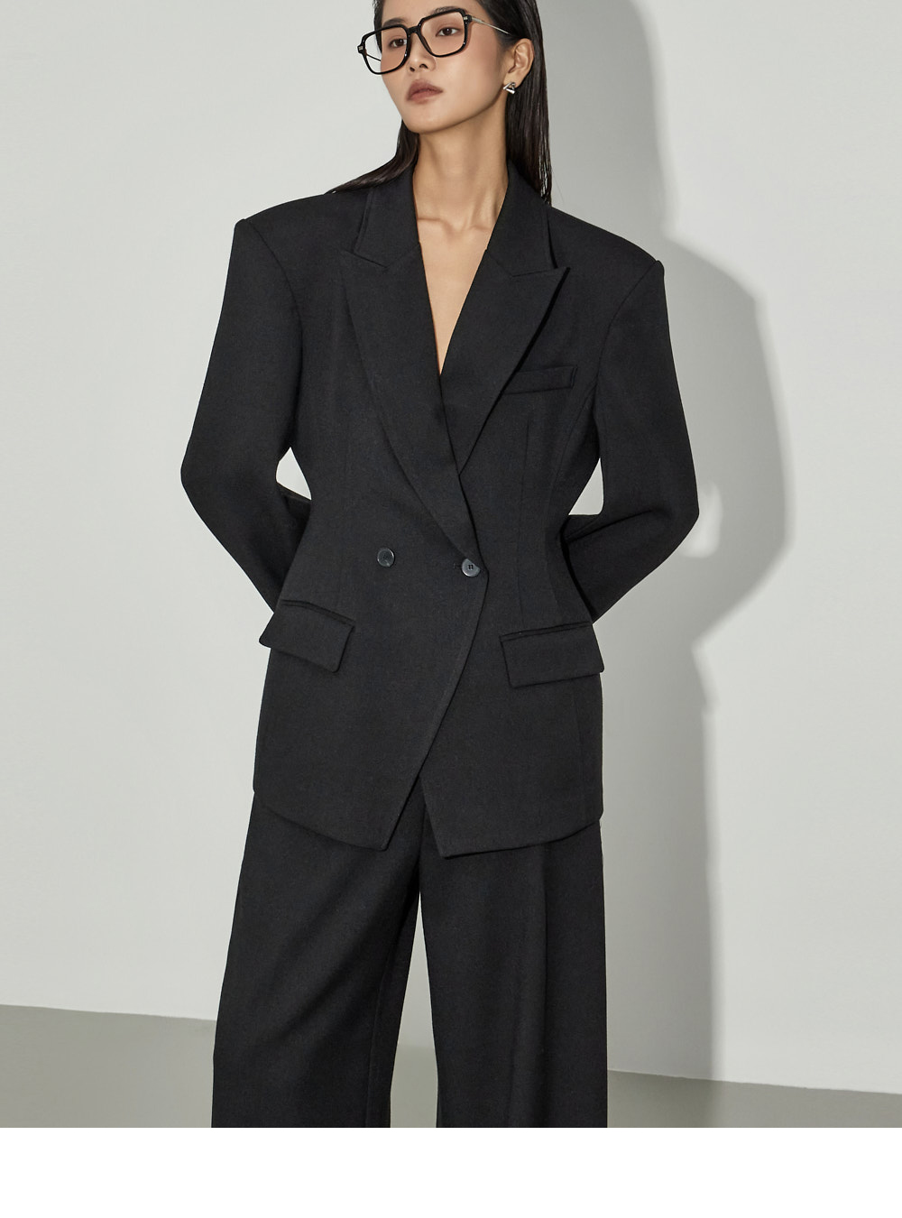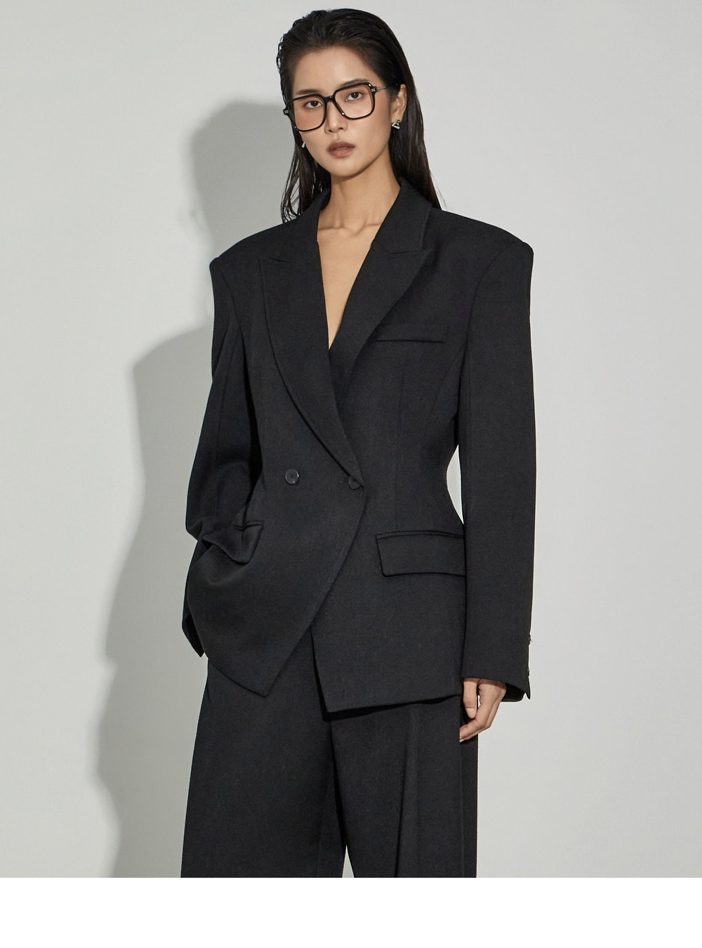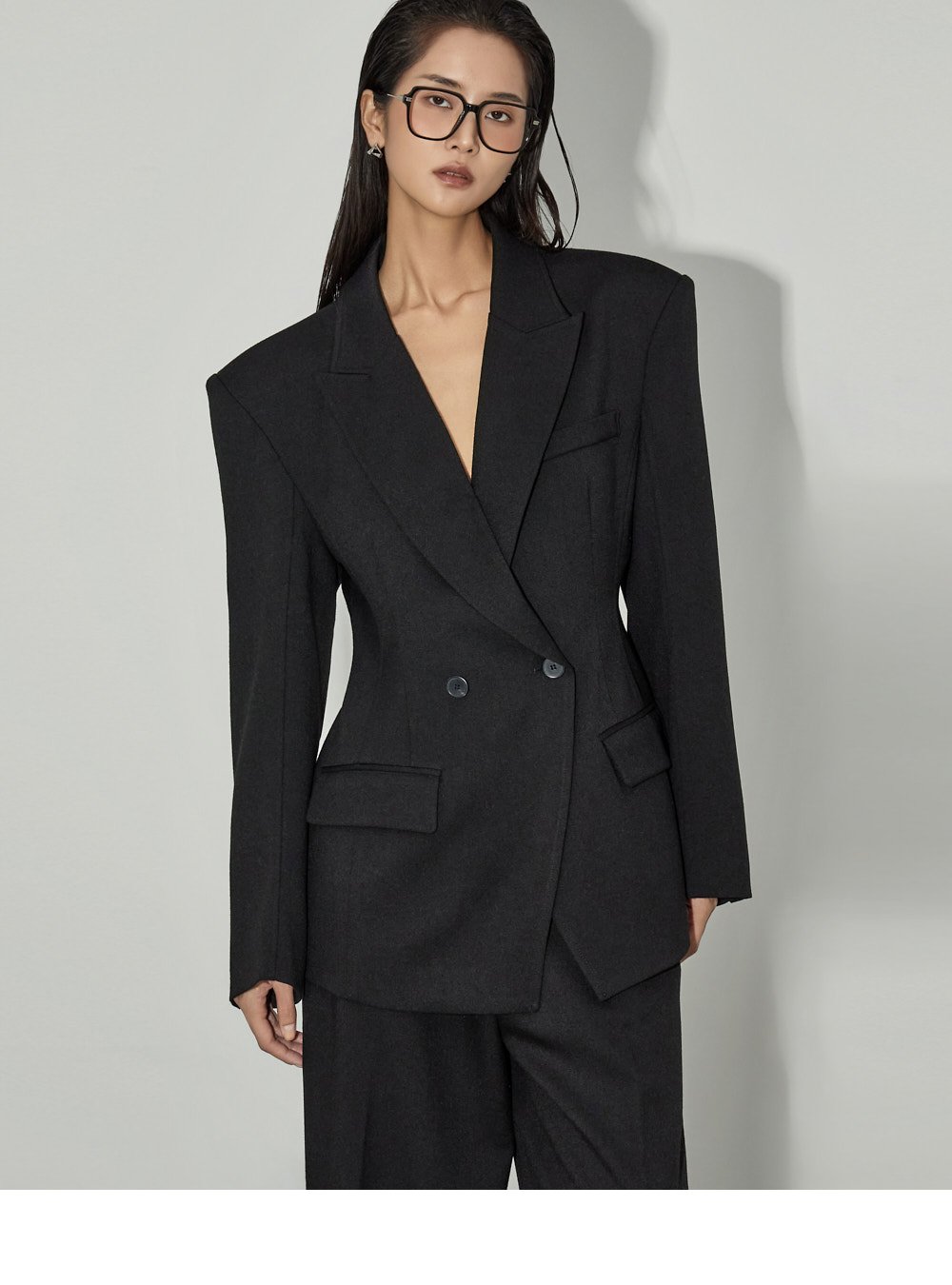 现代风格双扣垫肩西装外套。采用聚酯纤维、氨纶和人造丝混纺面料制成,兼具挺括与柔韧的穿着感,厚度适中,适合换季穿着。适度肩垫与修身版型勾勒干净利落的轮廓,前襟双扣设计与简洁细节营造端庄精致的印象。两侧口袋与胸部假口袋提升实用性与设计完整度,可轻松搭配西裤、半身裙或牛仔裤。171CM 模特穿 ONE 码,黑色。