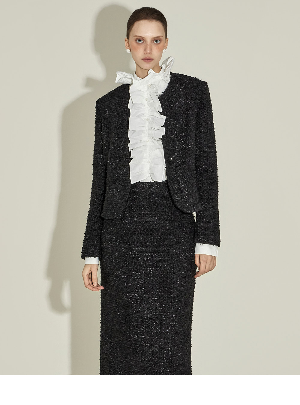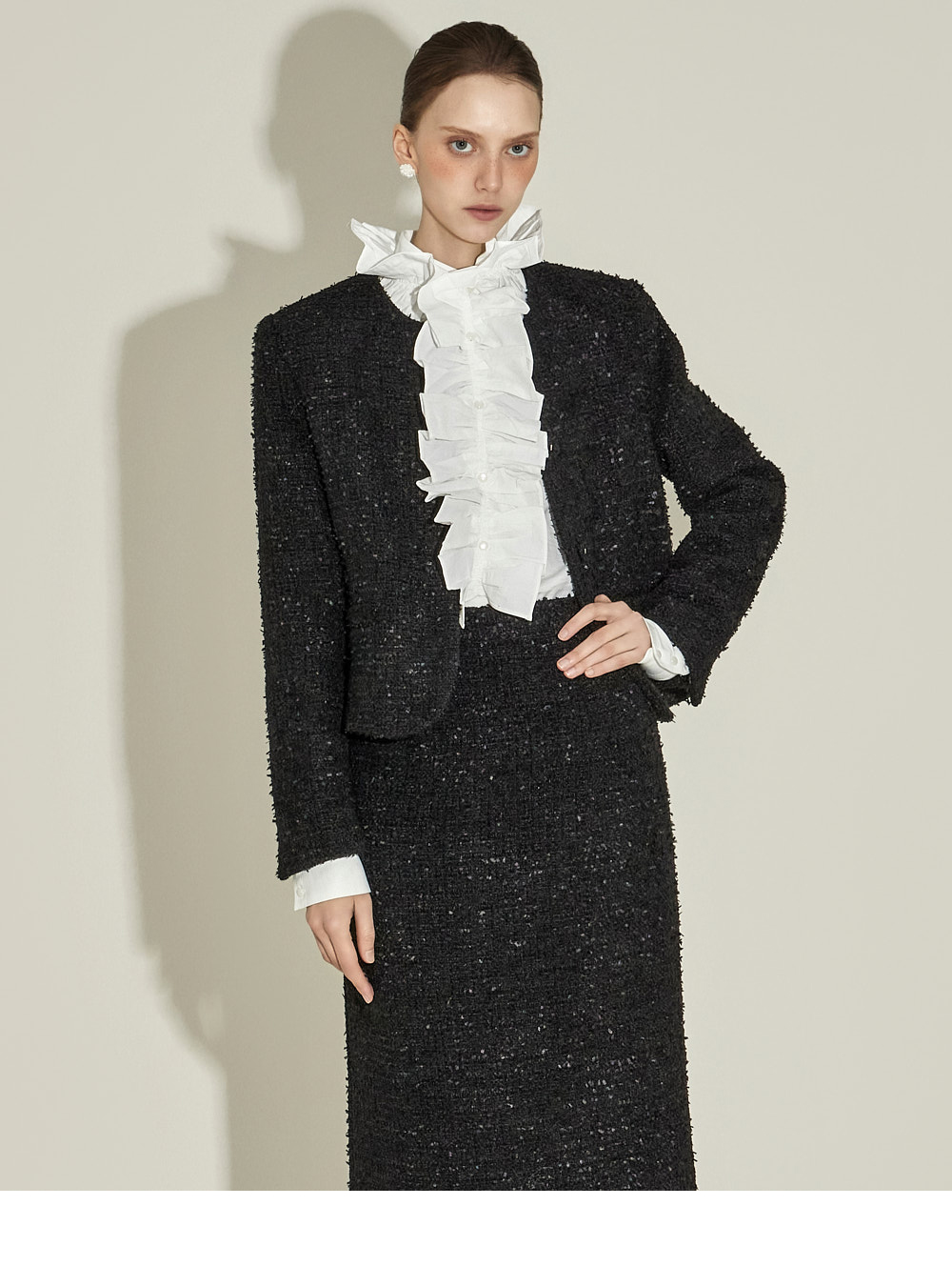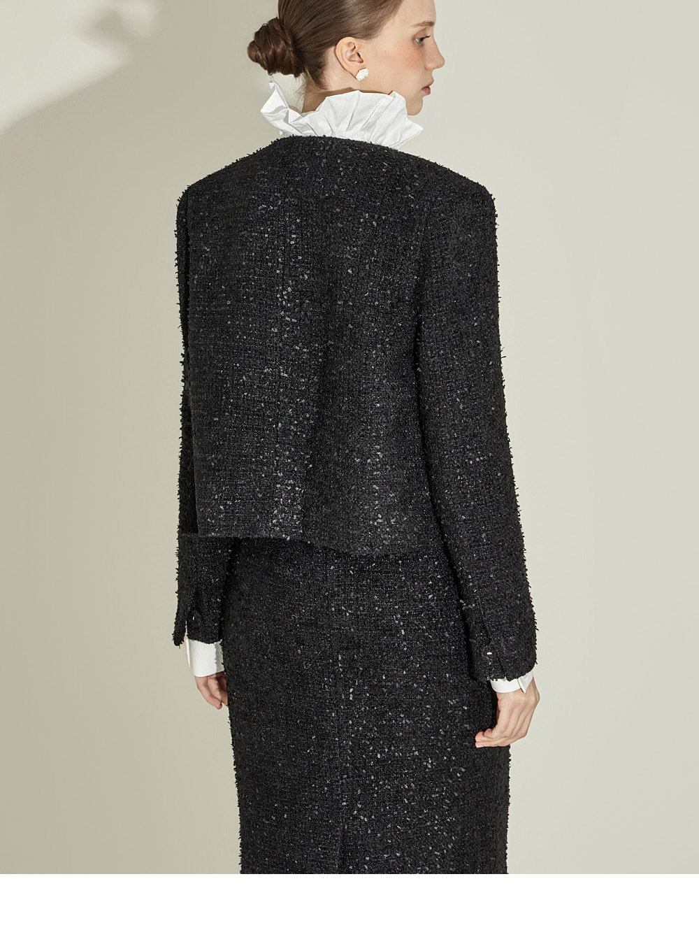 这是一款精致风格的粗花呢套装。 采用高级粗花呢面料,呈现经典且优雅的气质。 外套前排纽扣闭合,适中的肩垫设计以及全内衬打造稳固的轮廓。 半身裙为中长款 H 型版型,保持干练的线条,后开衩设计提升活动性,后拉链闭合与部分内衬提供舒适的穿着感,并配有两侧口袋增加实用性。 套装呈现女性化且精致的造型,适合参加婚宴、办公或其他正式场合。 174CM 模特上装穿 ONE 尺码,下装穿 S 尺码,颜色为 BLACK。