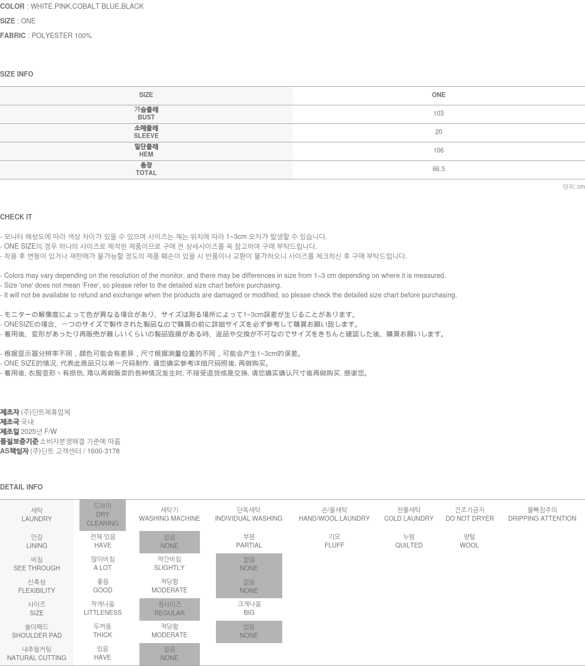 關於售後服務 瑕疵商品, 或是布料瑕疵、不正確標註的尺碼或質料, 引起的問題, 將會爲您進行修復/車縫 → 交換 → 退貨處理 (換貨與退貨的實際舉例, 請參考 ”換貨與退貨“ 與 “無法進行換貨與退貨的情況”之說明.) A/S負責人與連絡電話:DINT.Inc (gbcs_dint@naver.com)