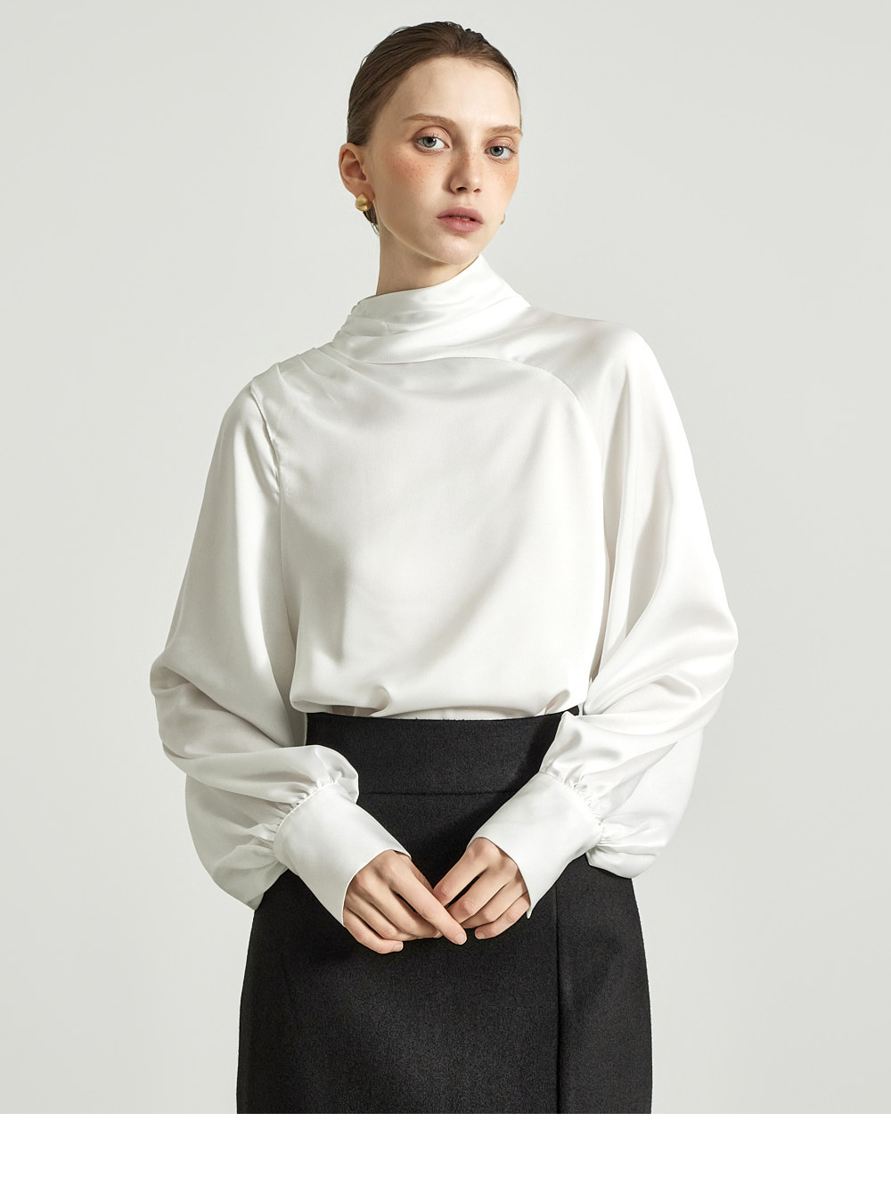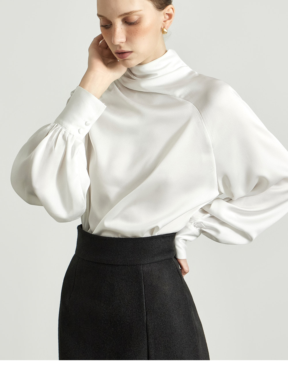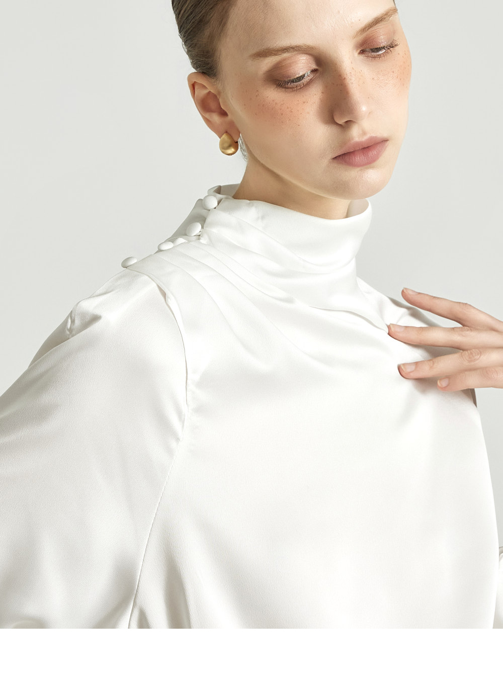 这是一款高雅氛围感十足的缎面衬衫。 采用微光泽的缎面面料制成,呈现高贵而精致的气质。 肩部纽扣设计自然形成皱褶的领口,塑造优雅轮廓,袖口的皱褶细节增添女性魅力。 轻盈柔软的材质提供舒适穿着感,既可单穿,也可作为各种外套内搭。 优雅且女性化的造型适合办公场合、出席婚宴等正式场合。 174CM 模特穿着 ONE 尺码,颜色为 WHITE。