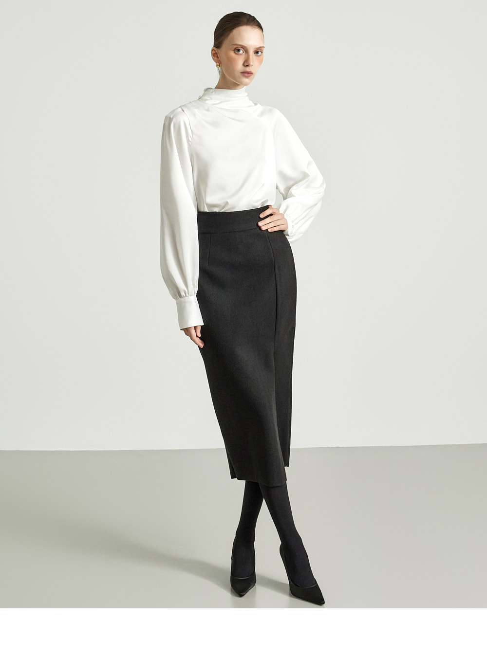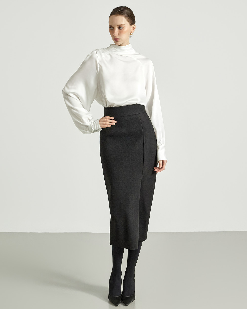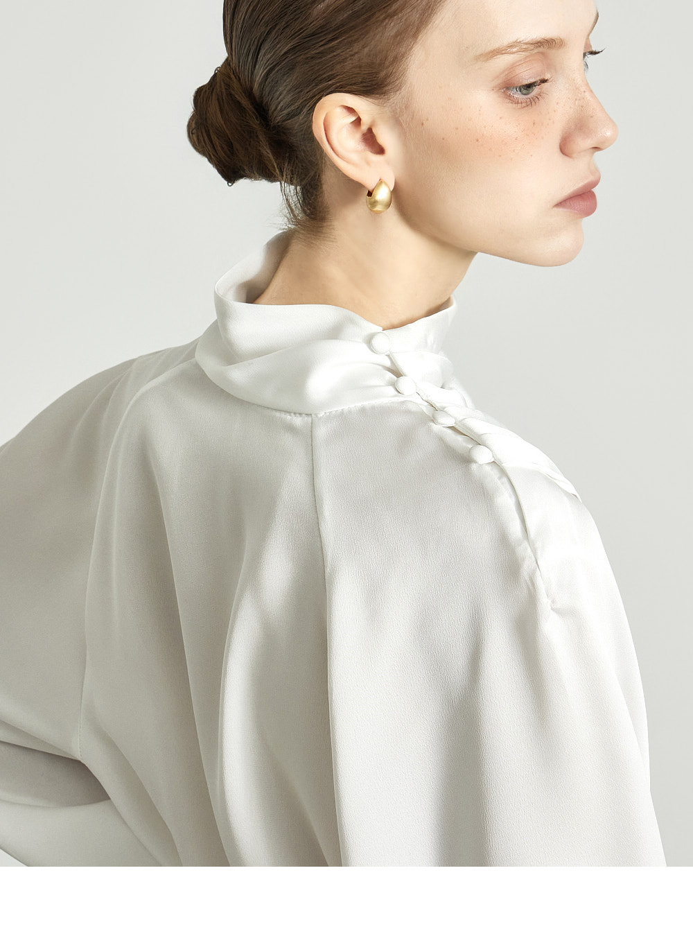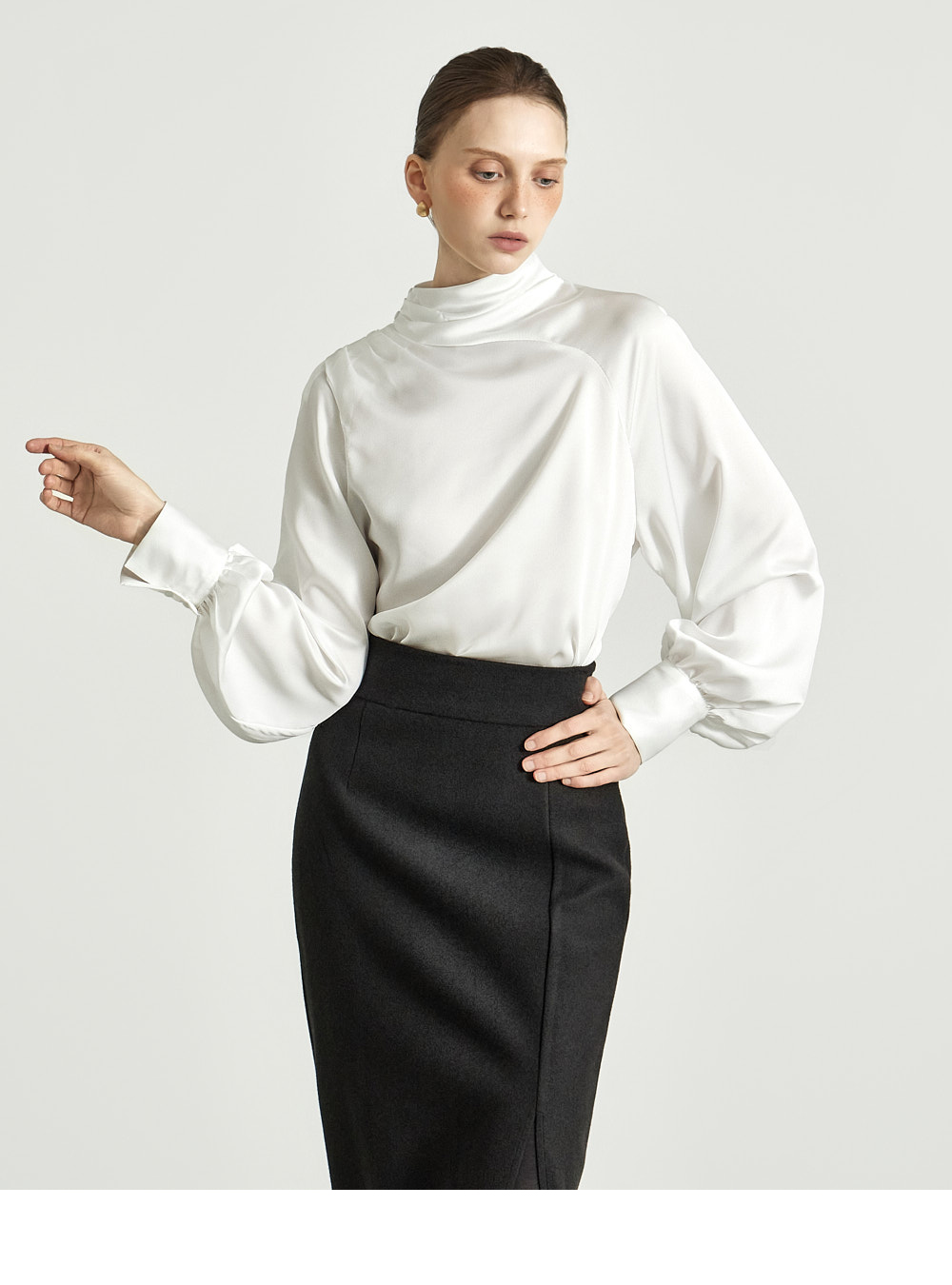 这是一款高雅氛围感十足的缎面衬衫。 采用微光泽的缎面面料制成,呈现高贵而精致的气质。 肩部纽扣设计自然形成皱褶的领口,塑造优雅轮廓,袖口的皱褶细节增添女性魅力。 轻盈柔软的材质提供舒适穿着感,既可单穿,也可作为各种外套内搭。 优雅且女性化的造型适合办公场合、出席婚宴等正式场合。 174CM 模特穿着 ONE 尺码,颜色为 WHITE。