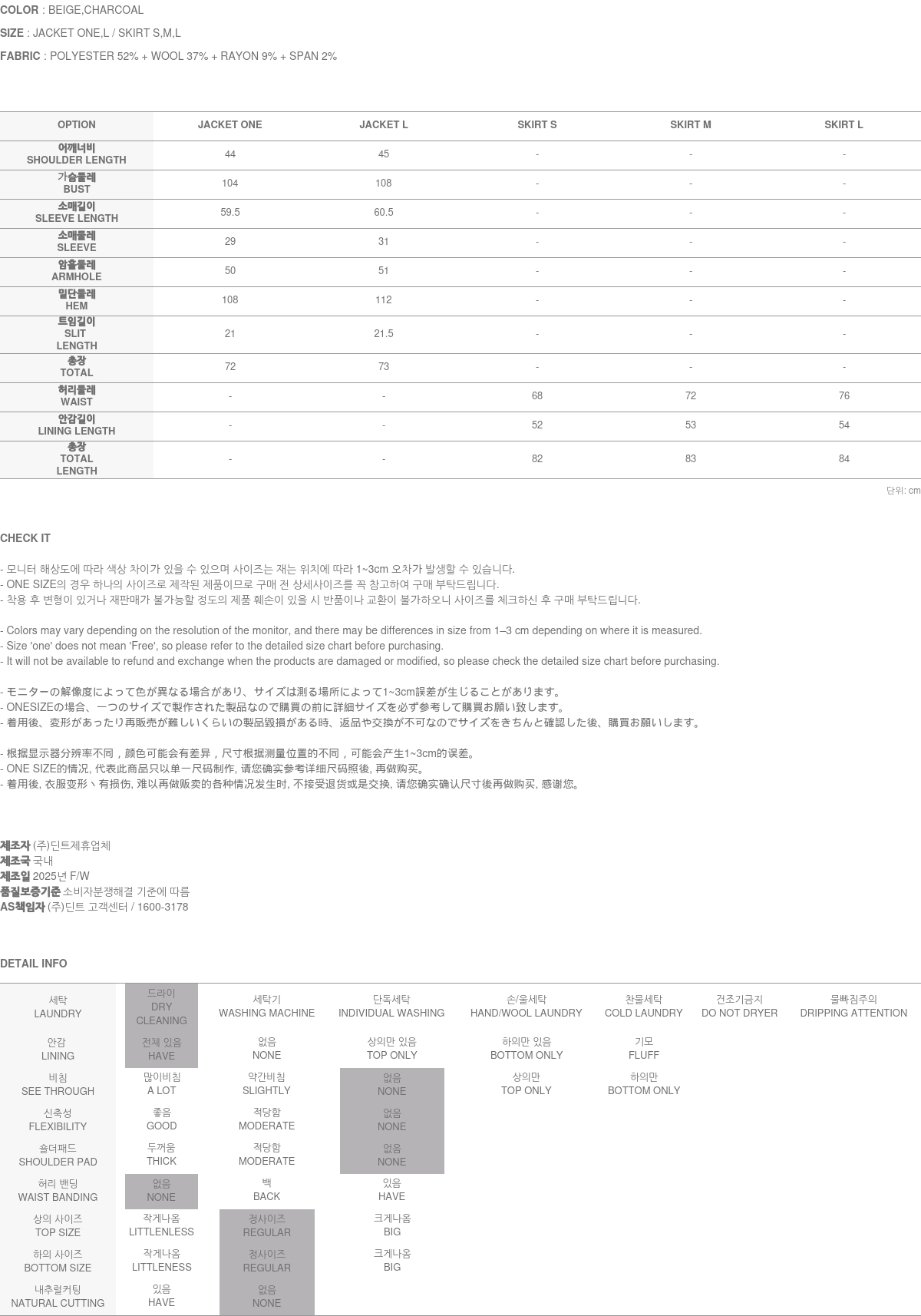 采用聚酯纤维、羊毛、人造丝和氨纶混纺面料制作,既挺括又富有弹性,上衣为 ONE、L 码,下装为 S、M、L 码,可根据体型选择合适尺寸。