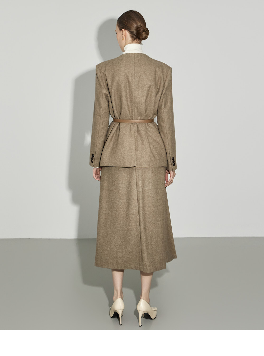 裙子为中长款,增添干练气质,百褶设计带来自然的蓬松感,背部拉链设计和部分内衬增加实用性。
