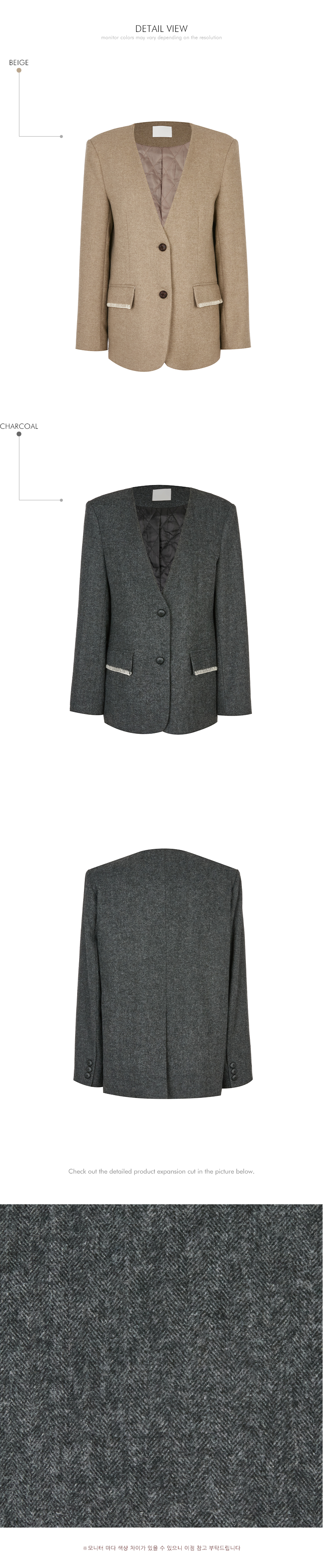 夹克采用人字纹图案,呈现高雅且精致的视觉效果,修身的腰线突显女性化曲线,整体绗缝内衬提升保暖性,无领设计便于搭配各种内搭。