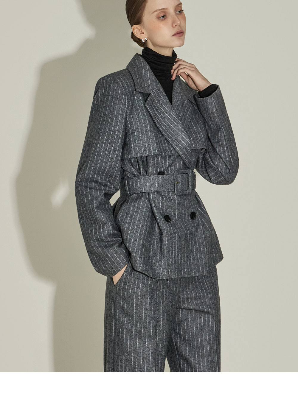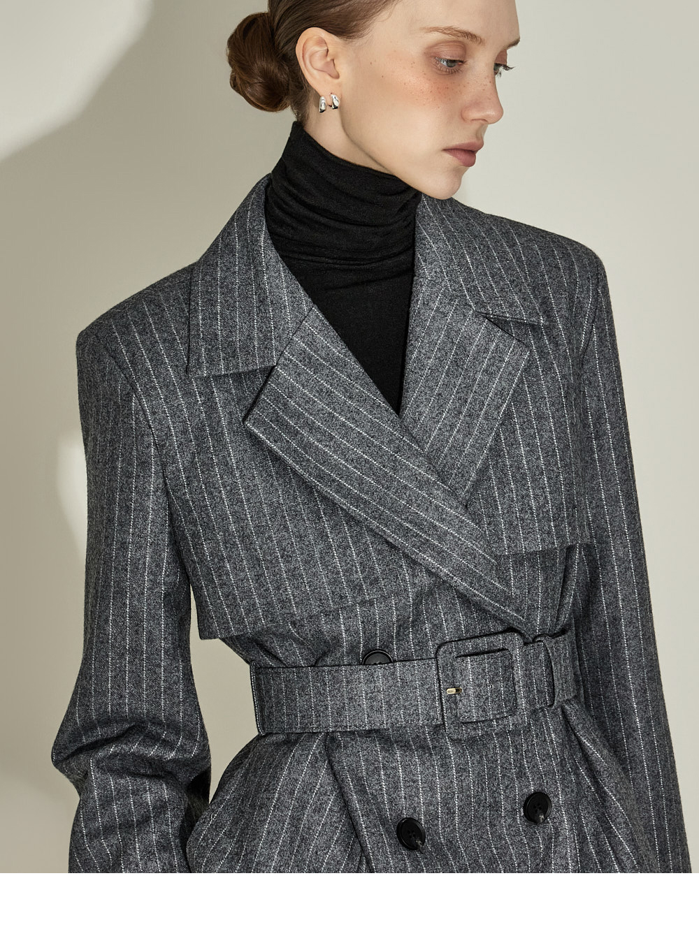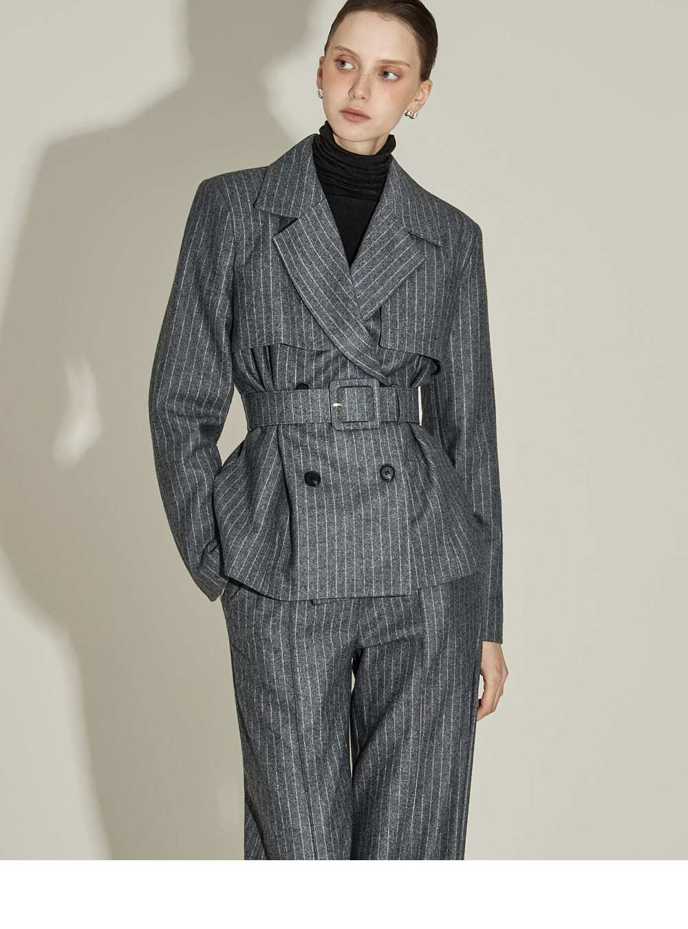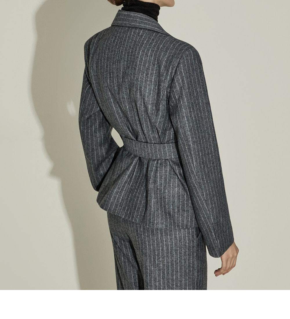 采用聚酯纤维与羊毛混纺面料制作,既挺括又富有弹性,条纹图案增添现代感与精致氛围。
