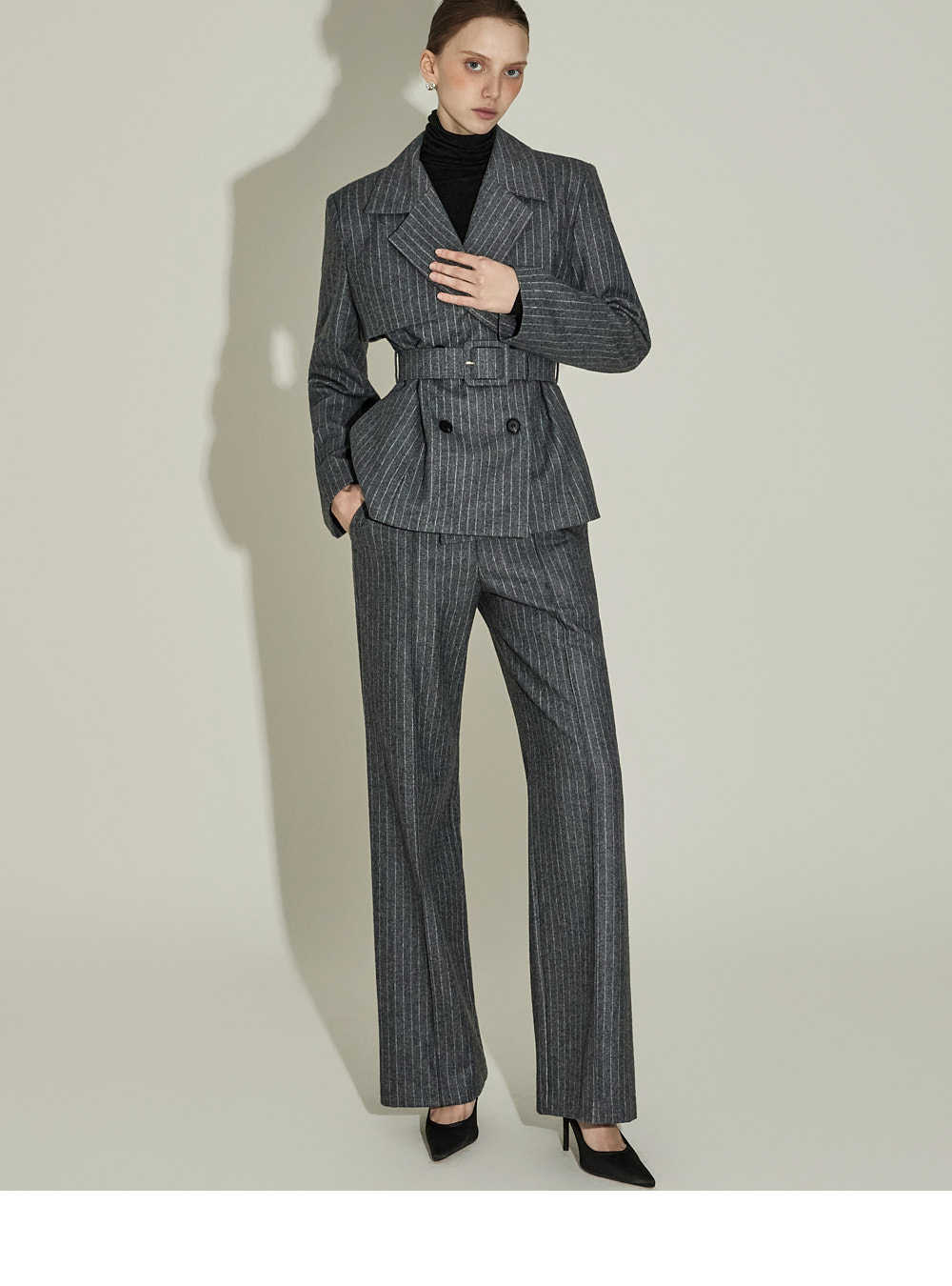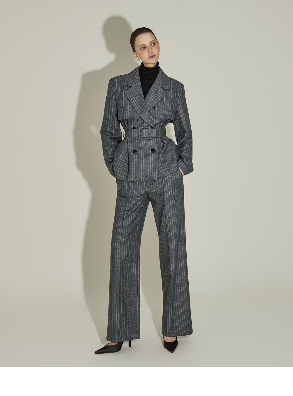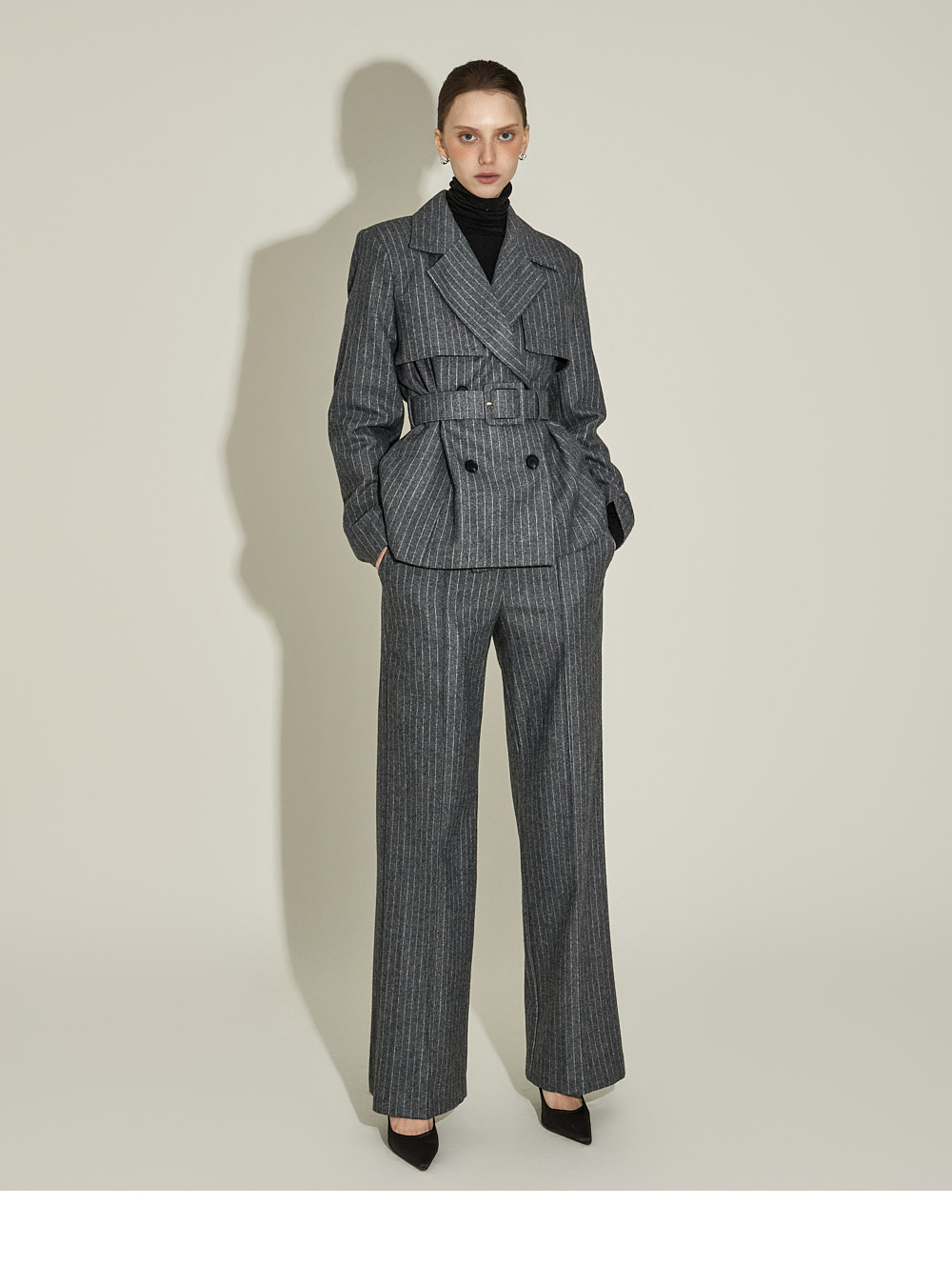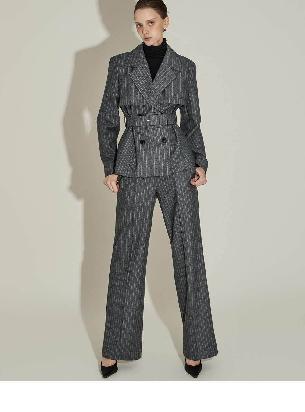 采用聚酯纤维与羊毛混纺面料制作,既挺括又富有弹性,条纹图案增添现代感与精致氛围。