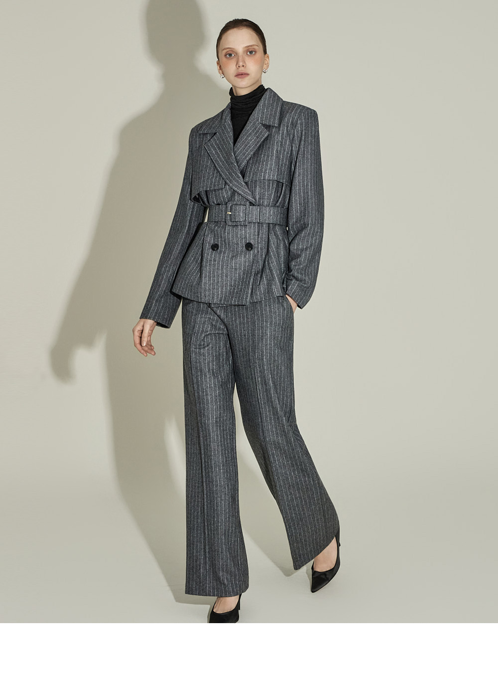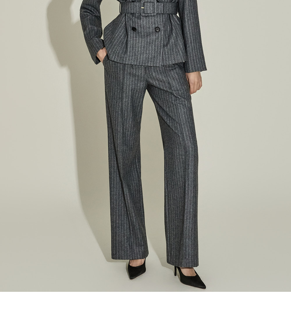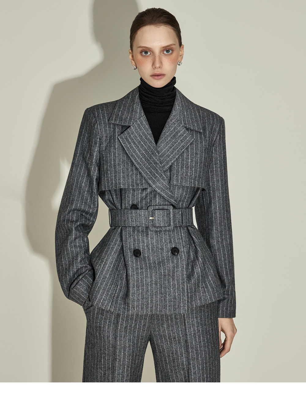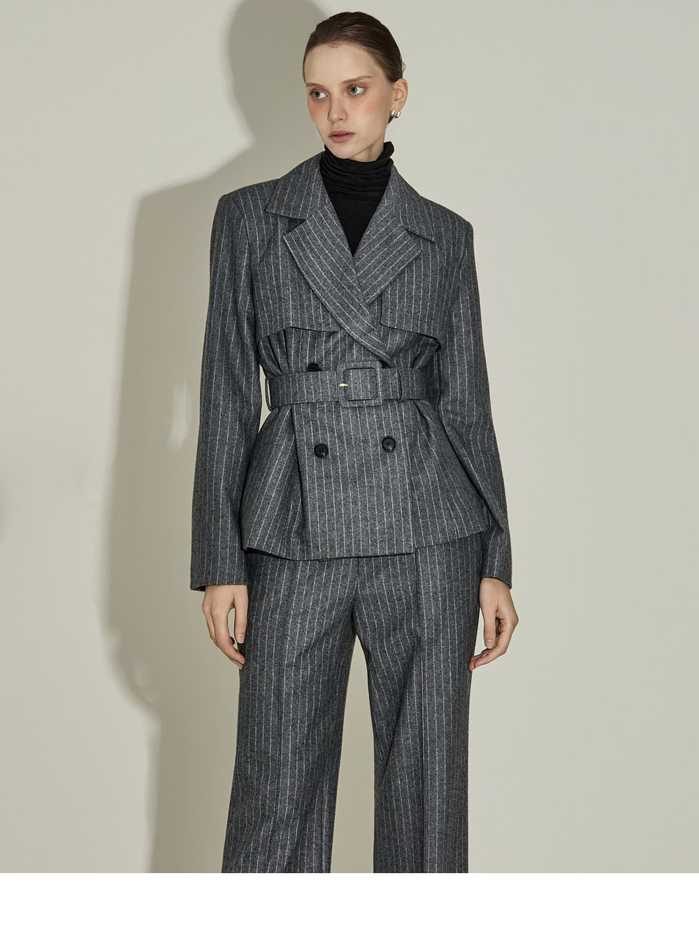 现代感十足的西装套装(夹克+西裤)。 采用聚酯纤维与羊毛混纺面料制作,兼具挺括感与柔韧性,细腻的条纹图案增添现代气息。 夹克为修身风格的风衣款式,配有翻领和腰带套装设计,可收紧腰线,塑造女性化且立体的剪裁效果。前襟纽扣及两侧口袋提升实用性,适中的肩垫让肩线更为稳固。 西裤为高腰设计,修身剪裁修饰腿部线条,侧边拉链与口袋设计简洁实用。 整套搭配可呈现精致的现代感造型,非常适合正式场合或办公穿着。 174CM 模特,夹克 ONE 码 / 西裤 S 码,灰色。