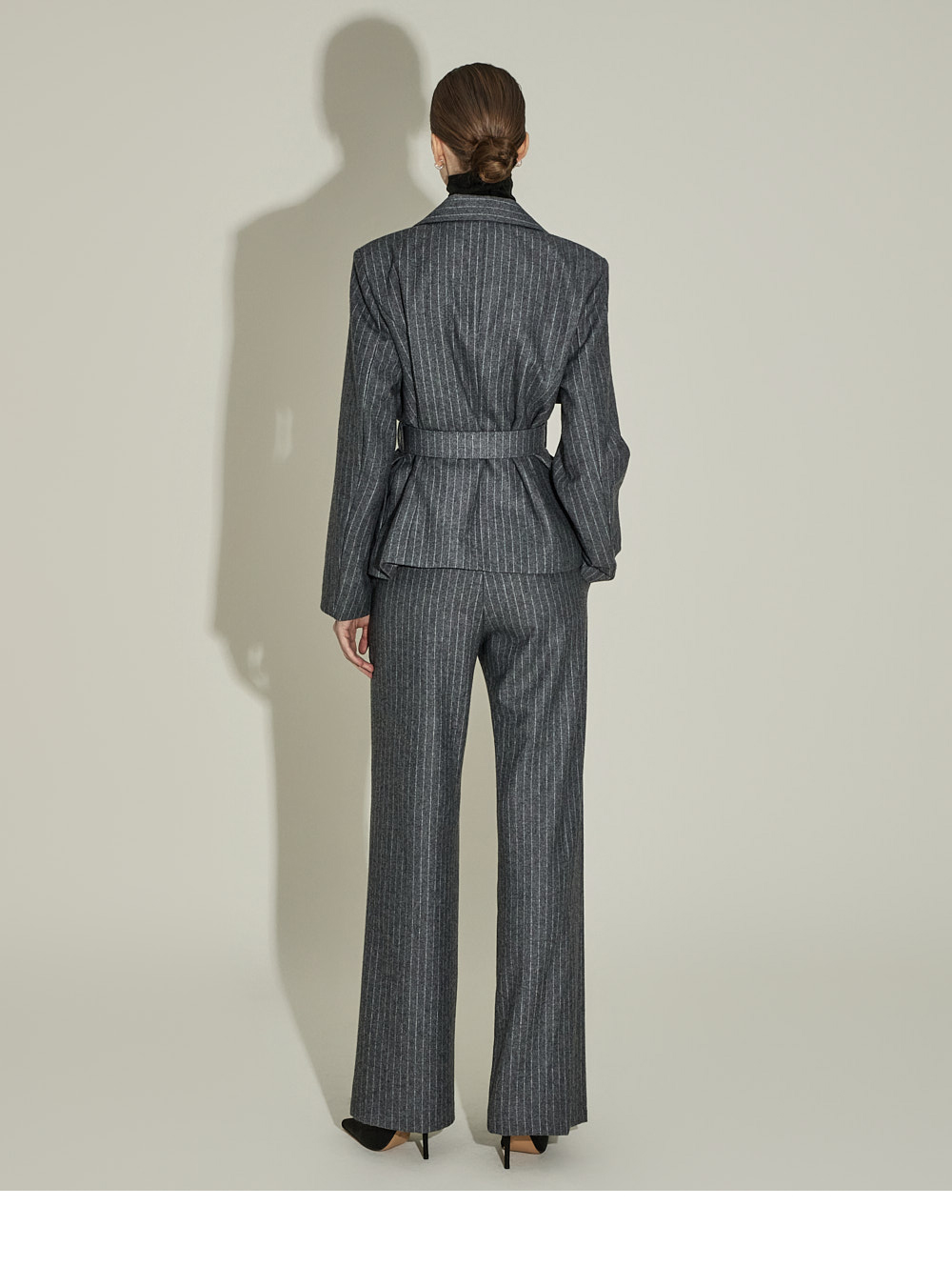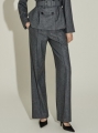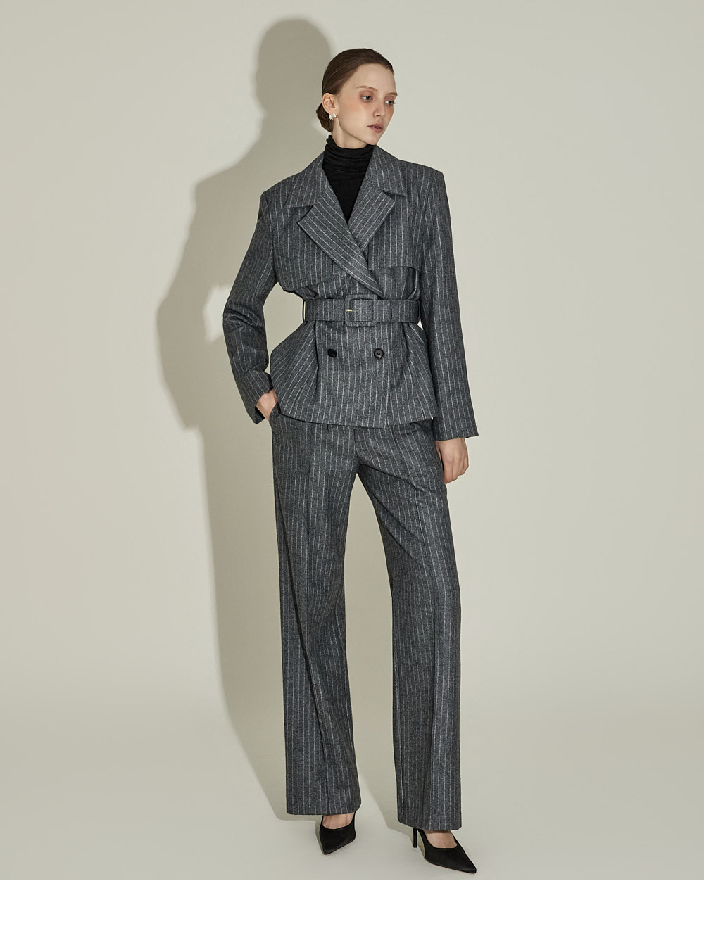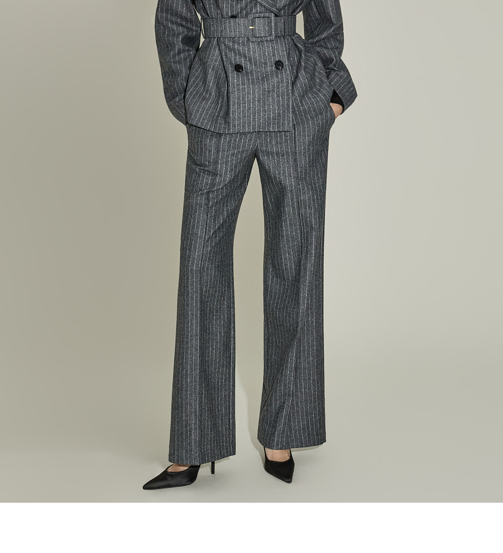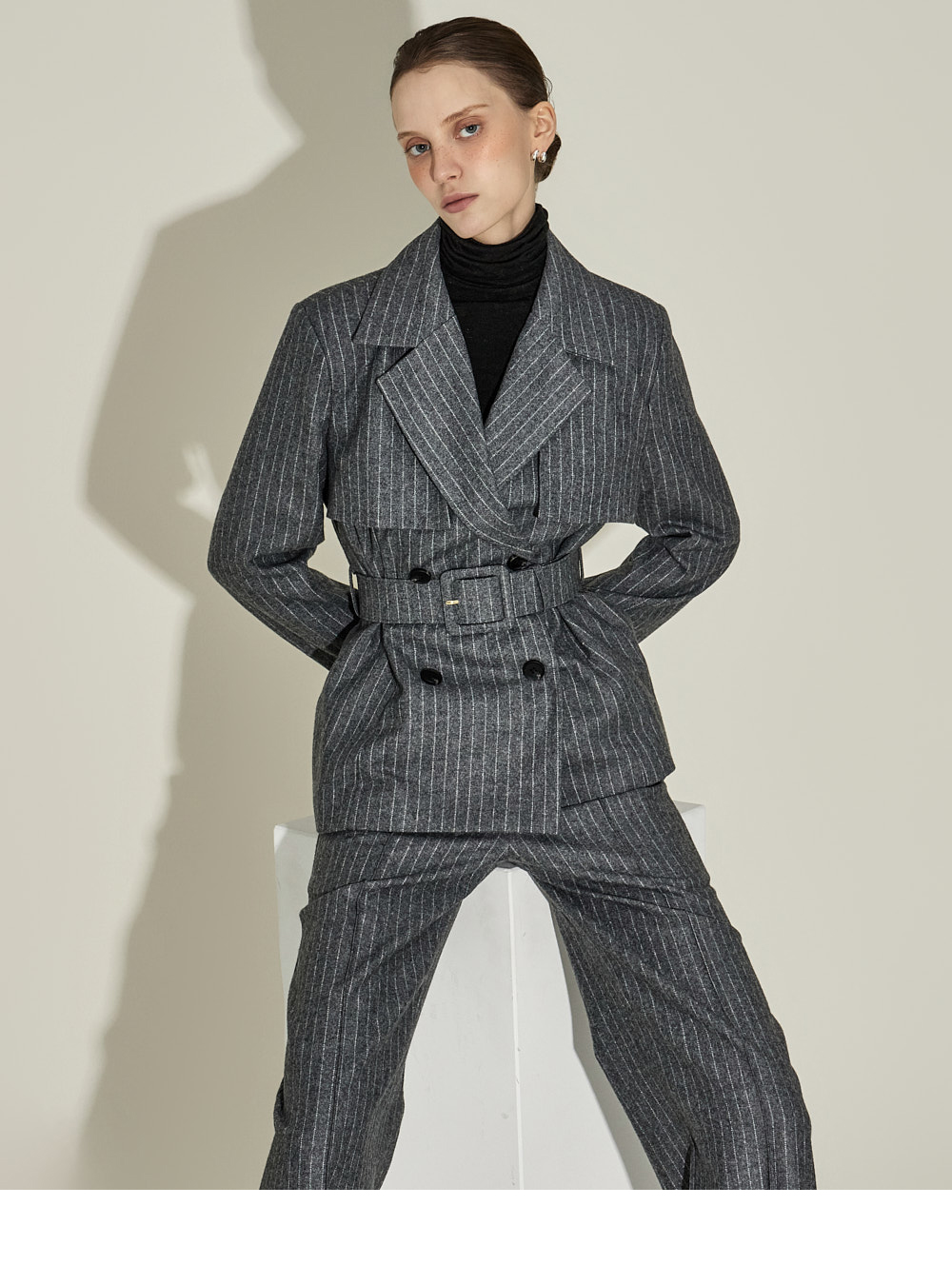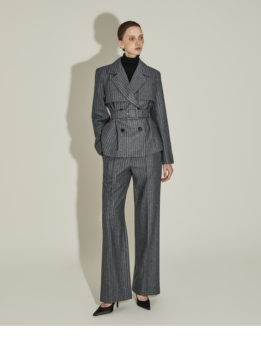 现代感十足的西装套装(夹克+西裤)。 采用聚酯纤维与羊毛混纺面料制作,兼具挺括感与柔韧性,细腻的条纹图案增添现代气息。 夹克为修身风格的风衣款式,配有翻领和腰带套装设计,可收紧腰线,塑造女性化且立体的剪裁效果。前襟纽扣及两侧口袋提升实用性,适中的肩垫让肩线更为稳固。 西裤为高腰设计,修身剪裁修饰腿部线条,侧边拉链与口袋设计简洁实用。 整套搭配可呈现精致的现代感造型,非常适合正式场合或办公穿着。 174CM 模特,夹克 ONE 码 / 西裤 S 码,灰色。