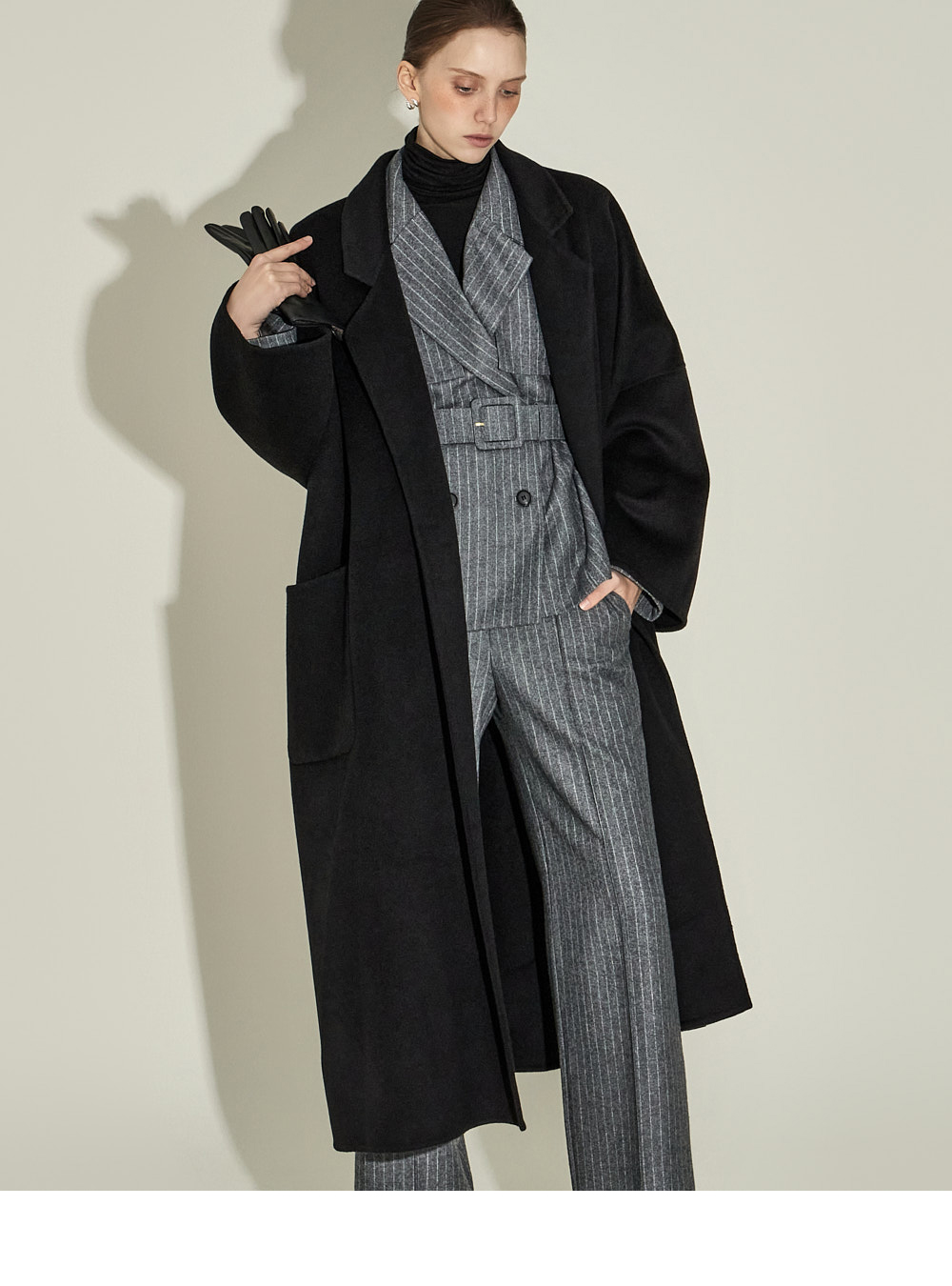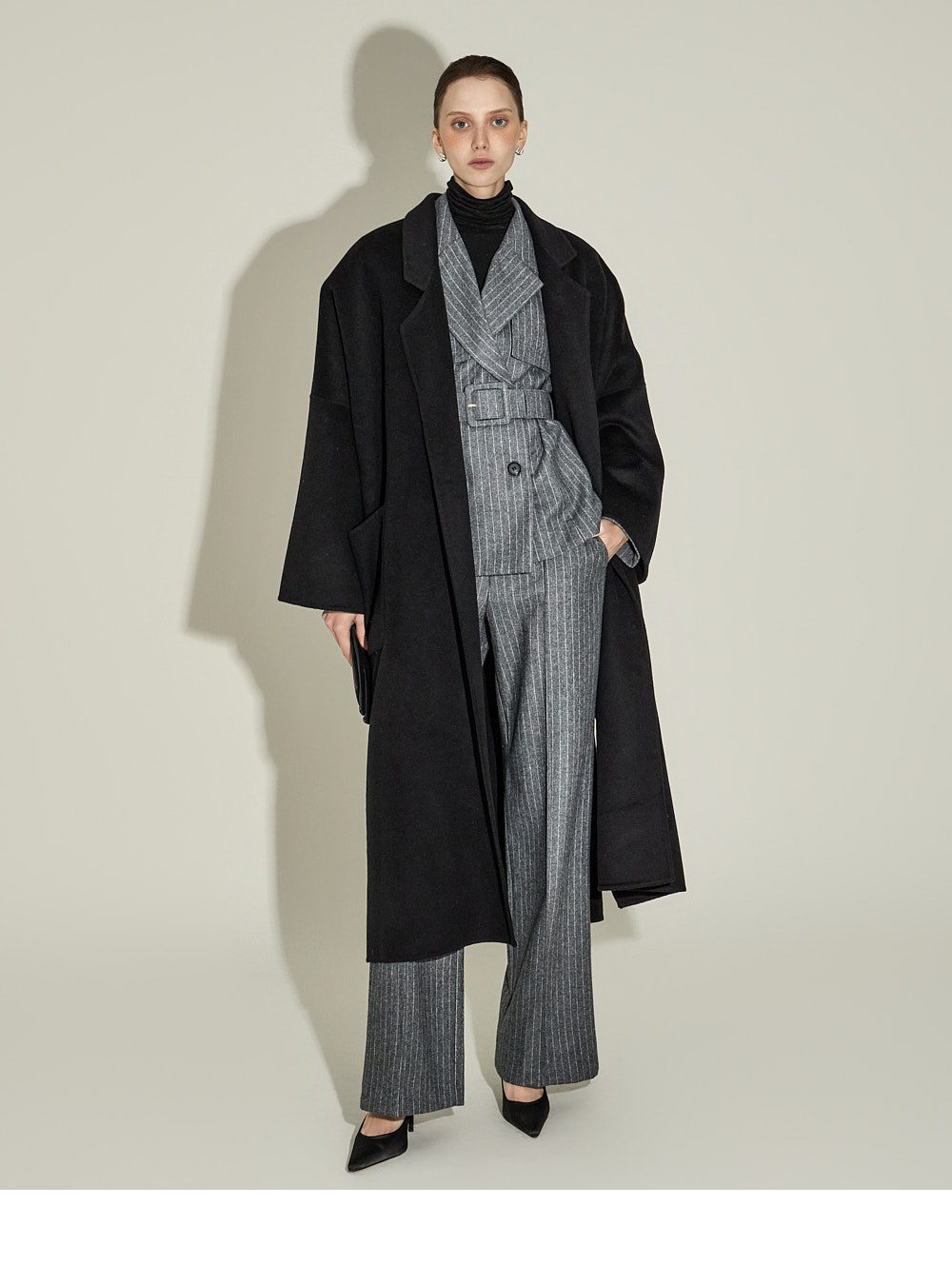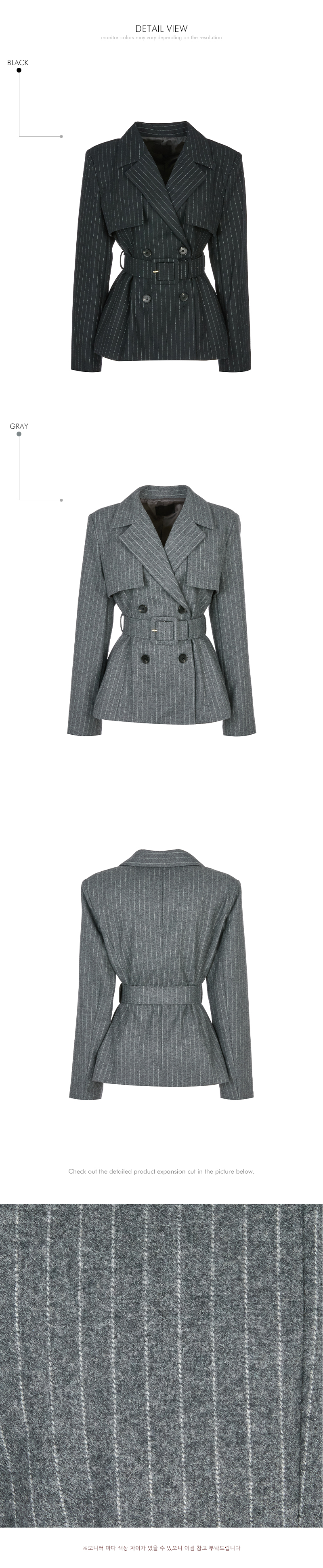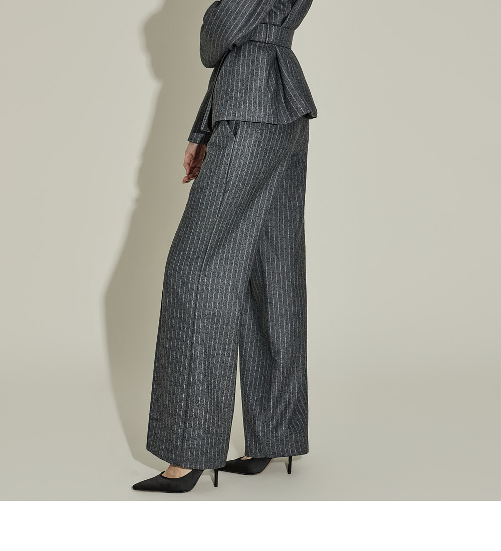现代感十足的西装套装(夹克+西裤)。 采用聚酯纤维与羊毛混纺面料制作,兼具挺括感与柔韧性,细腻的条纹图案增添现代气息。 夹克为修身风格的风衣款式,配有翻领和腰带套装设计,可收紧腰线,塑造女性化且立体的剪裁效果。前襟纽扣及两侧口袋提升实用性,适中的肩垫让肩线更为稳固。 西裤为高腰设计,修身剪裁修饰腿部线条,侧边拉链与口袋设计简洁实用。 整套搭配可呈现精致的现代感造型,非常适合正式场合或办公穿着。 174CM 模特,夹克 ONE 码 / 西裤 S 码,灰色。