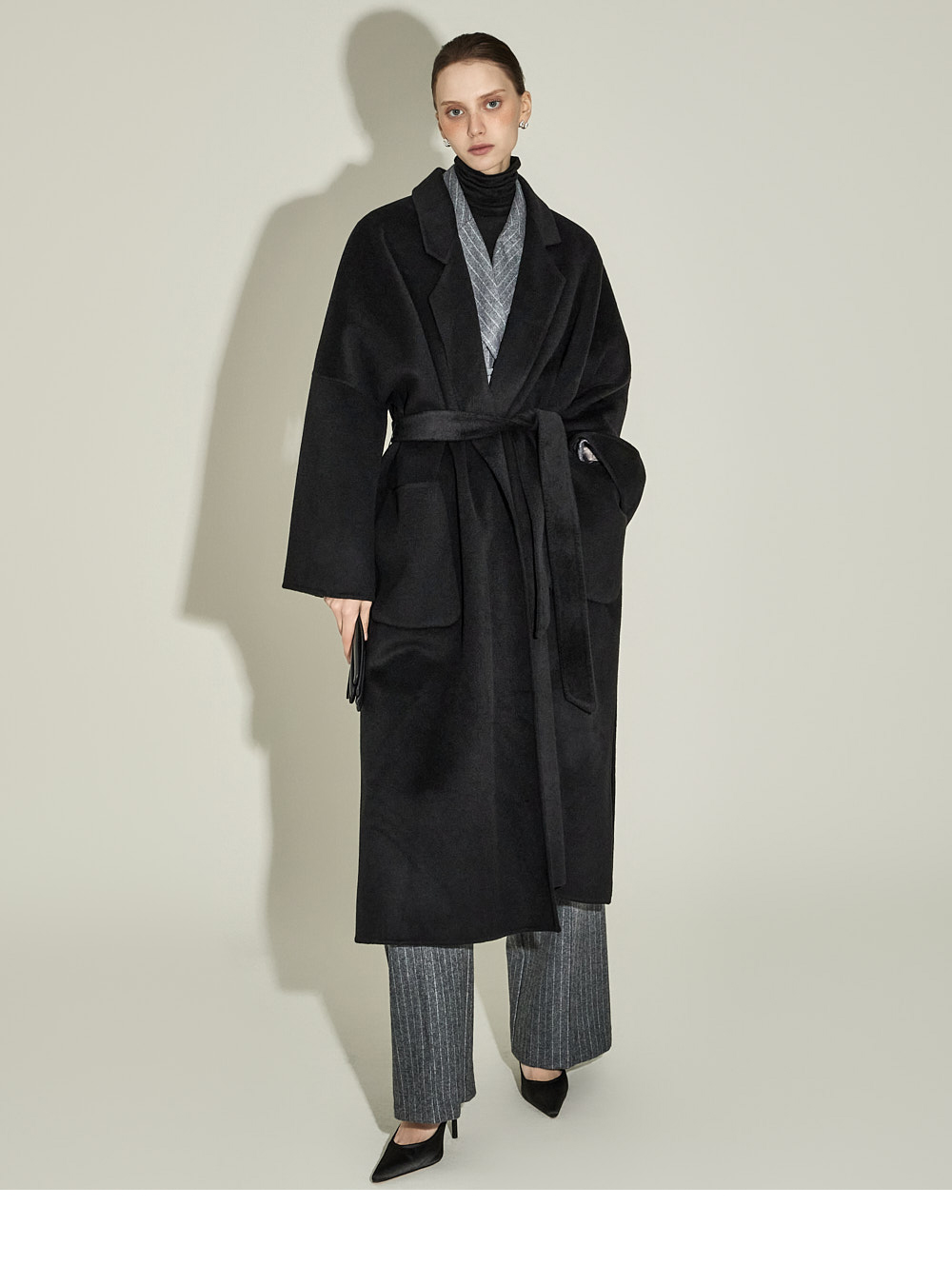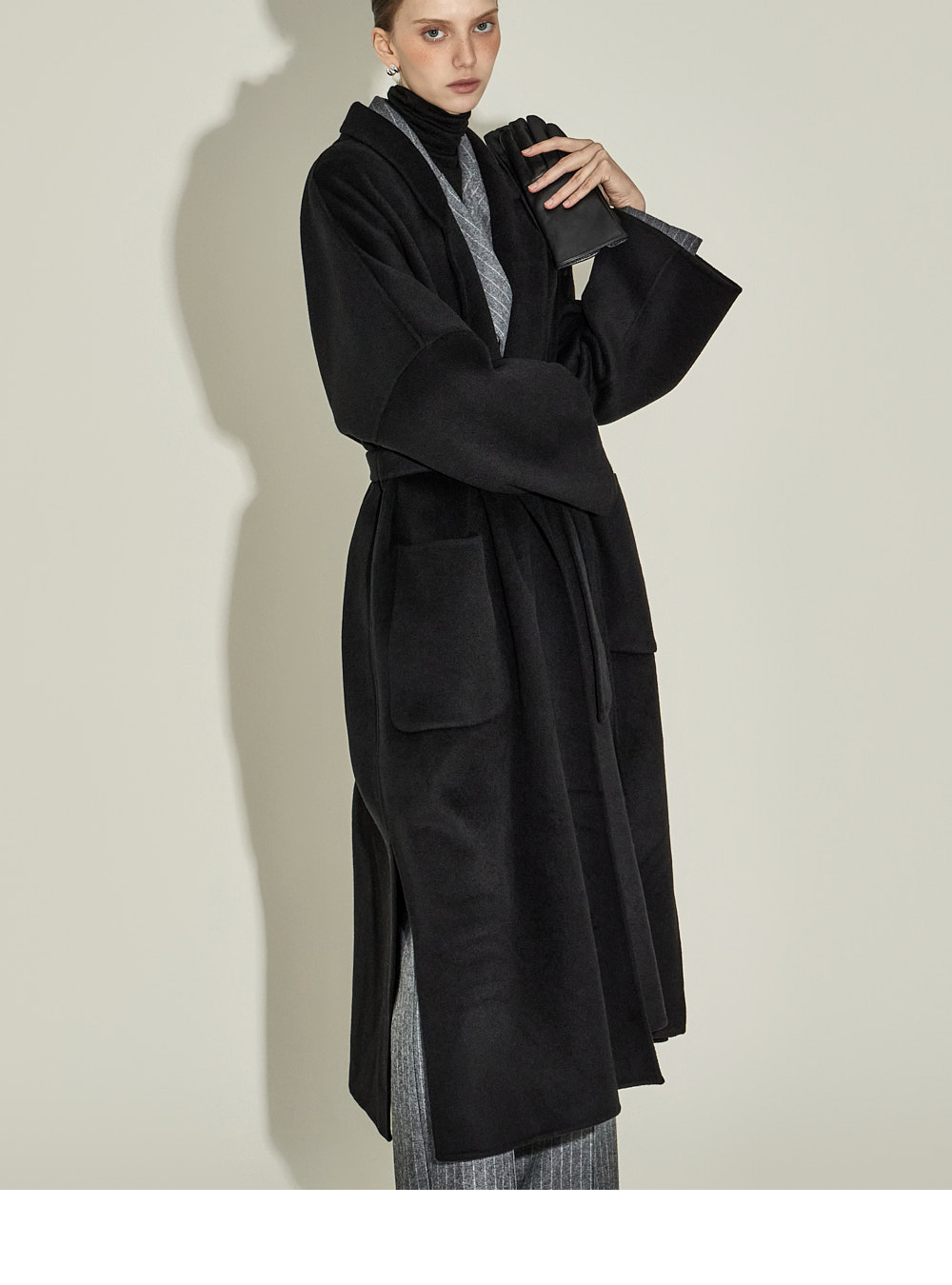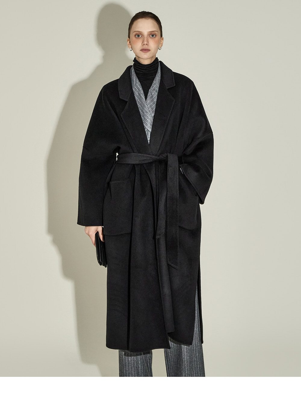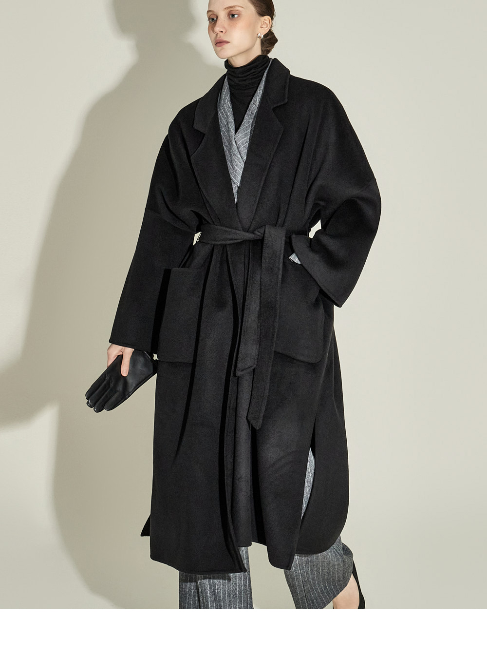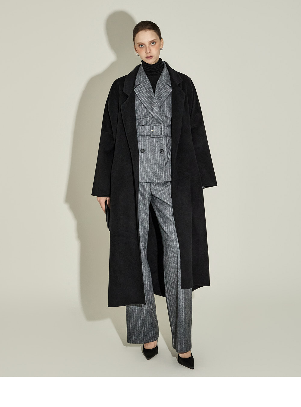 现代感十足的西装套装(夹克+西裤)。 采用聚酯纤维与羊毛混纺面料制作,兼具挺括感与柔韧性,细腻的条纹图案增添现代气息。 夹克为修身风格的风衣款式,配有翻领和腰带套装设计,可收紧腰线,塑造女性化且立体的剪裁效果。前襟纽扣及两侧口袋提升实用性,适中的肩垫让肩线更为稳固。 西裤为高腰设计,修身剪裁修饰腿部线条,侧边拉链与口袋设计简洁实用。 整套搭配可呈现精致的现代感造型,非常适合正式场合或办公穿着。 174CM 模特,夹克 ONE 码 / 西裤 S 码,灰色。